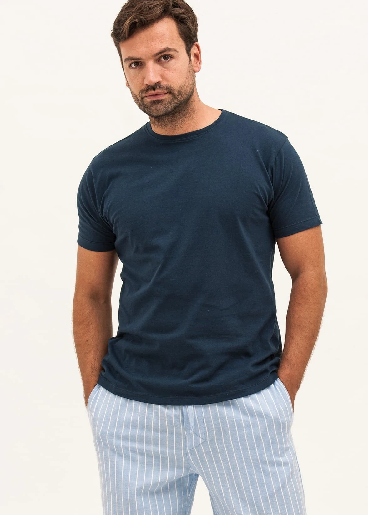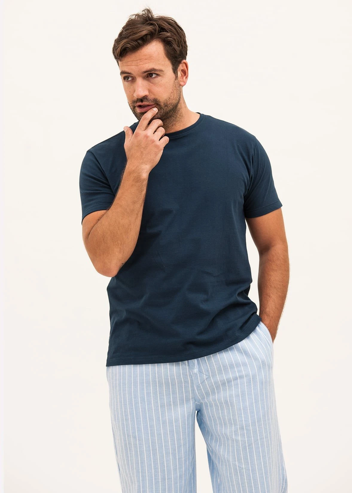 Men’s straight leg pyjama bottoms in a warm blue and white herringbone stripe. Like all of our men’s pjs, this quality brushed cotton pair is available in two leg lengths; regular and tall size which fits an inside leg of up to 36″. Other matching nightwear items available in this fabric, including the women’s and children’s collections. Pair them with our navy or white luxury plain t-shirts.