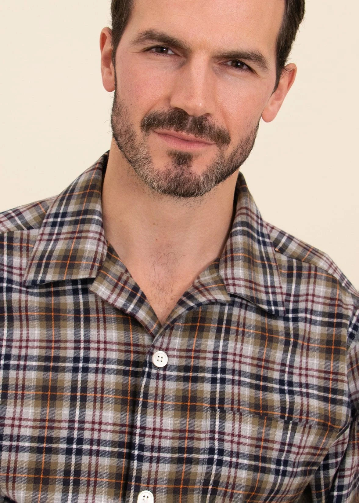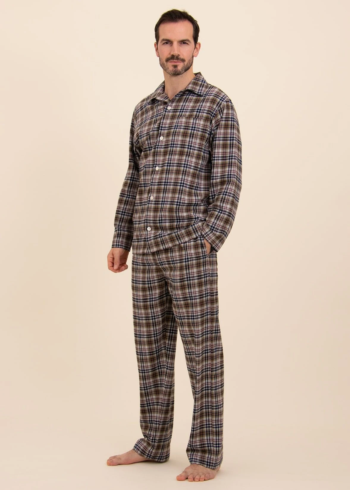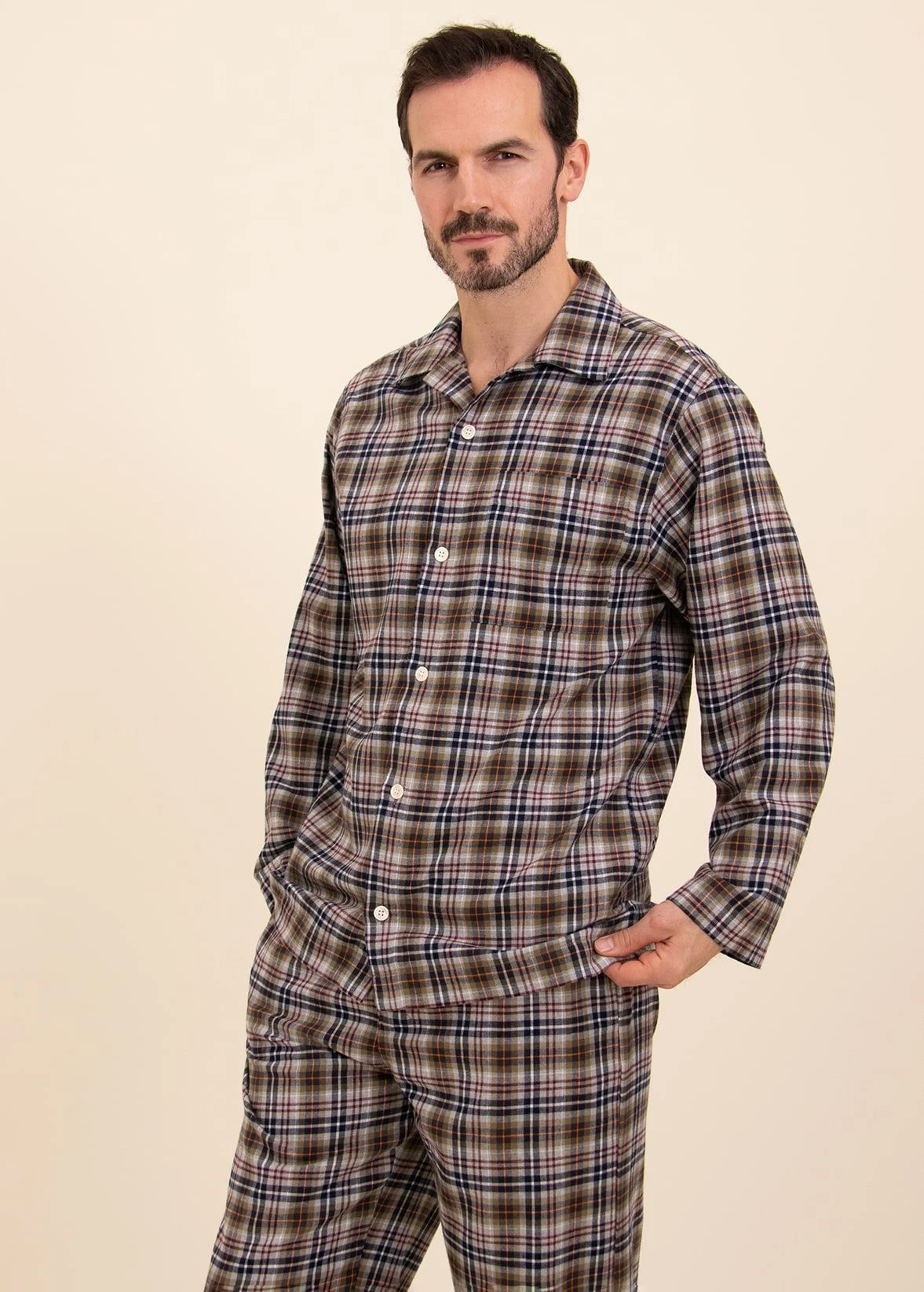 Men’s British made brushed cotton pyjamas. This intricate tartan features grey, blue, green, brick red and finished with a touch of orange. Available in regular and tall leg sizes. Pyjama bottoms also sold separately for those not needing the jacket.