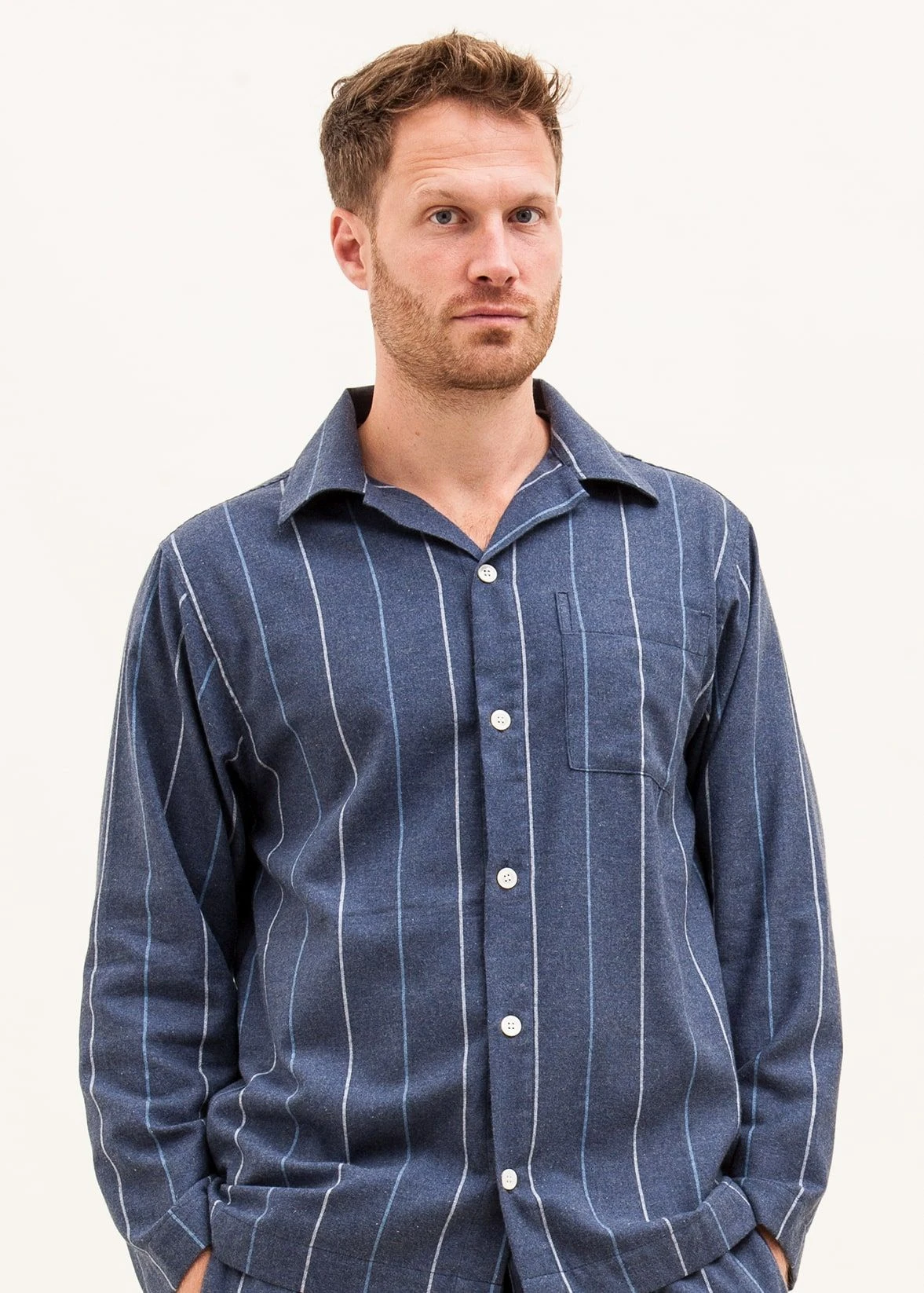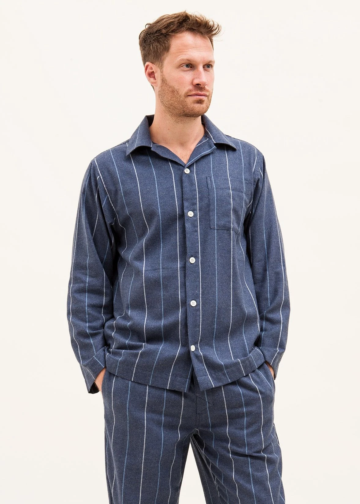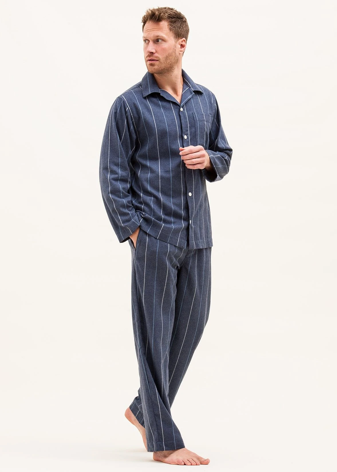 Men’s quality brushed cotton pyjamas in a stylish blue stripe. Available in regular and tall sizes. The tall sizes gives you two extra inches on the leg length and an extra inch on the sleeves and jacket length. This fabric is also available in pyjama bottoms, pj shorts, dressing gown and a nightshirt.