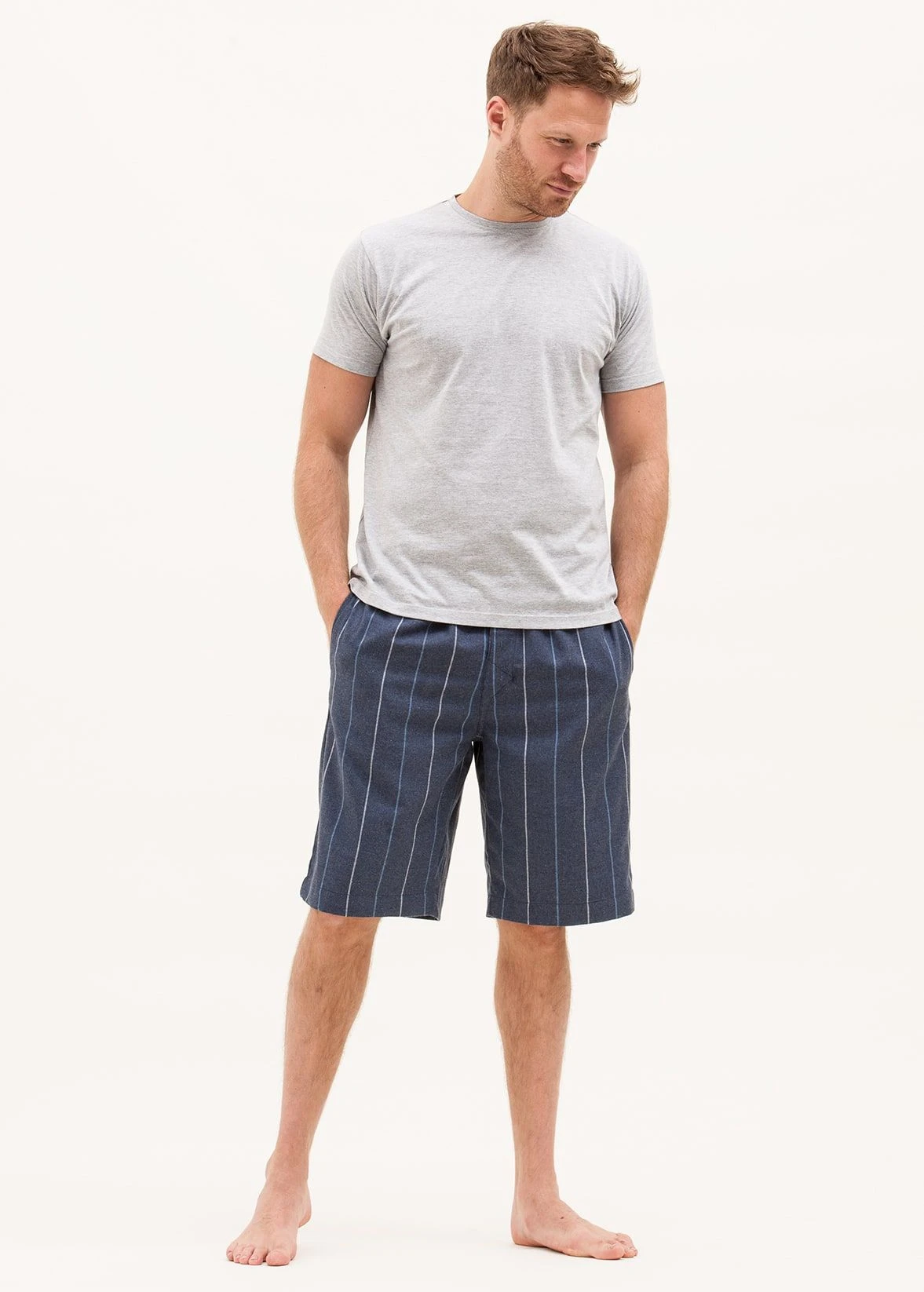 Men’s pyjama shorts in a soft brushed cotton stripe. Finished with two side pockets and a single button fly. This fabric is also available in pyjama bottoms, pyjama set, nightshirt and a dressing gown.