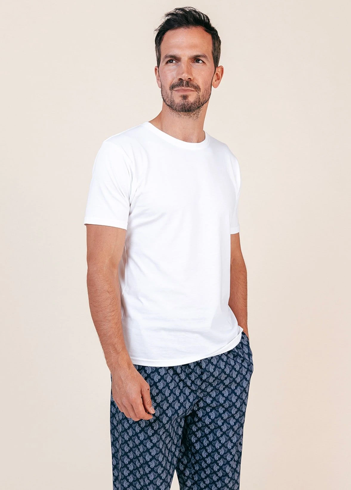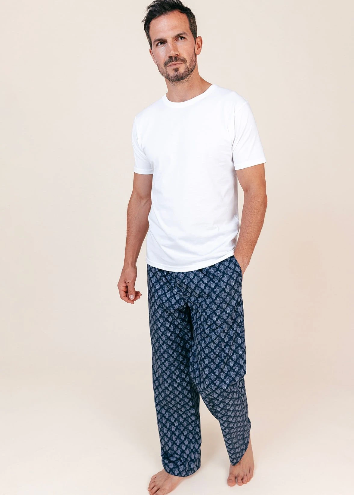 A smart addition to our men’s print collection. These high yarn count cotton pyjama trousers feature a stylish light blue paisley on a navy background. Our usual relaxed fit with a gently elasticated waistband with functional drawstring. Pair them with a navy or white organic cotton t-shirt. Other matching items available in this print.