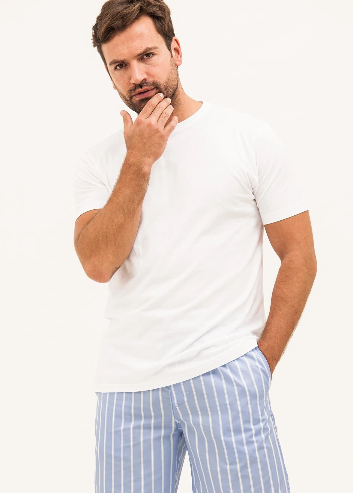 This classic blue and white stripe is also available as a full set of pyjamas as well as pyjama shorts. The pyjama trousers work really well when paired with our luxuriously soft supima cotton white t-shirt. If you’re looking to buy matching father and son nightwear, you’ll find this fabric in the boys pyjama trousers collection.