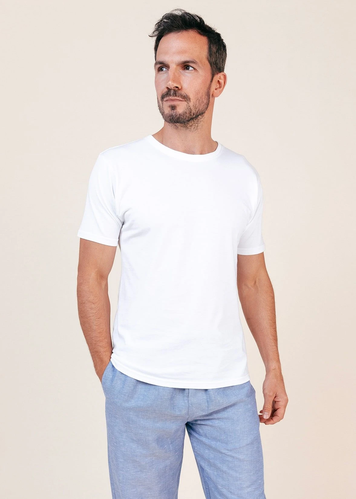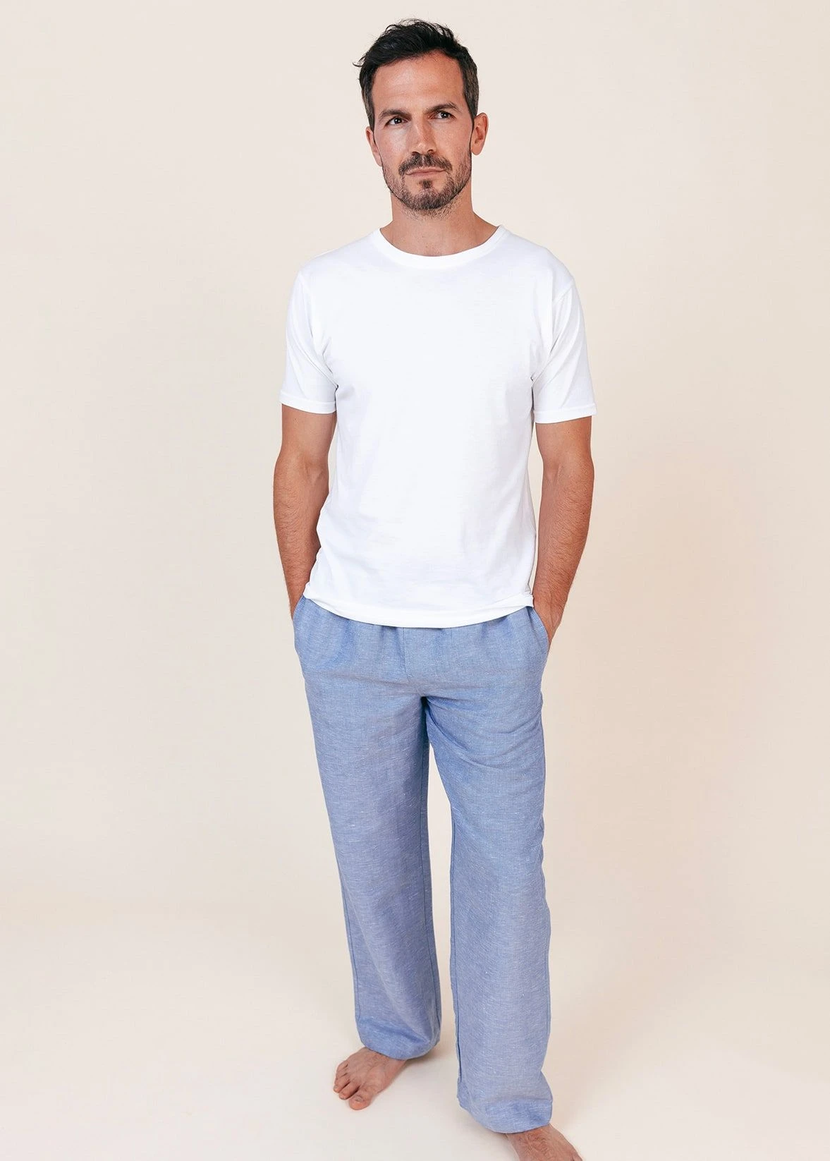 Another addition to our men’s cotton/linen blend collection but this time in a classic plain blue. Our usual straight leg style featuring a single button fly and gently elasticated waistband. Finished with two side pockets. Like everything in our men’s collection, these are available in two leg lengths. Tall size has two extra inches on the leg and fits an inside leg of up to 36″. Pair them with one of our organic cotton t-shirts. This fabric is also available as a full set of pyjamas as well as pyjama shorts. You’ll also find it in the women’s collection.