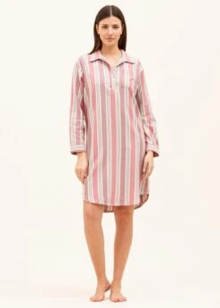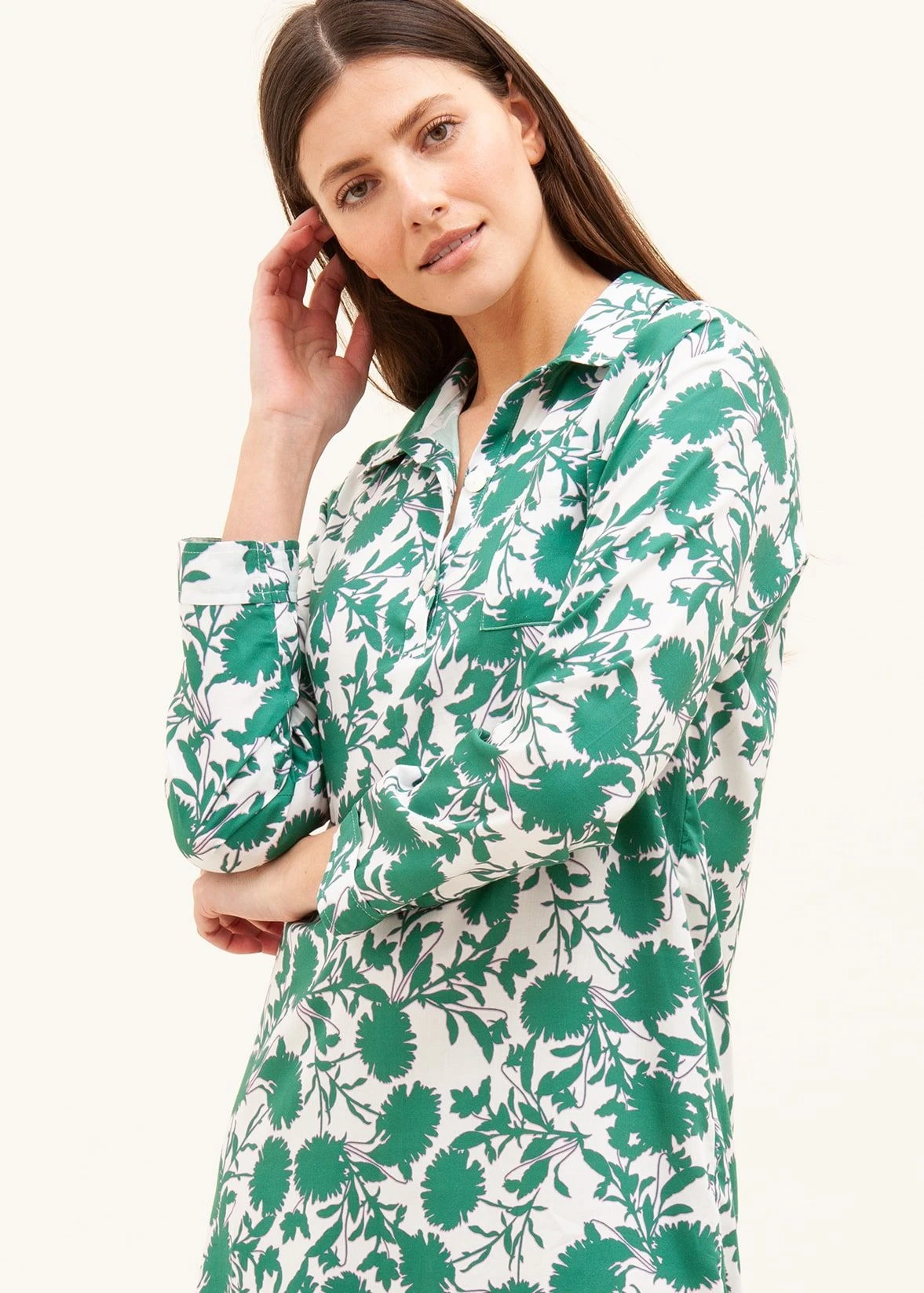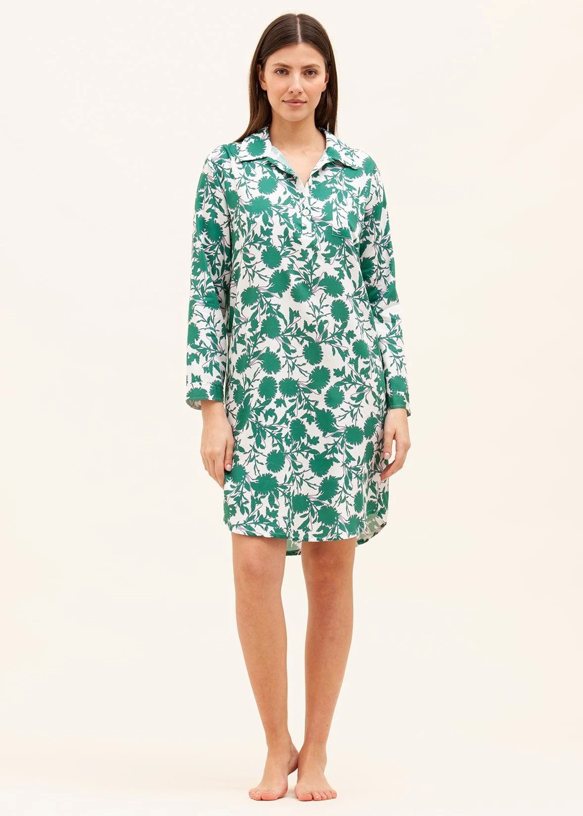 A pretty lightweight cotton nightshirt featuring a striking green floral print. Each leaf is outlined delicately in pink. This high yarn count cotton is incredibly smooth to the touch and perfect for those who prefer a lighter weight fabric. Available in both our shorter and longer lengths. Other matching items available. Please note that our nightshirts do come up slightly smaller than our pyjamas so we suggest going up a size (model height: 5’10” wearing size M).