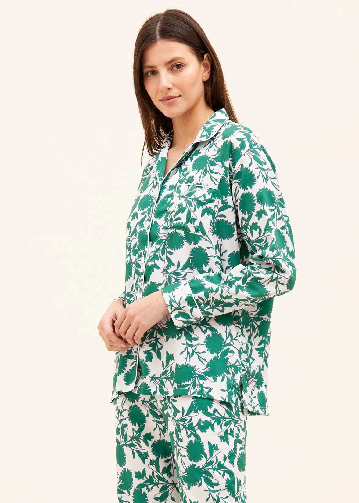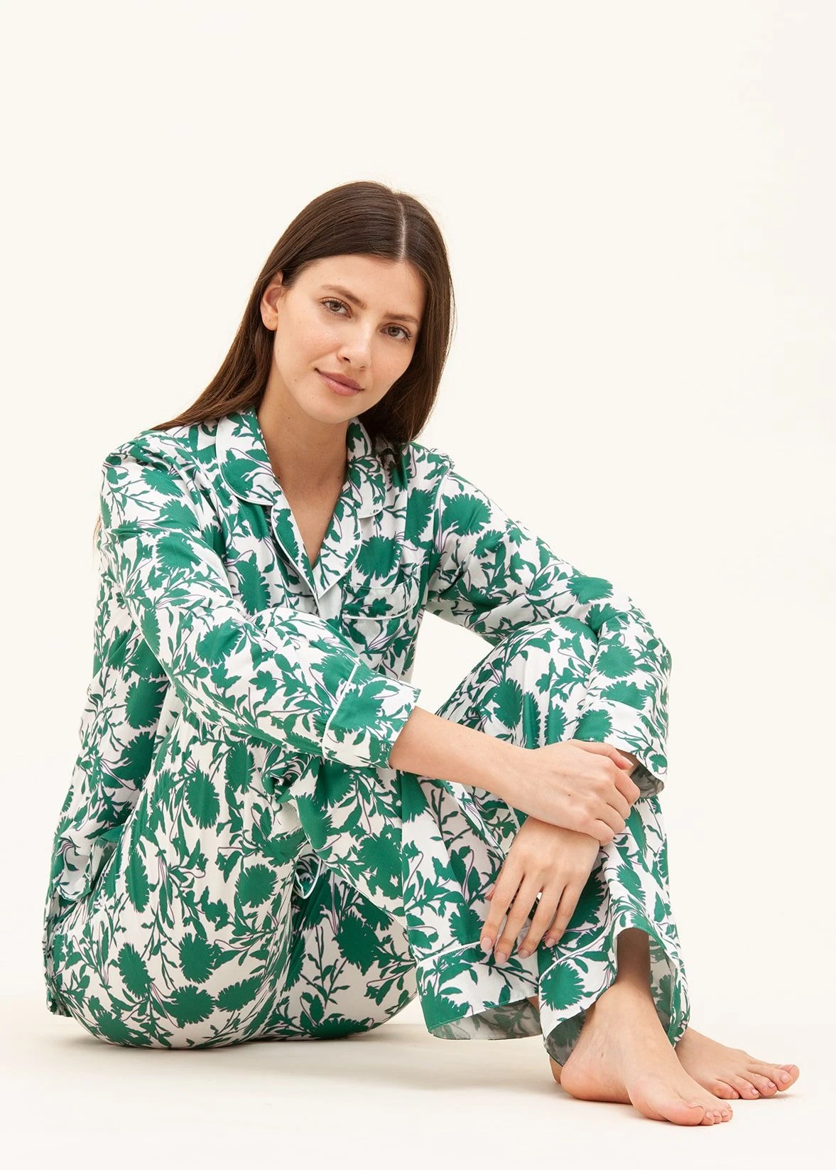Lightweight cotton pyjamas in striking green floral print. Each leaf is outlined delicately in pink. This high yarn count cotton is incredibly smooth to the touch and perfect for those who prefer a lighter weight fabric. Finished with white sateen piping on the jacket and trouser turn ups. Available in three lengths; regular, tall and extra tall. Trousers also sold separately for those not needing the jacket. Made in UK like all of our nightwear.