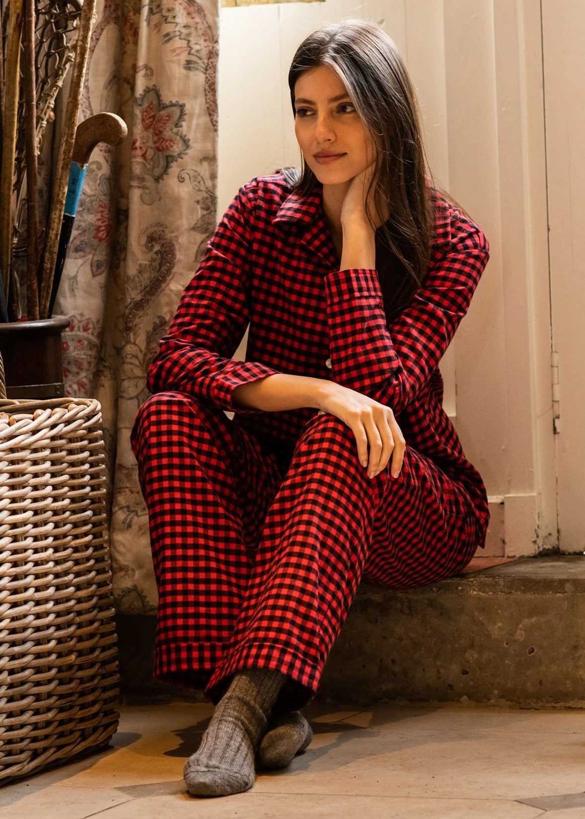 Brushed cotton pyjamas in a retro red and black check. Traditional square collar design, finished with stylish turn ups on the cuffs and trouser hems. Complete the look with a pair of alpaca bed socks.