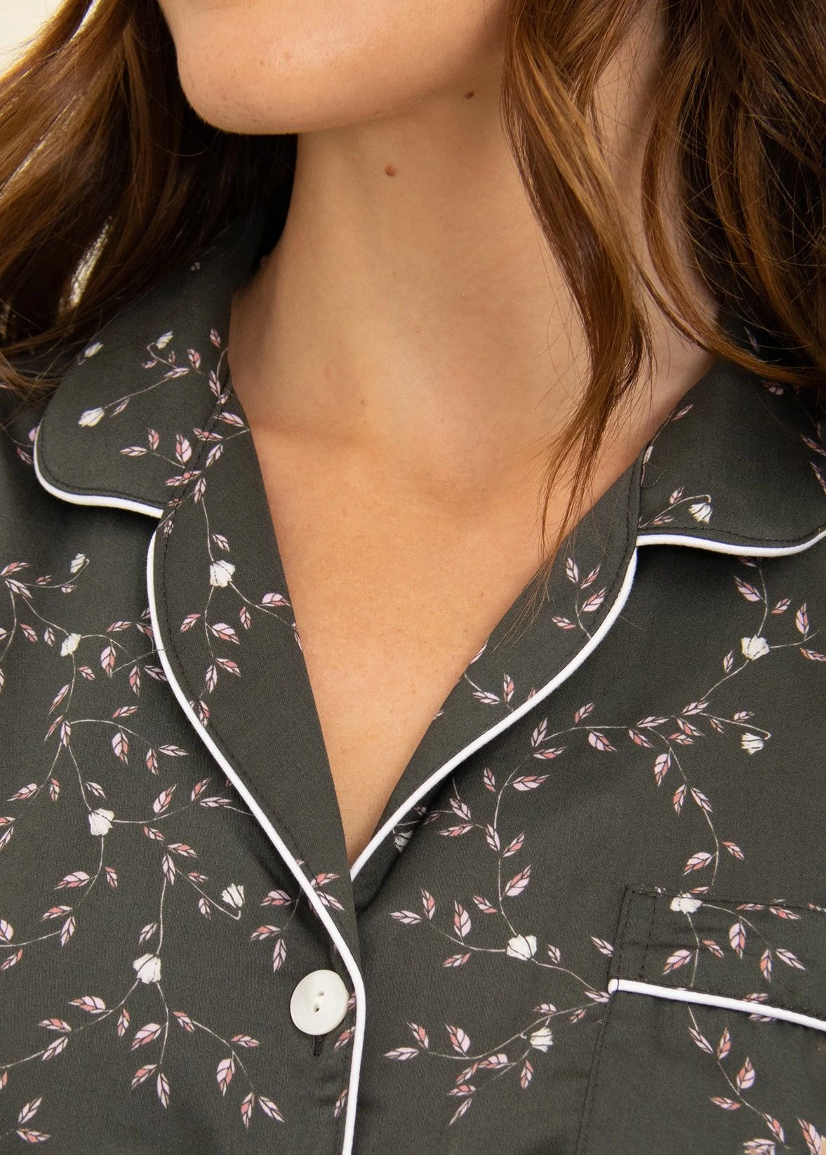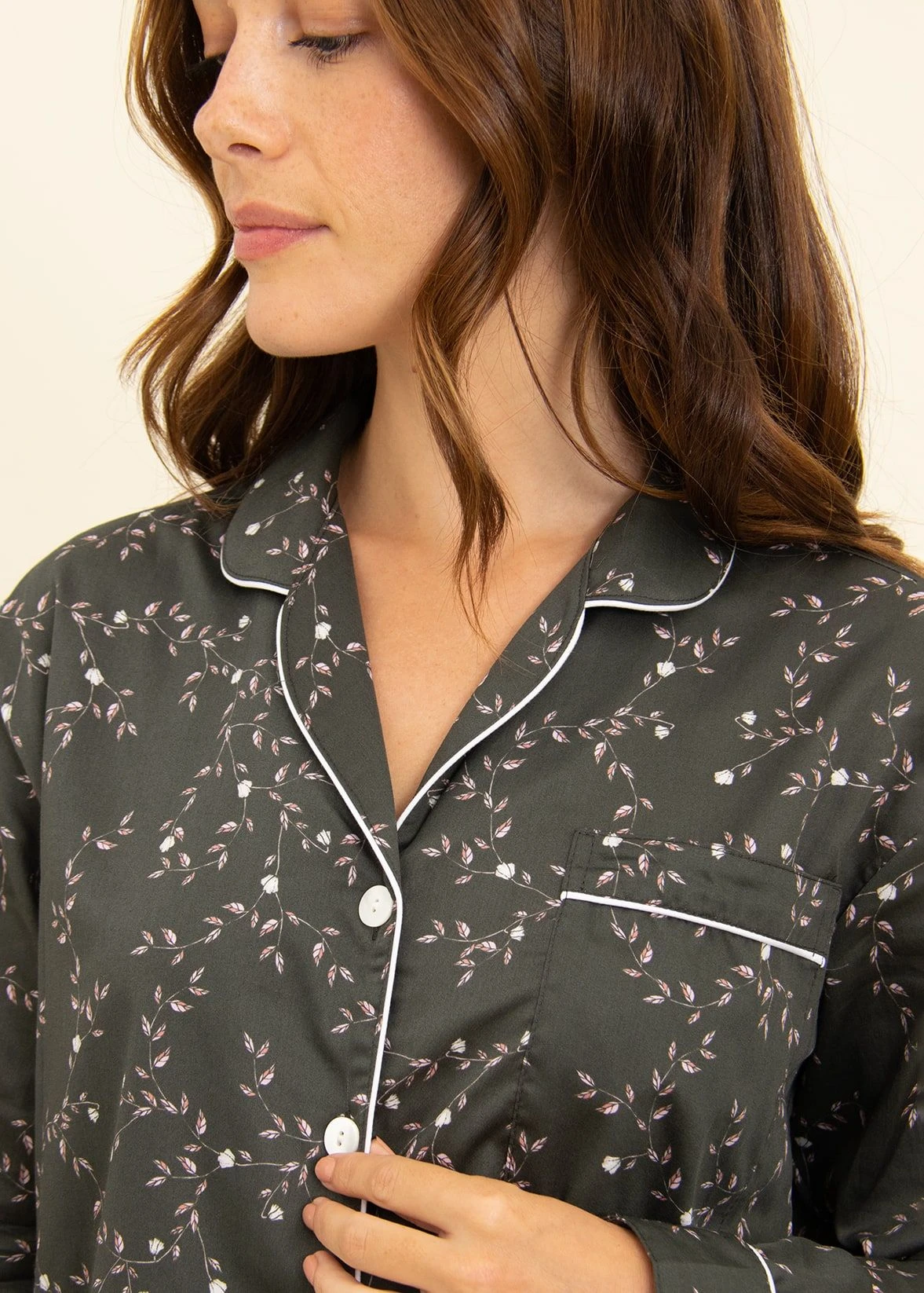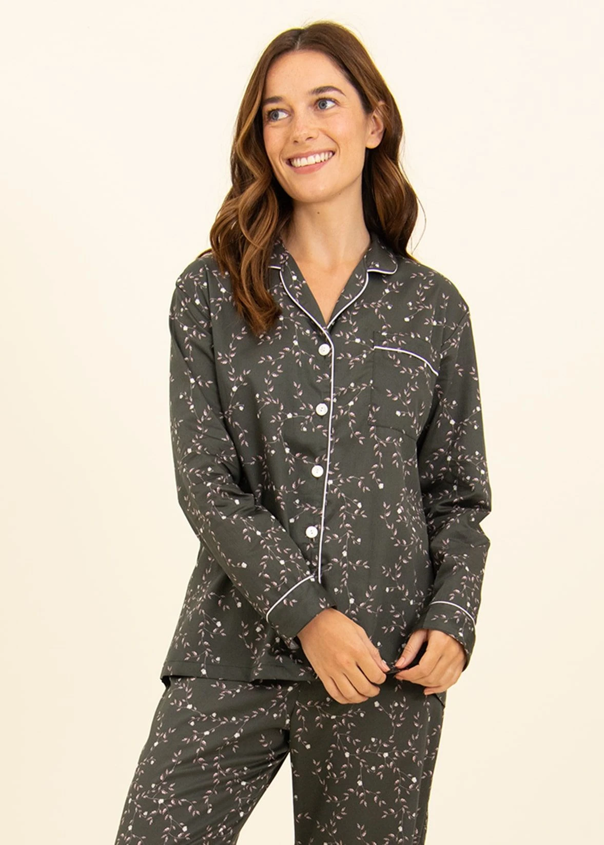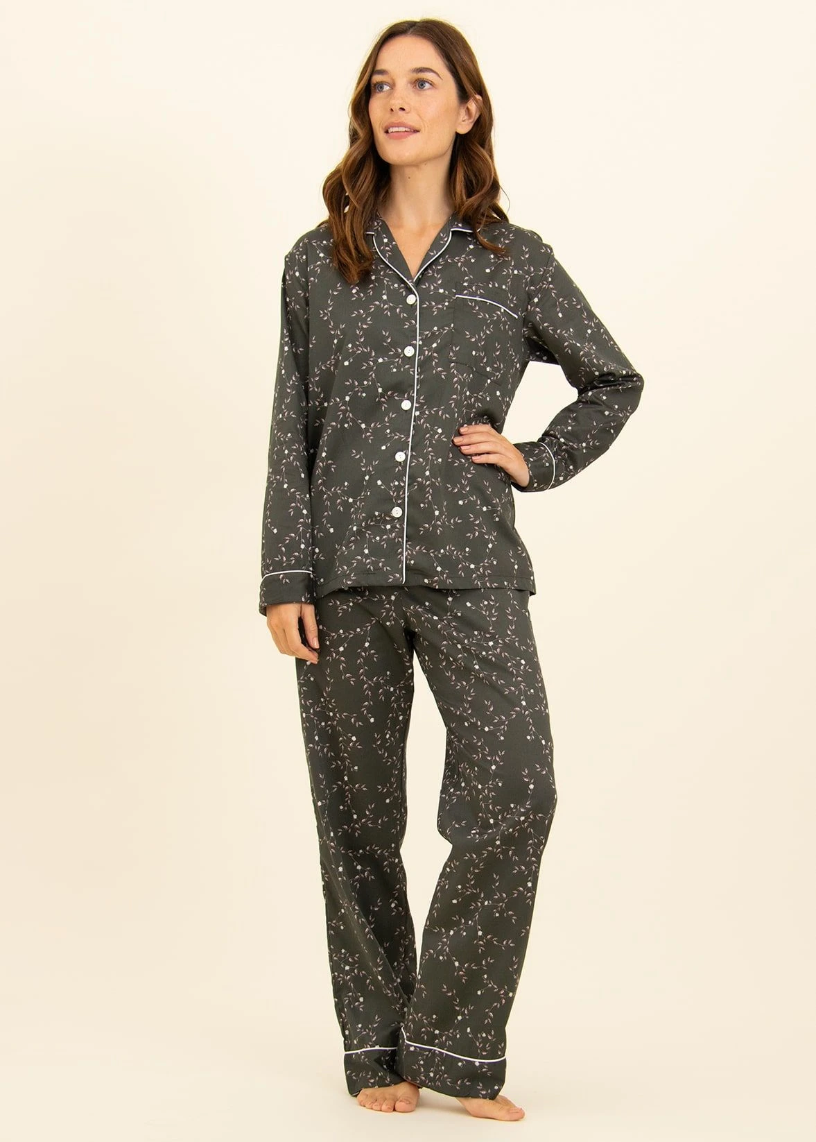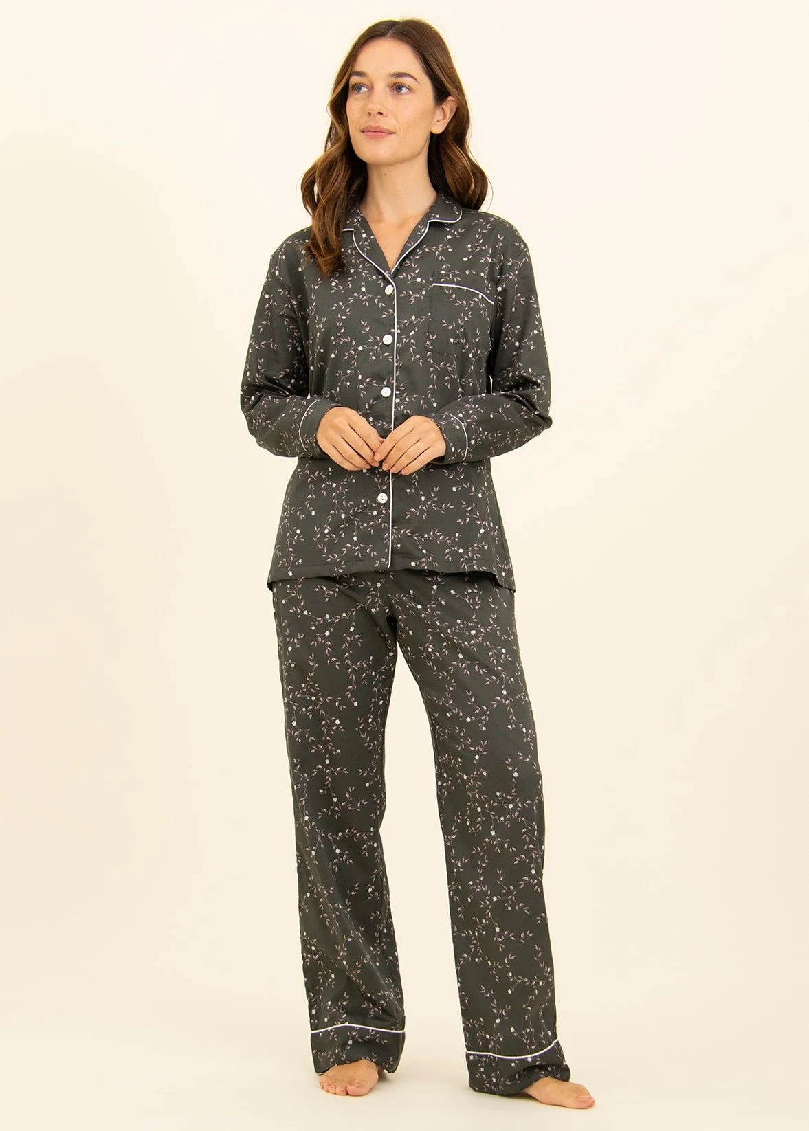 Stunning olive-black lightweight cotton pyjamas with a pretty cascade of pale pink leaves and white flowers. The jacket is styled with a flattering gently tapered waist and finished with real shell buttons and feminine white sateen piping. Straight leg pj bottoms with piping on the hems. Available in our regular, tall and extra tall sizes. Trousers also sold separately for those not needing the jacket.
