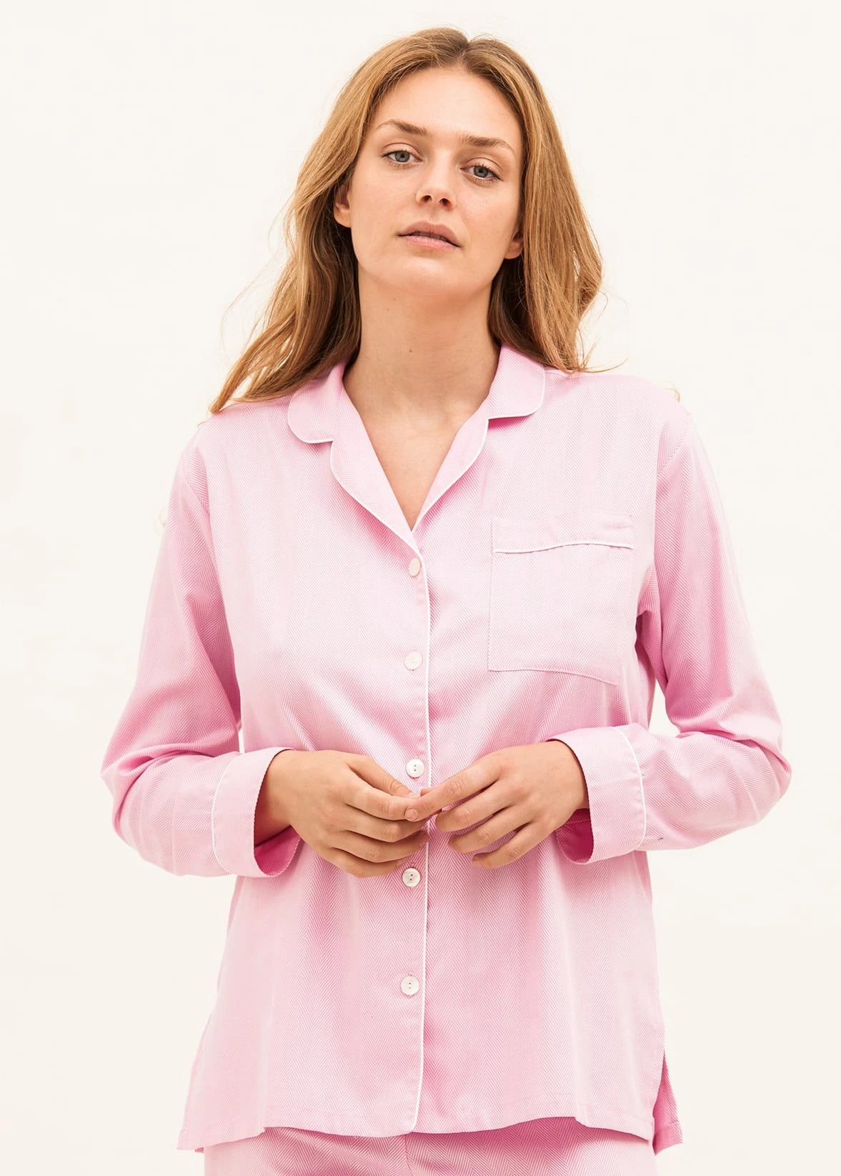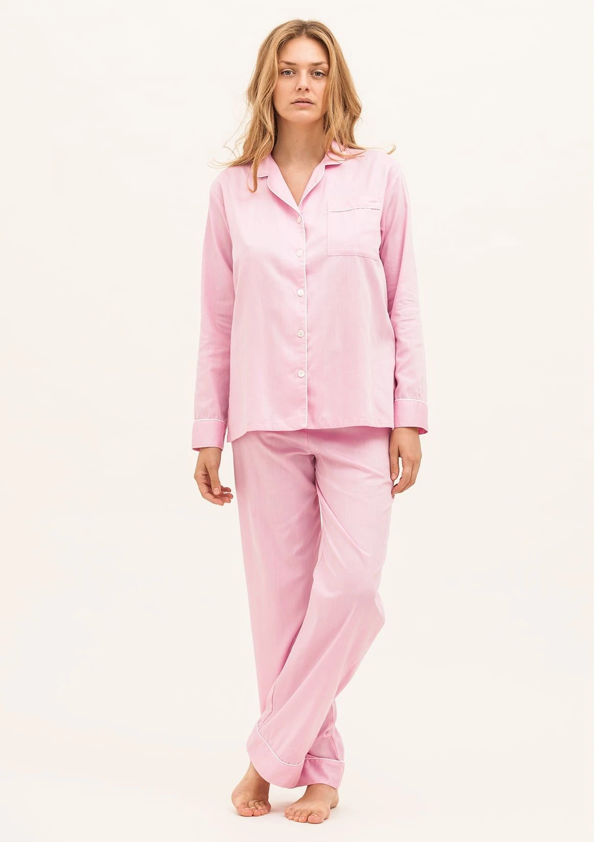 A truly striking pair of pink pyjamas. This fun pink and white herringbone is available in our regular and tall sizes. Feminine round collar style, finished with contrasting white piping on the jacket and trouser hems. These are not just any old pink pyjamas – they have a real feel of luxury about them. Made in UK like all of our nightwear.