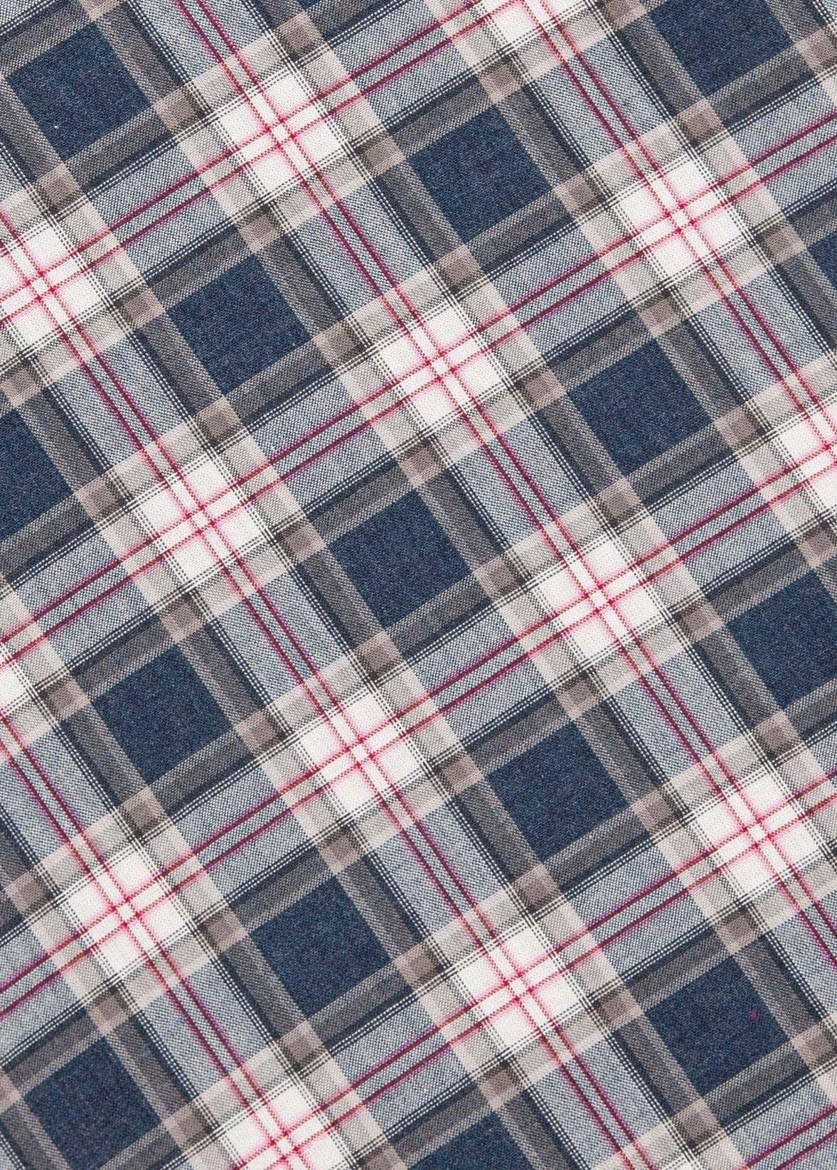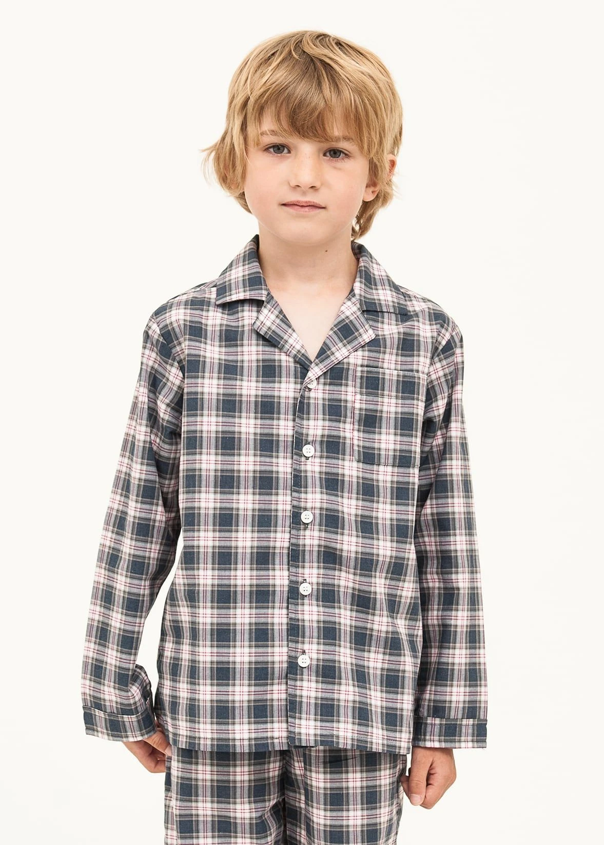 Children’s lightweight cotton pyjamas in a cool dark blue and check. Buttoned traditionally for boys but would be suitable for girls too. Traditional pyjama jacket with real shell buttons. Straight leg trousers with elasticated waist and functional drawstring.