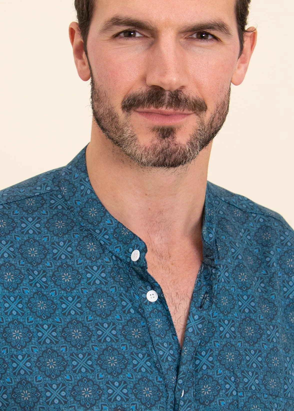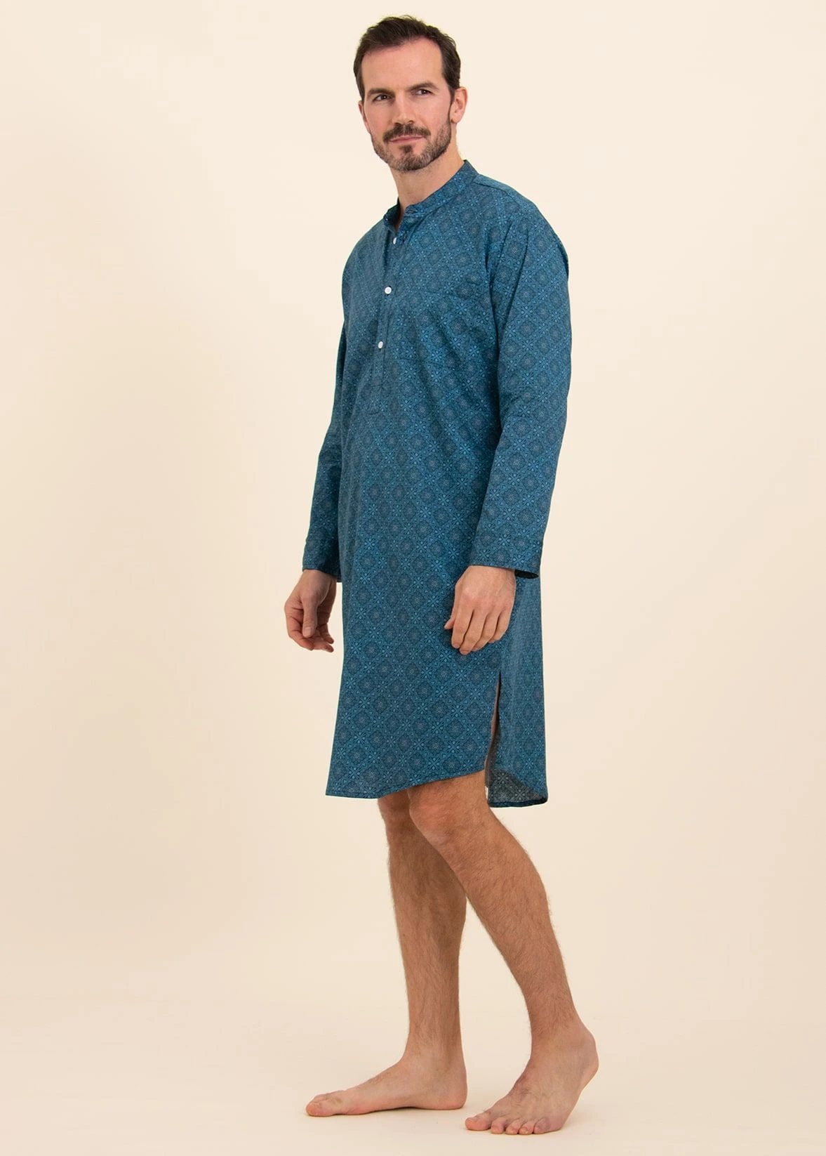 Men’s luxury cotton nightshirt in a striking blue geometric print. Generously cut with a stylish mandarin collar and features a gently scooped hem with a side split to allow ease of movement. Finished with a breast pocket, turn ups on the cuffs and real shell buttons. This high yarn count cotton gives this nightshirt a beautifully smooth handle. Other men’s items available in this fabric and you will also find this print in the women’s collection but in a different shade of blue. Don’t miss our Rhapsody natural soap and shave bar!