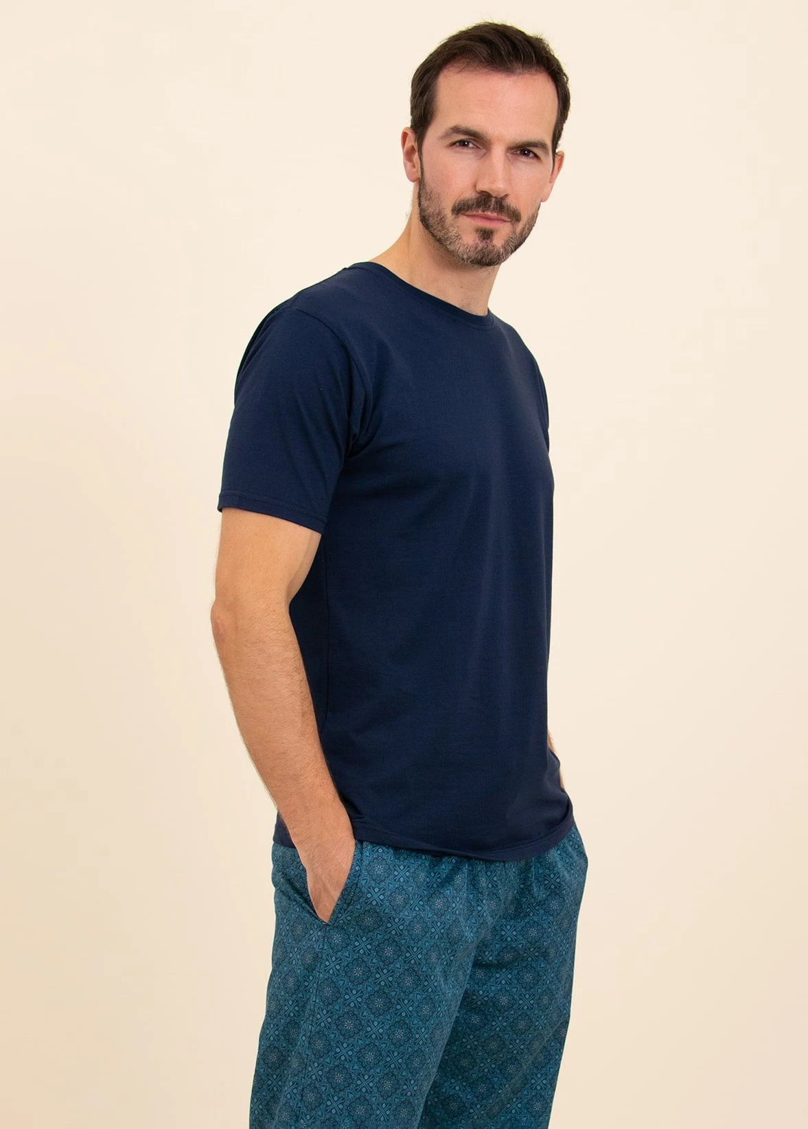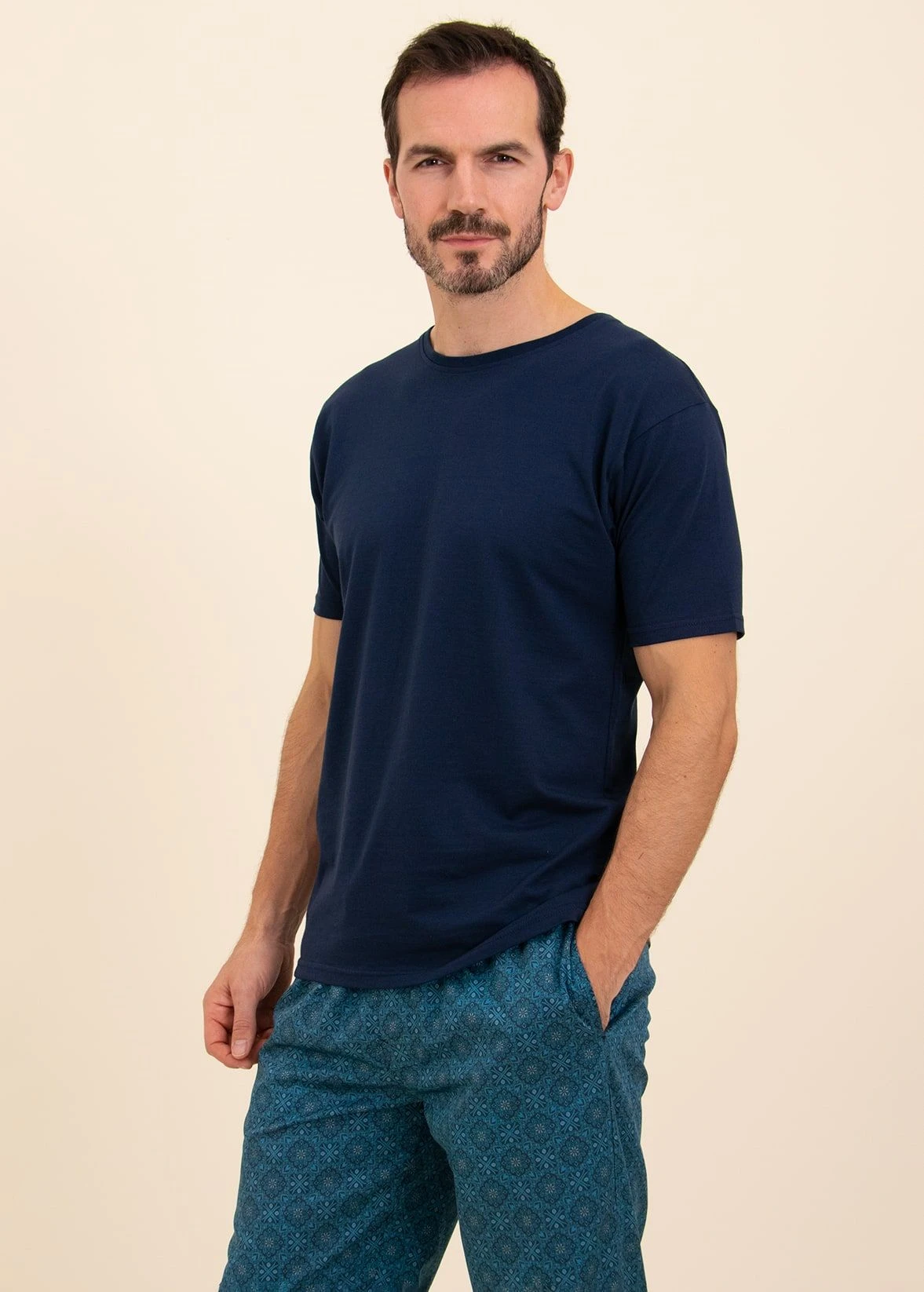 Men’s luxury cotton pyjama bottoms in a blue geometric print. This high yarn count cotton gives these pyjama bottoms a beautifully smooth handle. Pair them with one of our navy or white organic cotton t-shirts. Other men’s items available in this fabric and you will also find this print in the women’s collection but in a different shade of blue.