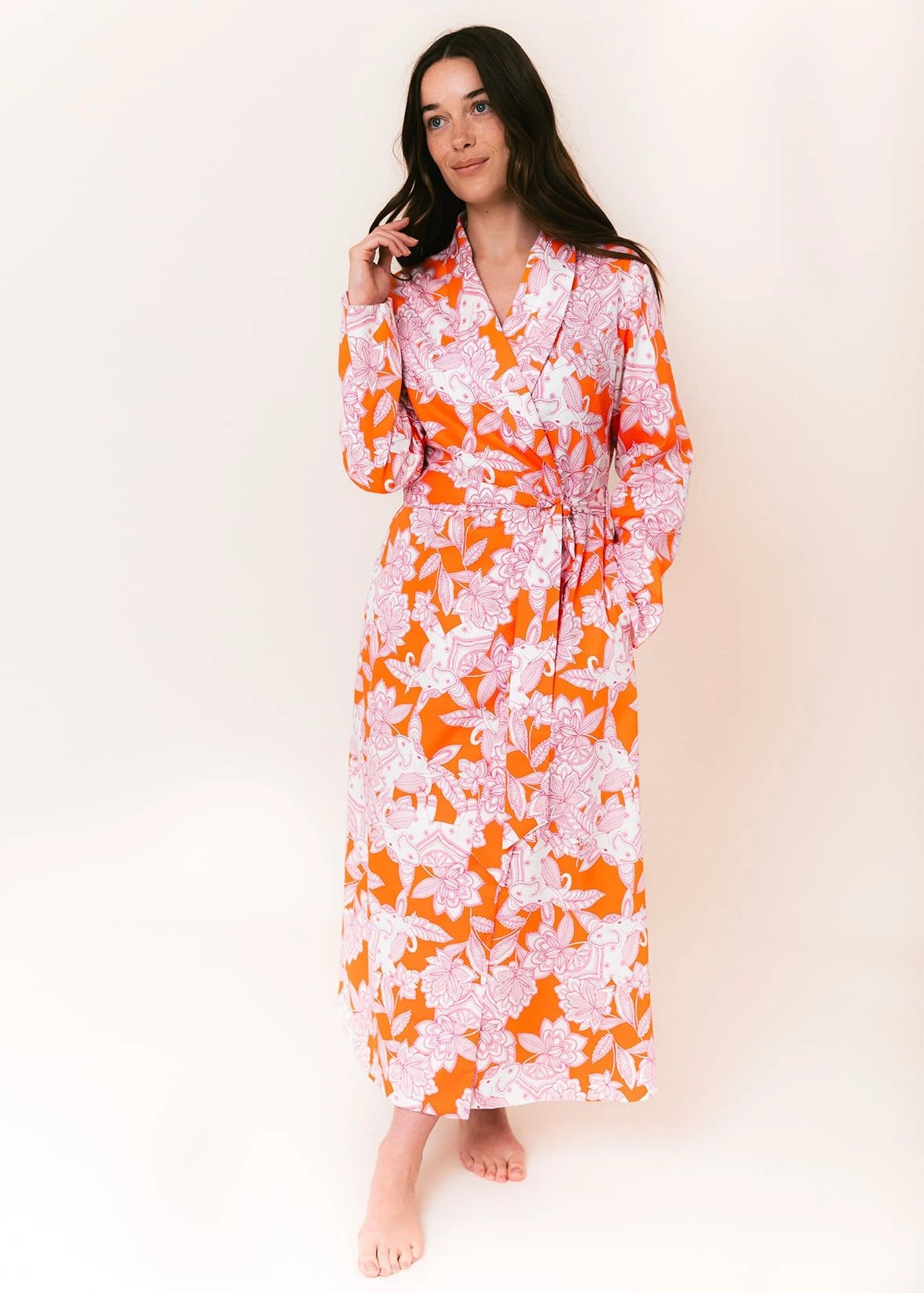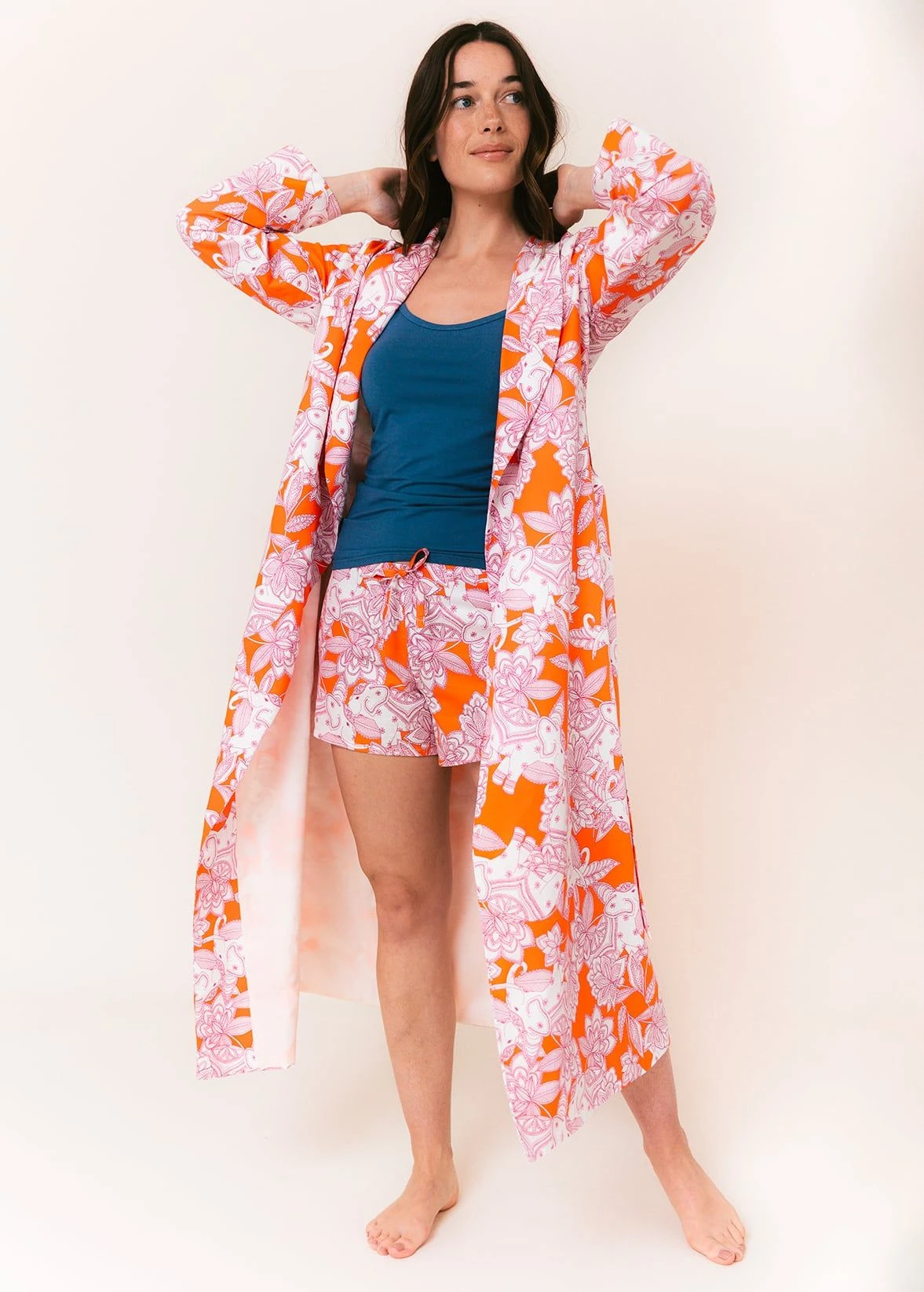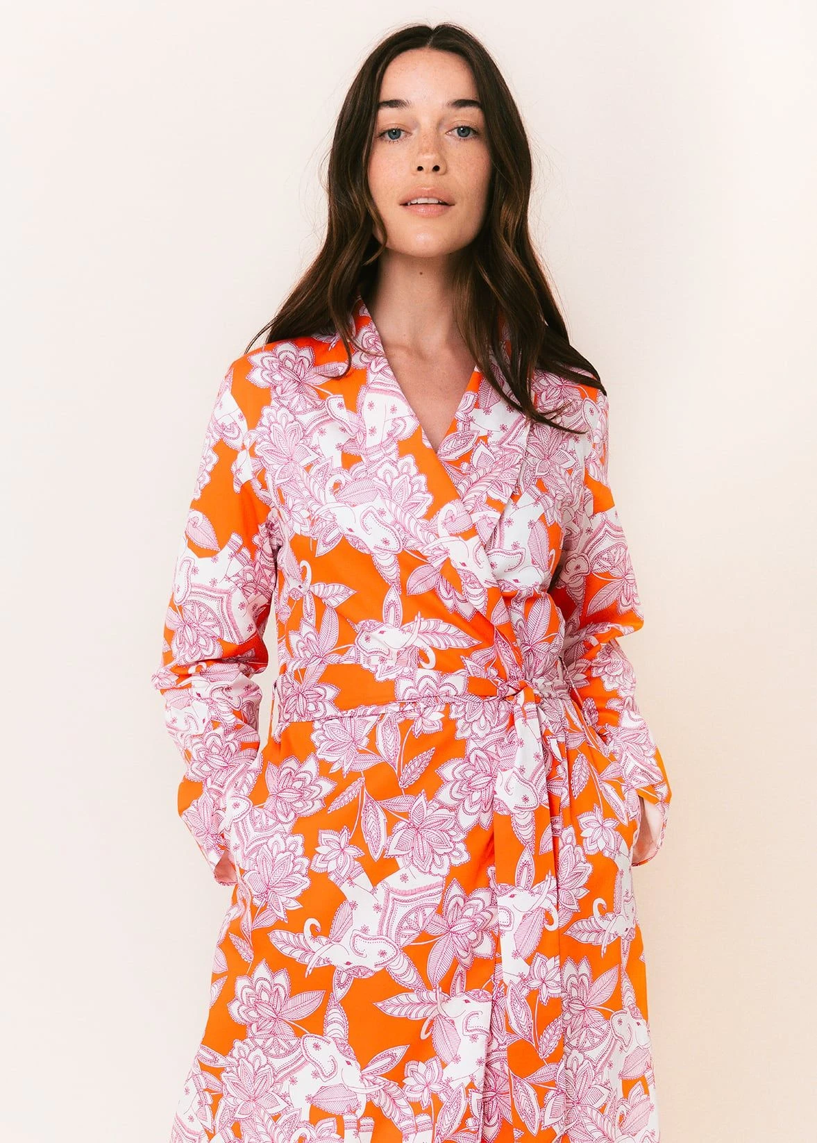 Lightweight cotton dressing gown in a fun orange and pink elephant print. This dressing gown is fully lined in a lightweight cream cotton and finished with a feminine shawl collar, a removable tie around the waist and two side pockets. Matching items available.