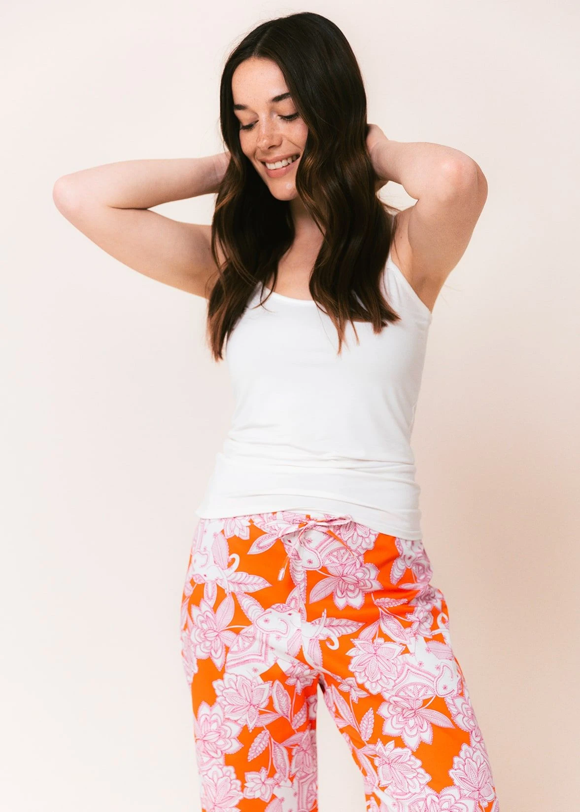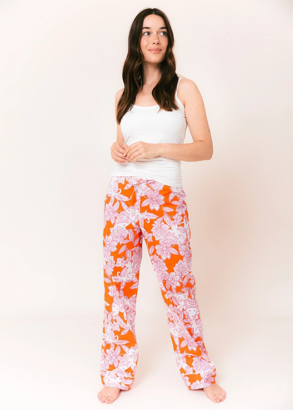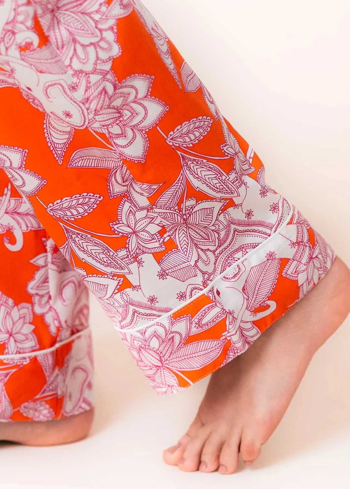 Lightweight cotton pyjama bottoms in a playful orange and pink Indian elephant print. Flattering flat fronted waistband with gently elasticated back. Finished with white piping on the stylish deep turn ups. Available in three leg lengths; regular, tall and extra tall. Other matching items available.