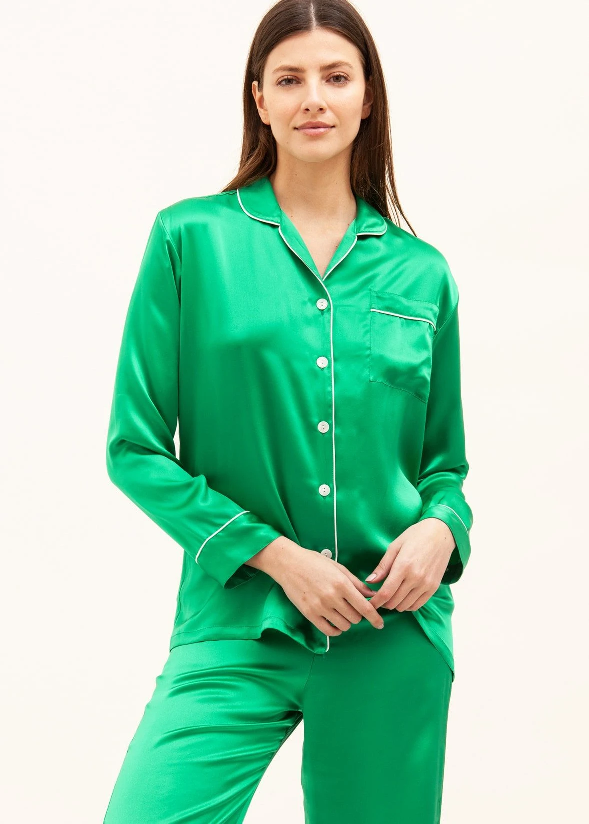Luxurious silk pyjamas in a vibrant emerald green. This cut features a flattering tapered waist and French seams throughout, giving a neater, stronger finish to the seams. Finished with real shell buttons and ivory silk piping. Flattering straight leg pyjama bottoms with a flat fronted waist and a gently elasticated back. This fabric is also available in pyjama shorts.