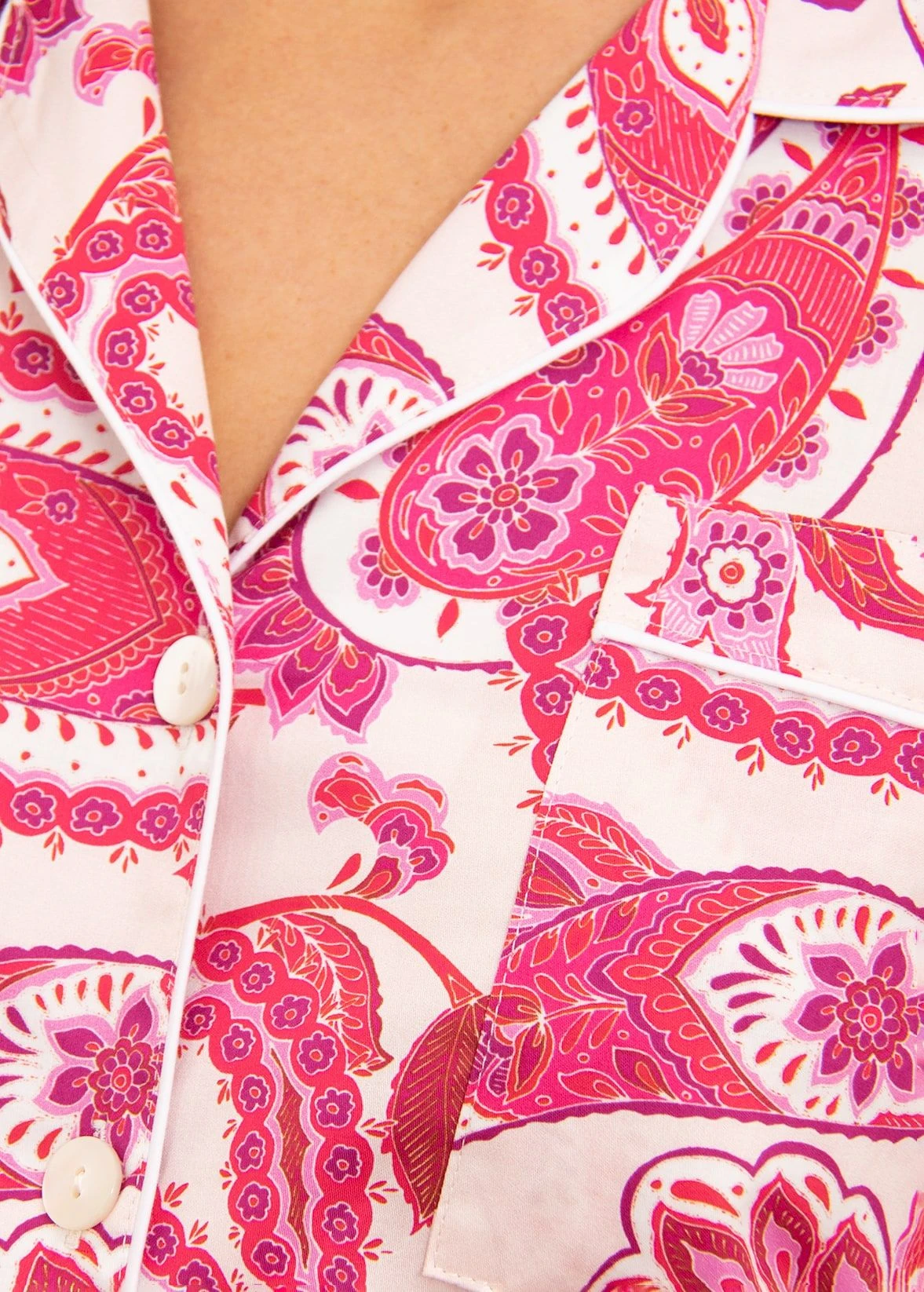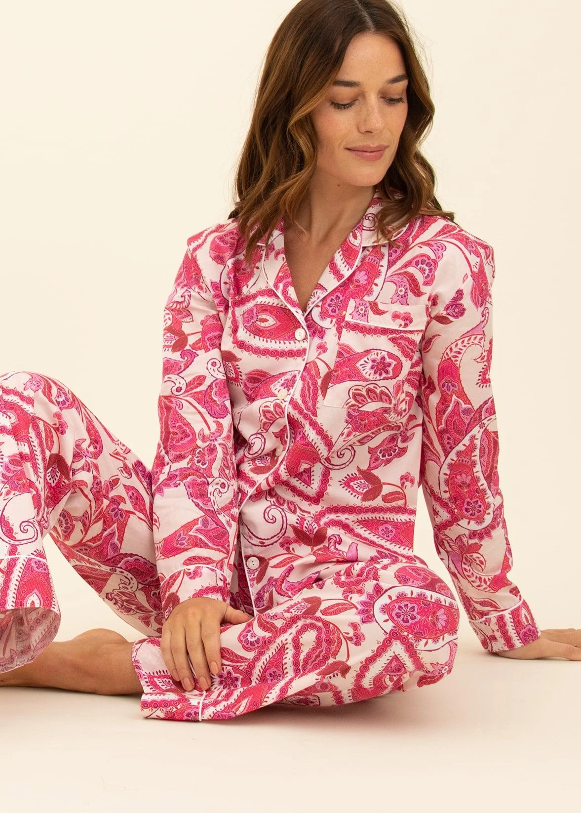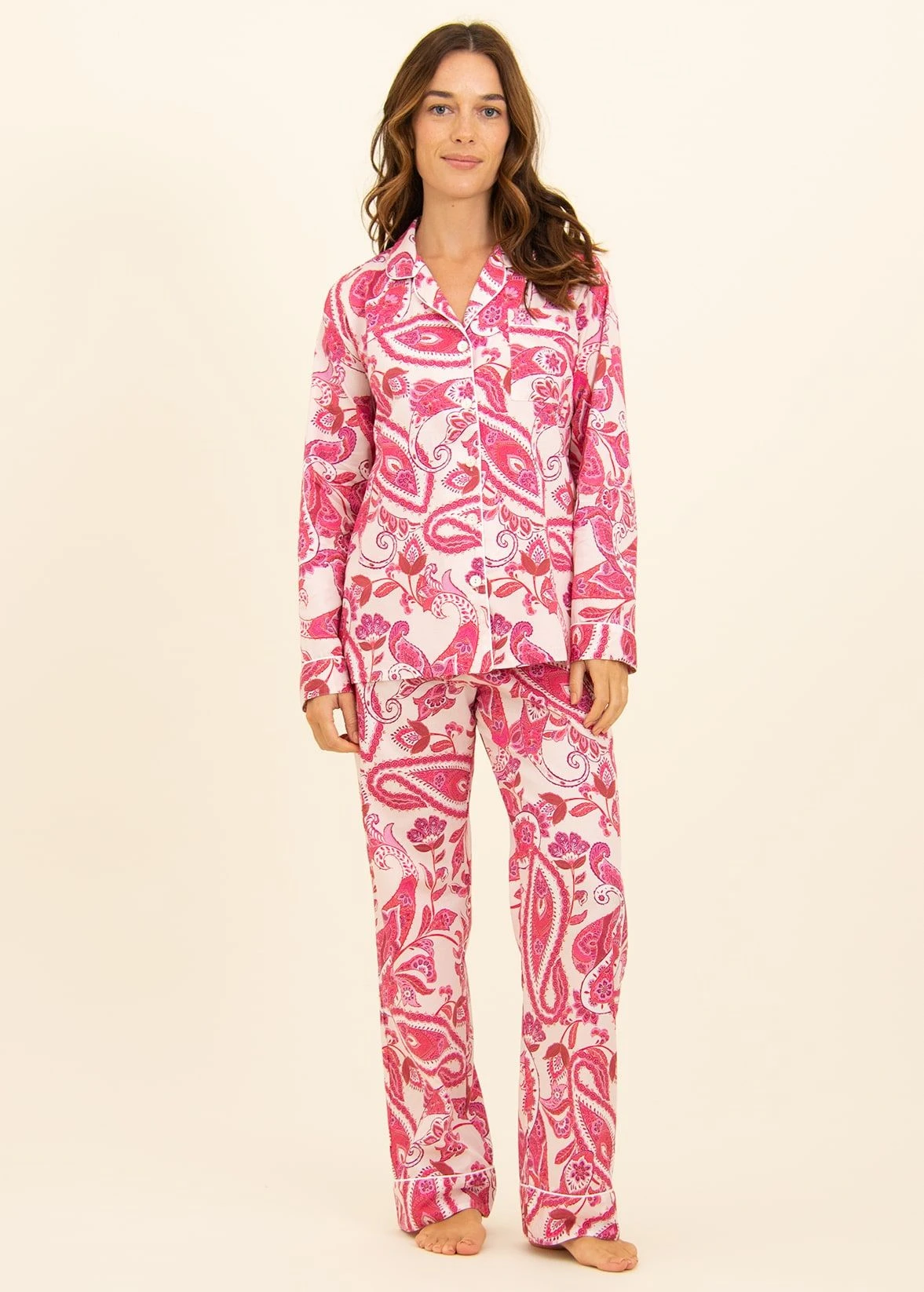 Luxury cotton sateen pyjamas in a striking oversized paisley print. Finished with white sateen piping and real shell buttons. The jacket is styled with a flattering gently tapered waist. Straight leg pyjama bottoms which can also be bought separately for those not needing the jacket. Other matching items available in the stunning print plus our brand new Fantasia soap. All British made.