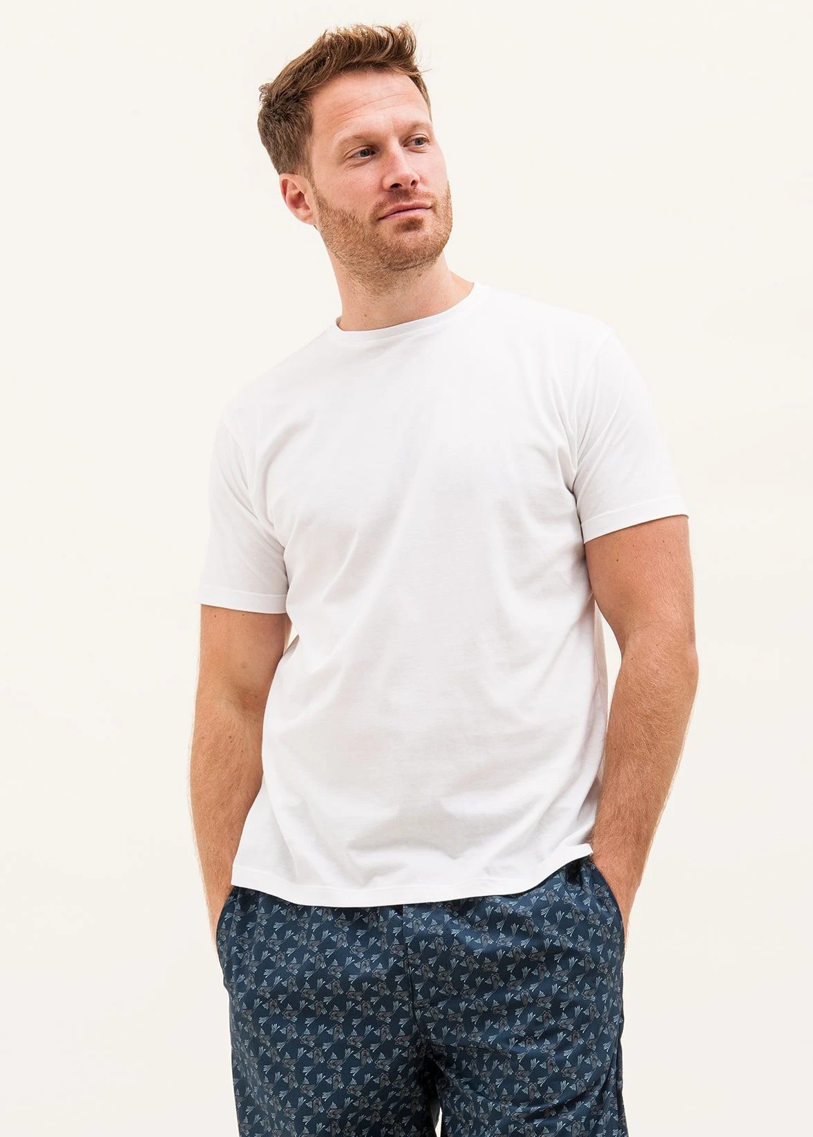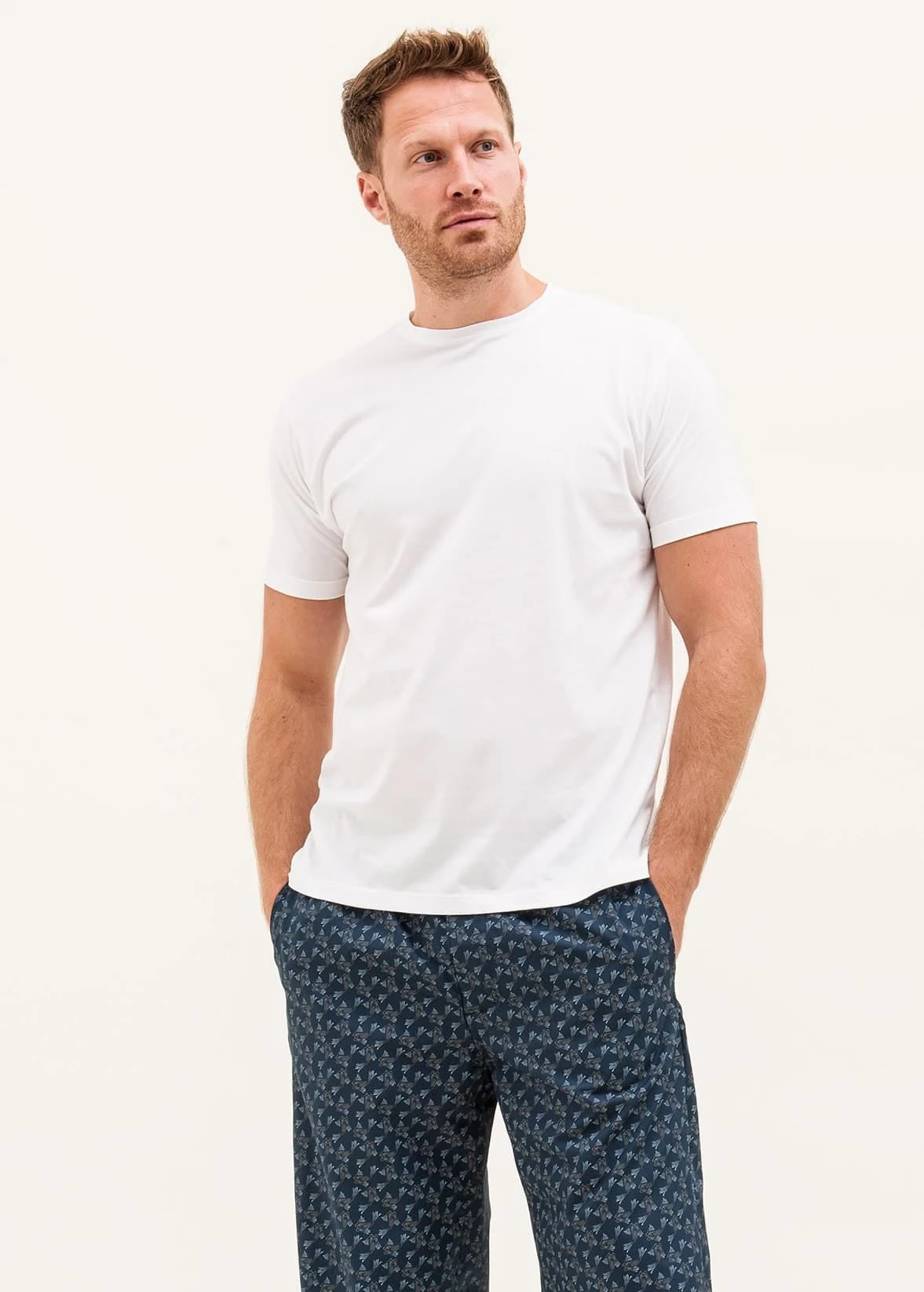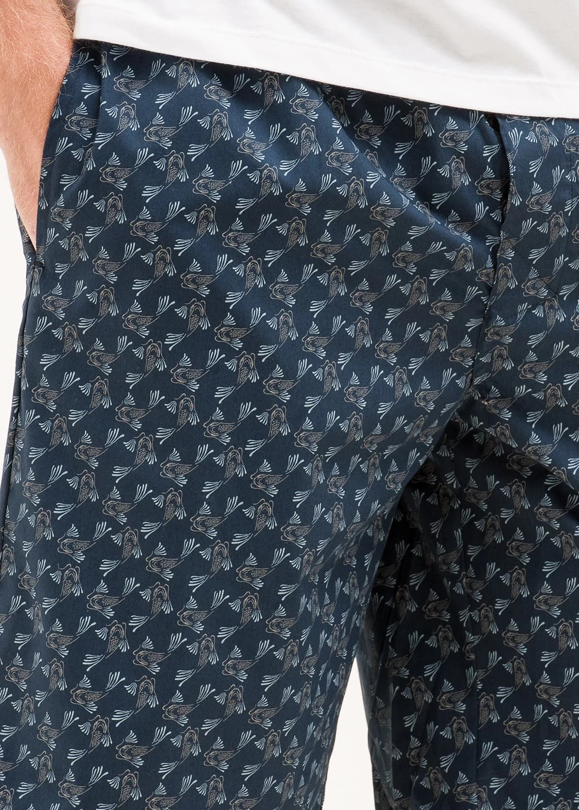 Men’s luxury cotton pyjama bottoms in a playful fish print. Other matching items available. All made in Britain.