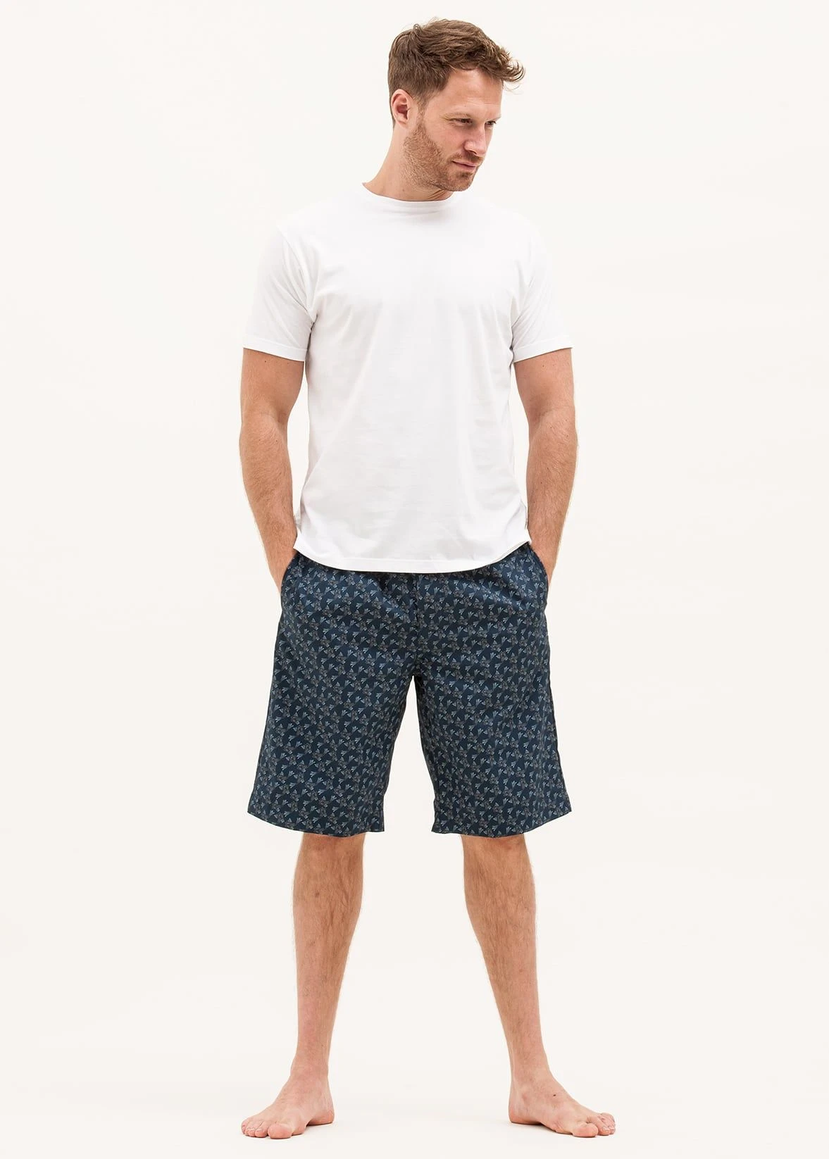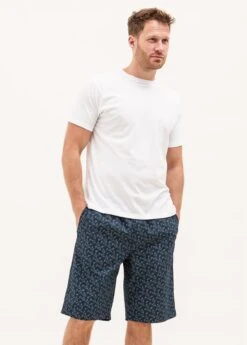Men’s luxury cotton pyjama shorts in a playful fish print. Featuring two side pockets and a button fly. Made in Britain.
