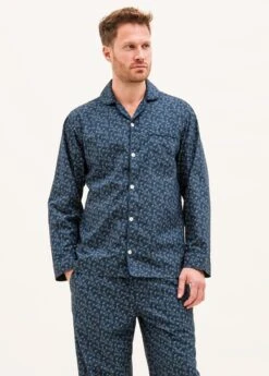 Men’s stylish pyjamas in a playful fish print. Finished with real shell buttons and navy piping. This lightweight cotton is also available as a nightshirt, pj trousers and pyjama shorts.