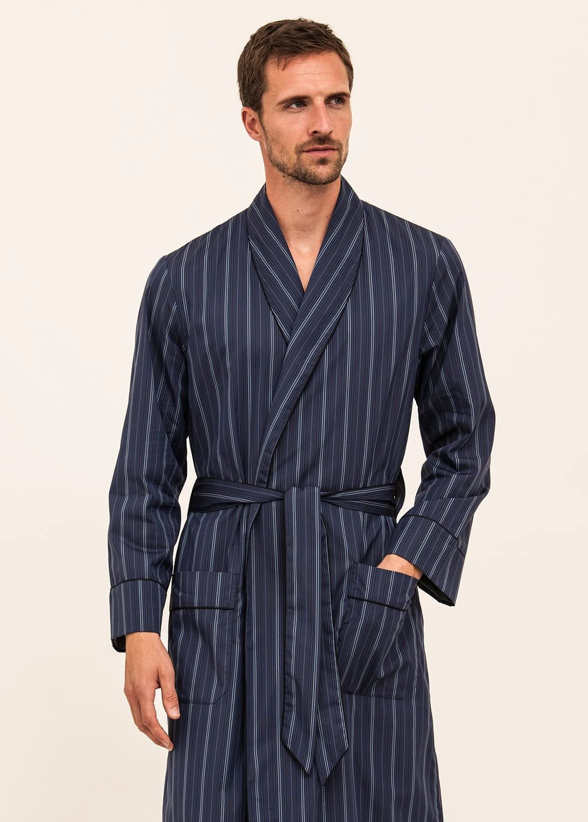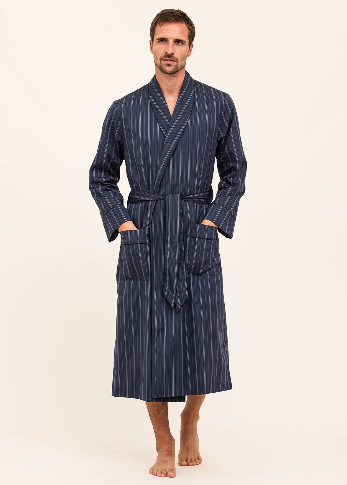 Another luxurious edition to the men’s dressing gown collection. This sophisticated blue stripe is woven from the finest quality two fold cotton. This smart full length robe is fully lined in a lightweight grey cotton and complemented with navy piping. Finished with a self-fabric waist tie, a traditional shawl collar and two front pockets. Matching pyjamas available in the same fabric.