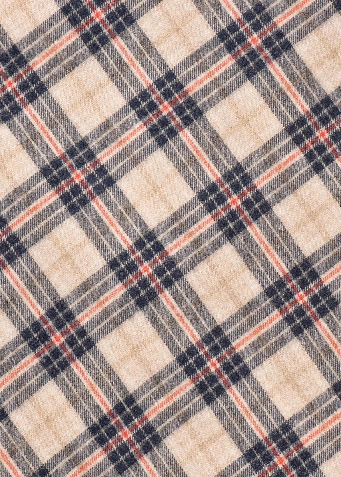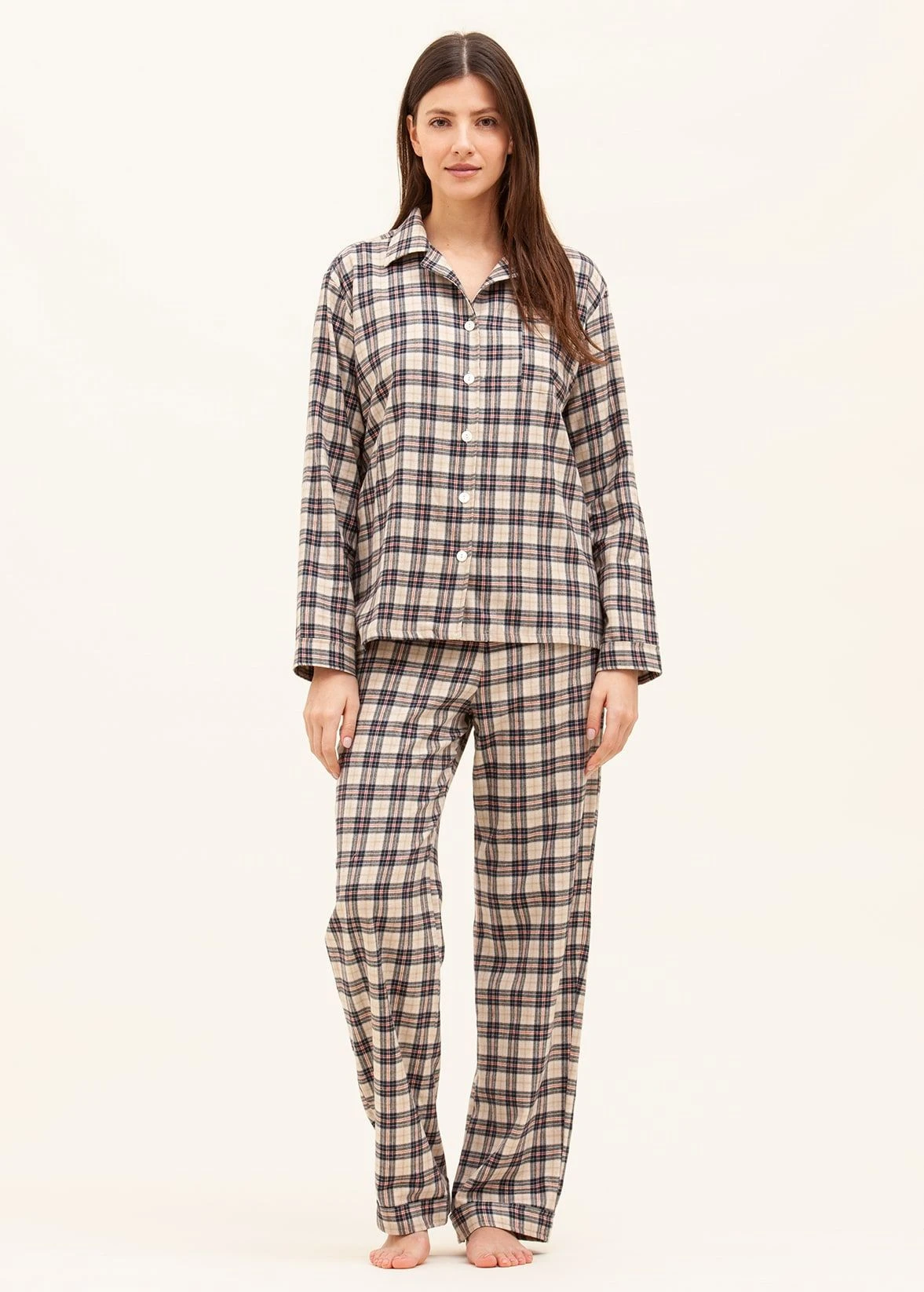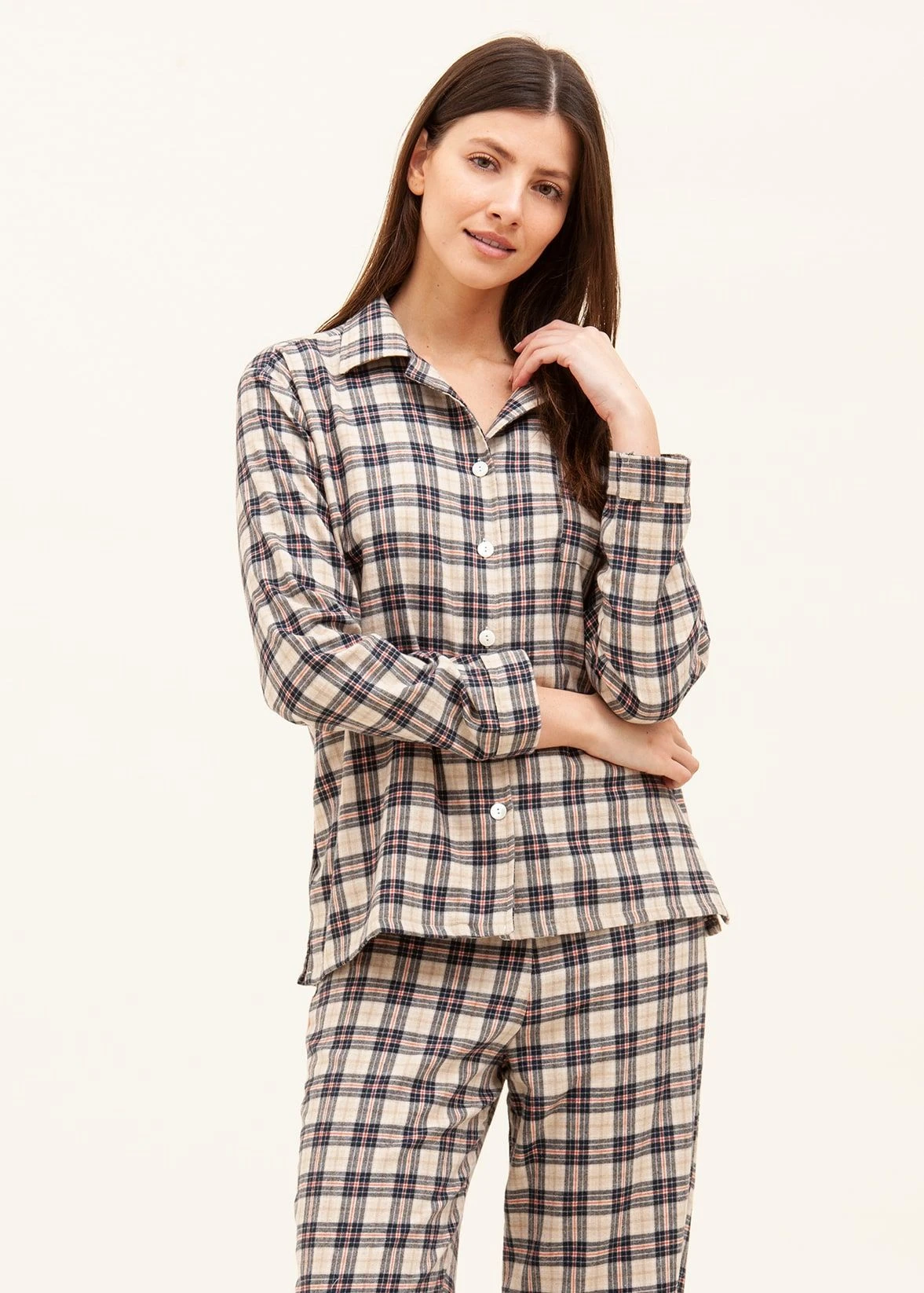 Luxury pyjamas in a soft biscuit, blue and orange check. This beautiful fabric features 20% wool making it extra cosy. Arguably one of our favourite checks in the collection. The perfect winter pyjamas. Square collar design, finished with real shell buttons and stylish turn ups on the trouser hems and cuffs. British made and available in regular and tall leg lengths. Shorts available in the same fabric. Finish the look with a pair of our undyed alpaca bed socks. This check is also available in a blue colourway.