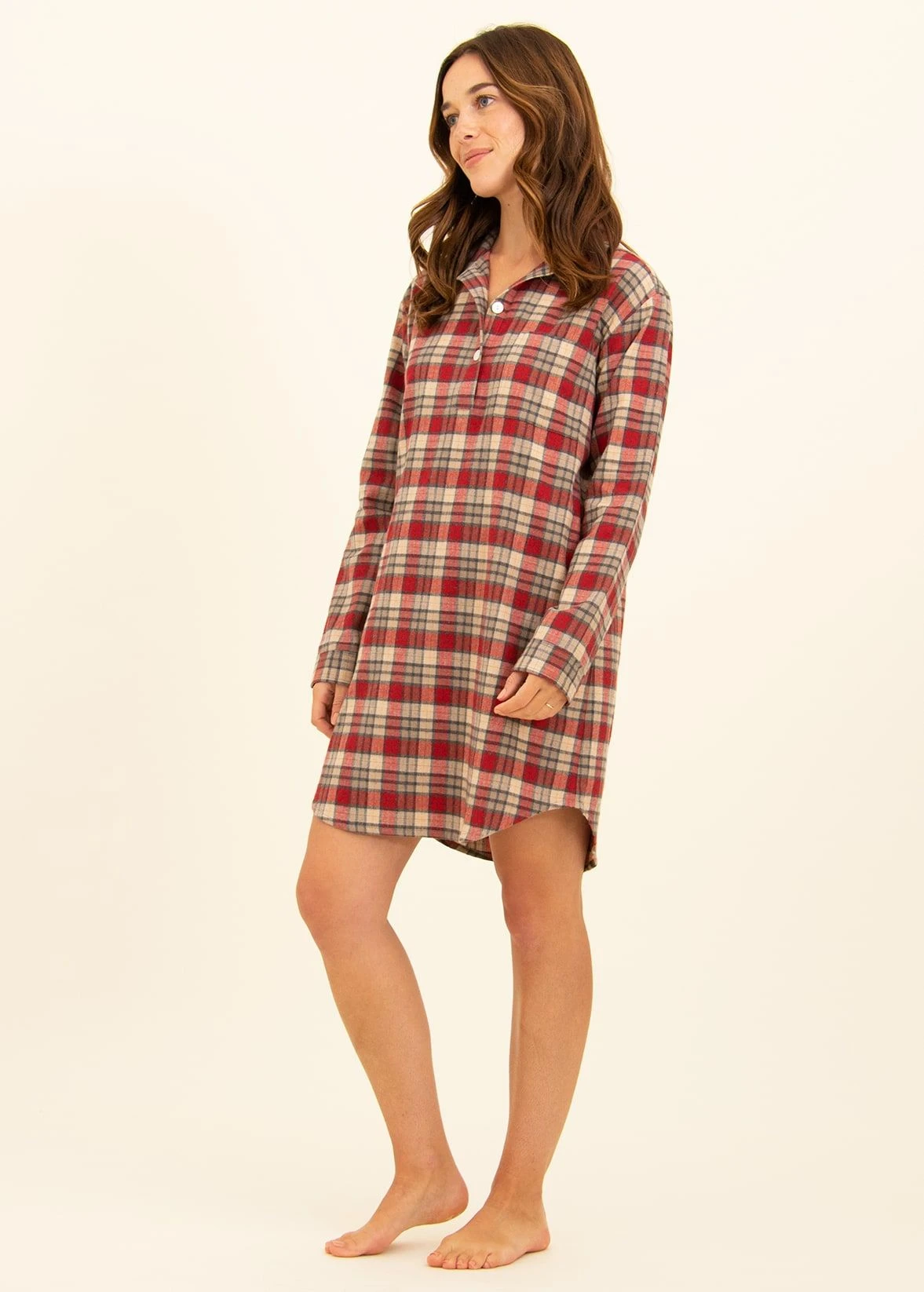 A cosy red and biscuit check nightshirt in a lovely soft organic brushed cotton. Styled with a pretty scooped hem and finished with real shell buttons. Other items available in the same fabric including matching men’s and children’s pyjamas. Model height 5’8″, wearing size S thigh length.