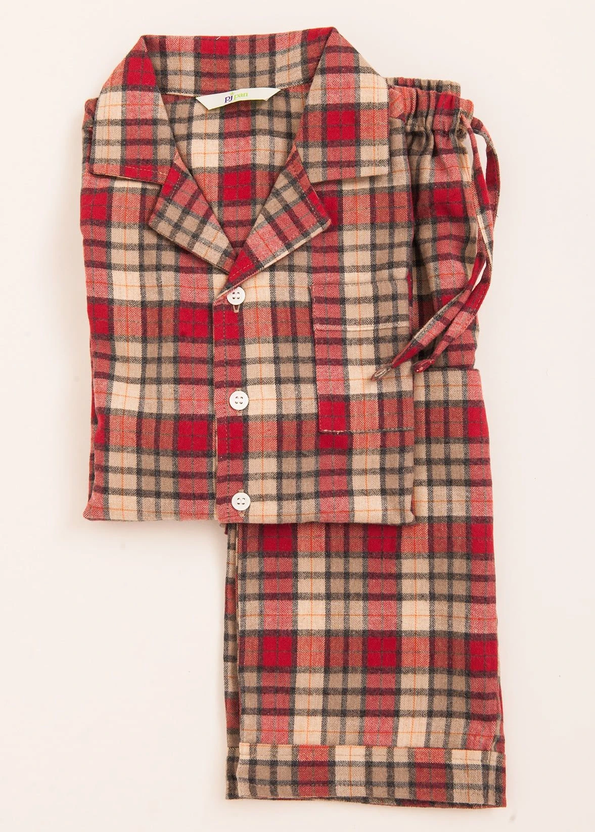 Children’s organic cotton pyjamas in a cosy red and biscuit check. Traditional pyjama jacket with real shell buttons. Suitable for boys or girls. Straight leg trousers with elasticated waist and functional drawstring. If you’re after matching family pyjamas, you’ll find this fabric in both the men’s and women’s collections.