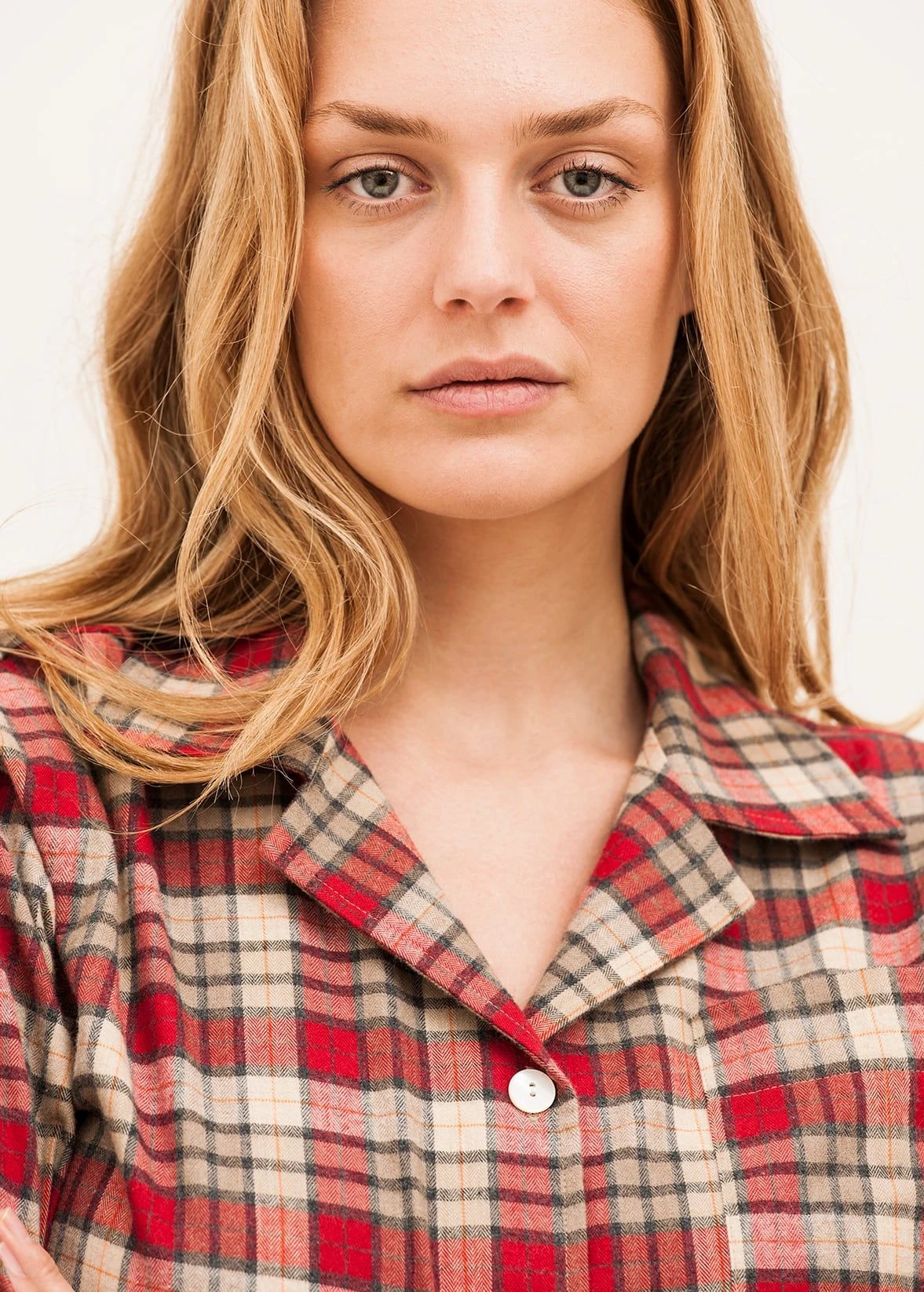 Ladies organic brushed cotton pyjamas in a cosy red and biscuit check. Square collar design, finished with stylish turn ups and real shell buttons. British made and available in regular and tall leg lengths. Shorts and nightshirt available in the same fabric as are matching men’s and children’s pyjamas for those looking for matching pyjamas for all the family.