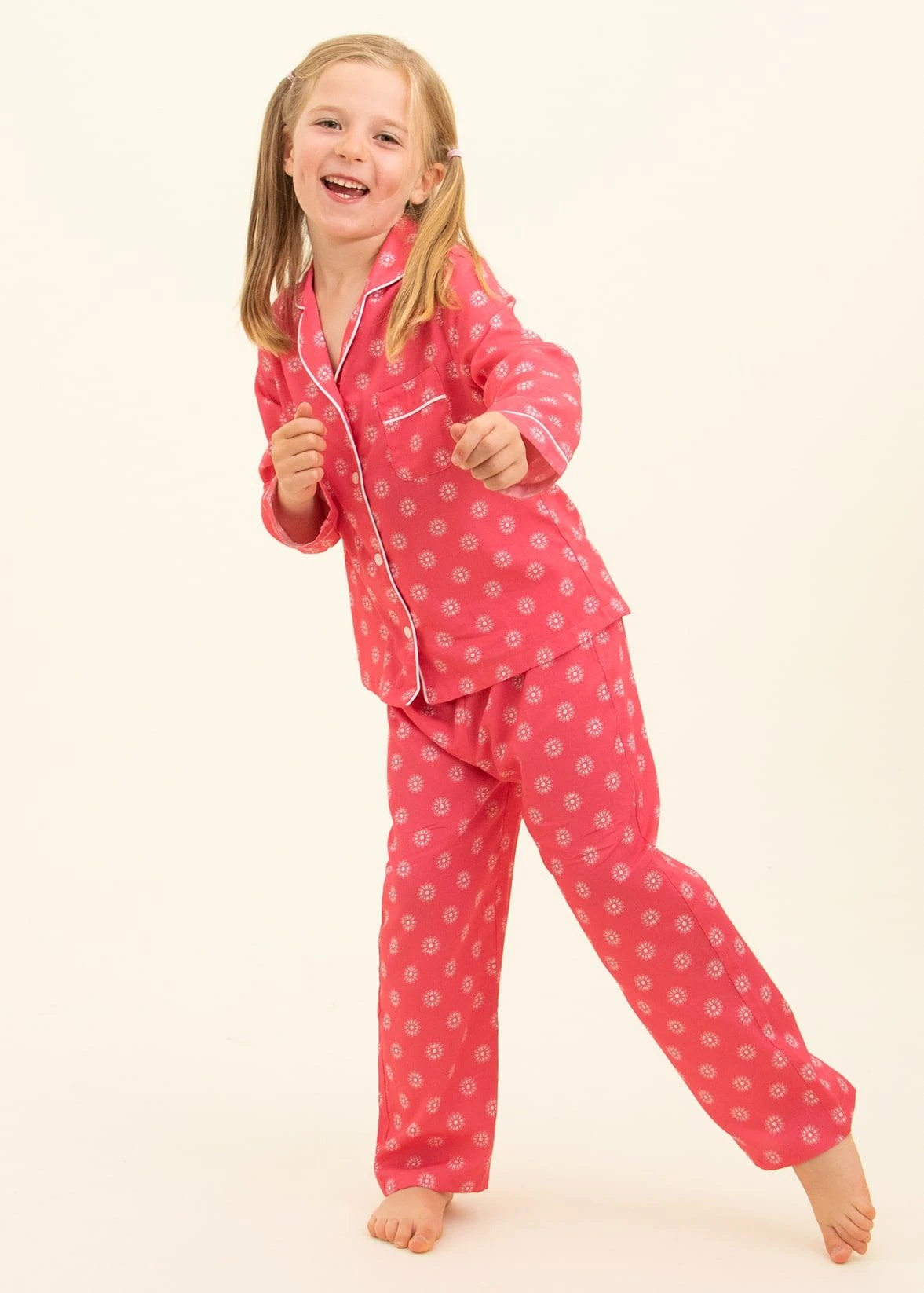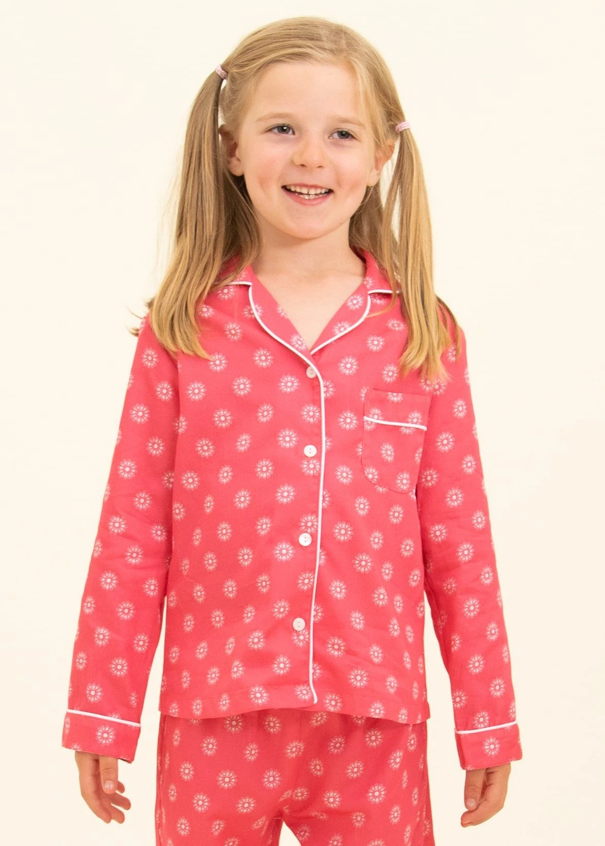 Lightweight, summery pyjamas featuring a pretty pink print with a delicate white and baby blue motif. Finished with white sateen piping and real shell buttons. Matching women’s nightwear and older girl’s pyjamas are also available.