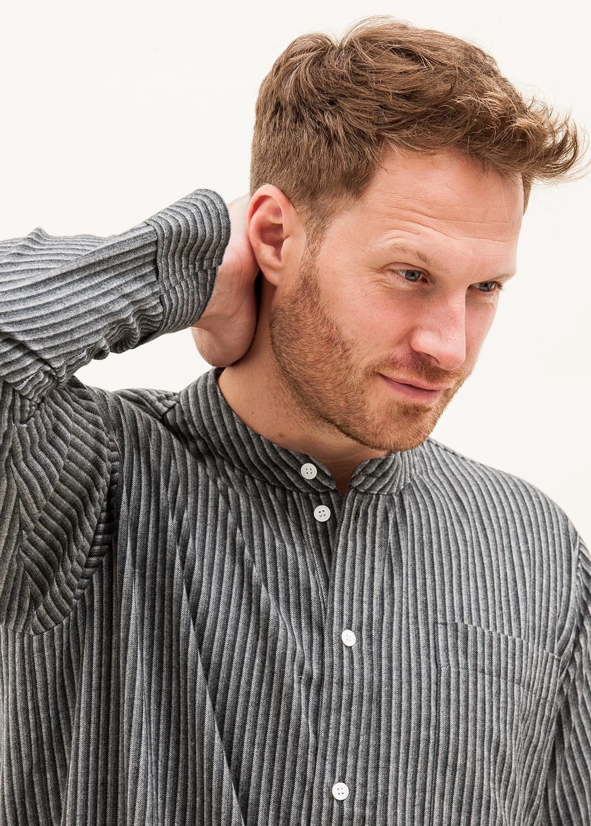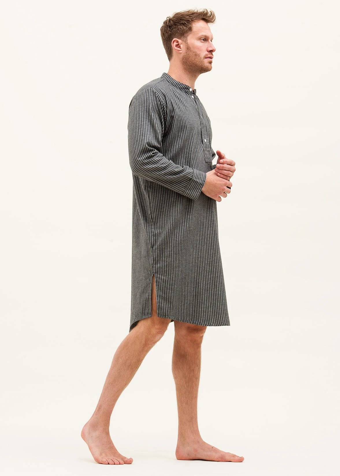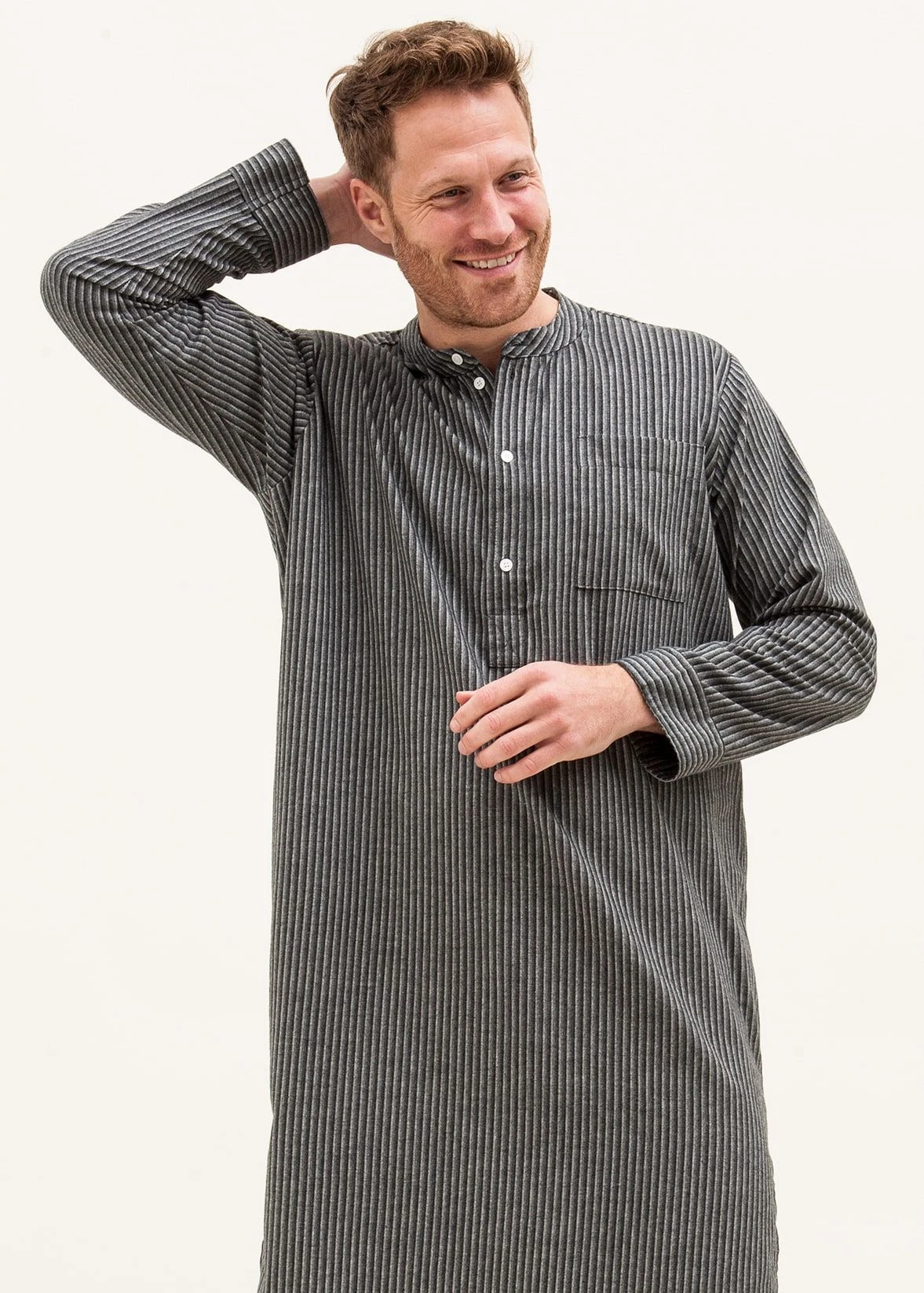 This stylish men’s nightshirt features a smart yet subtle grey stripe. Generously cut with a chic mandarin collar and a gently scooped hem with a side split to allow ease of movement. Finished with a breast pocket, turn ups on the cuffs and real shell buttons. Men’s pyjama bottoms and nightshirt are also available in the same fabric.