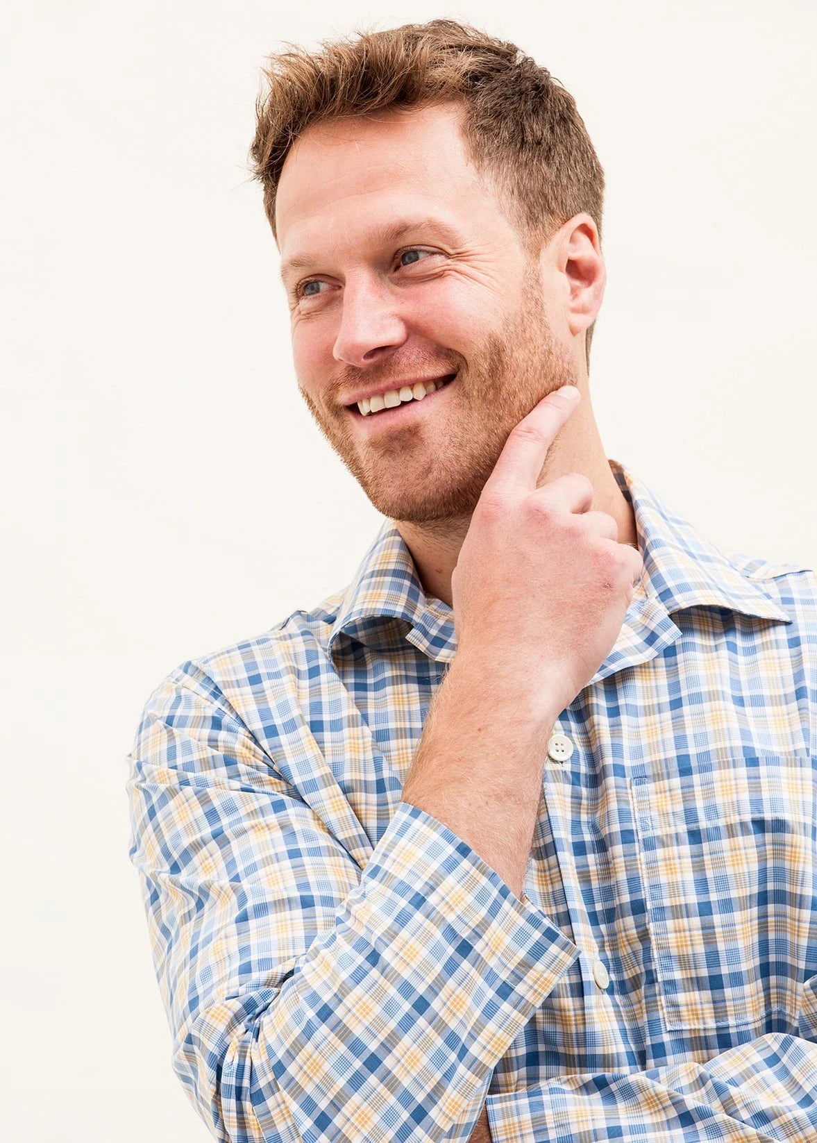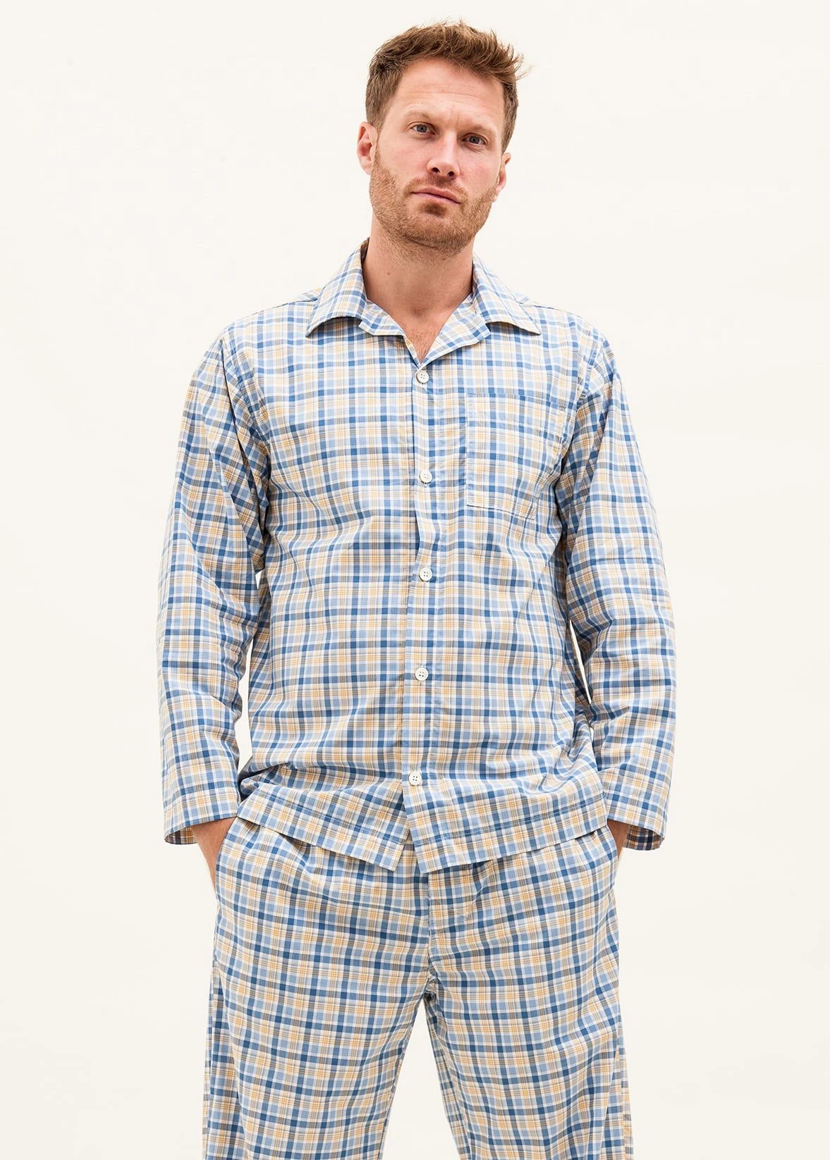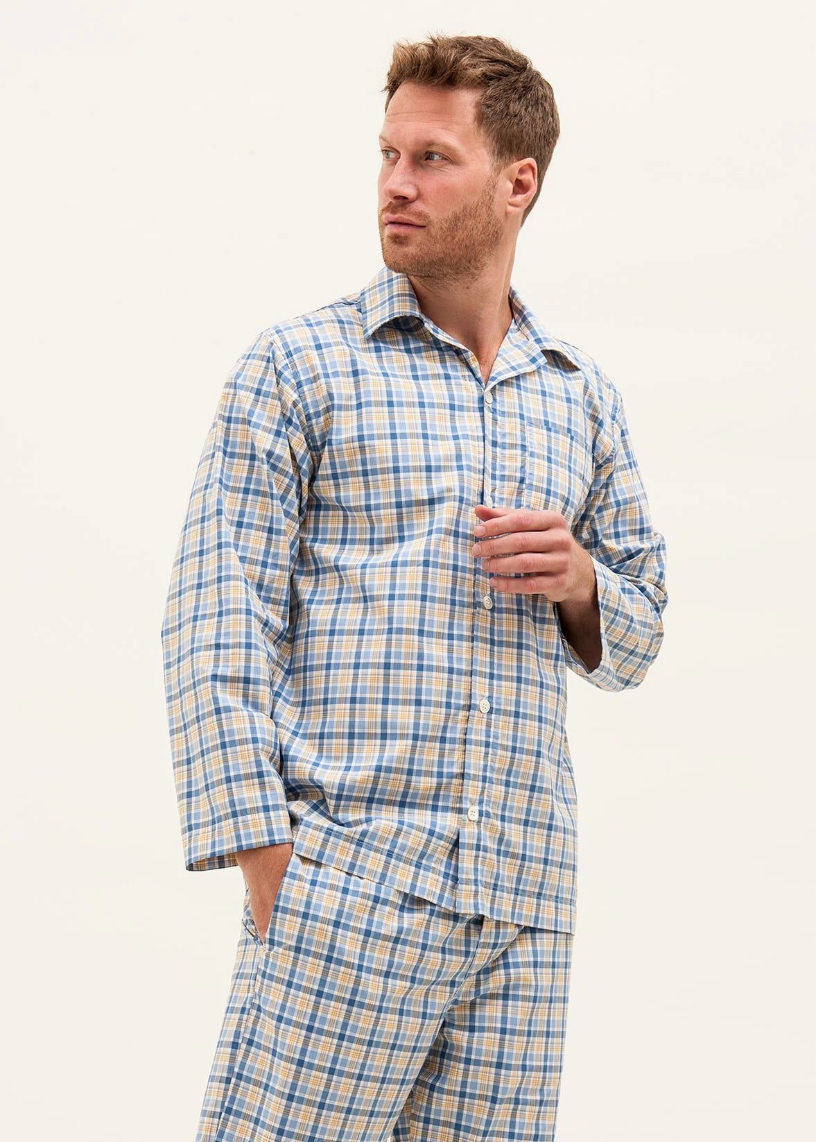 Men’s summer weight pyjamas in a beautifully smooth, high quality cotton poplin. Our classic square collar style jacket, finished with real shell buttons. Straight leg bottoms with side pockets and a single button fly. Available in regular and tall leg. British made.