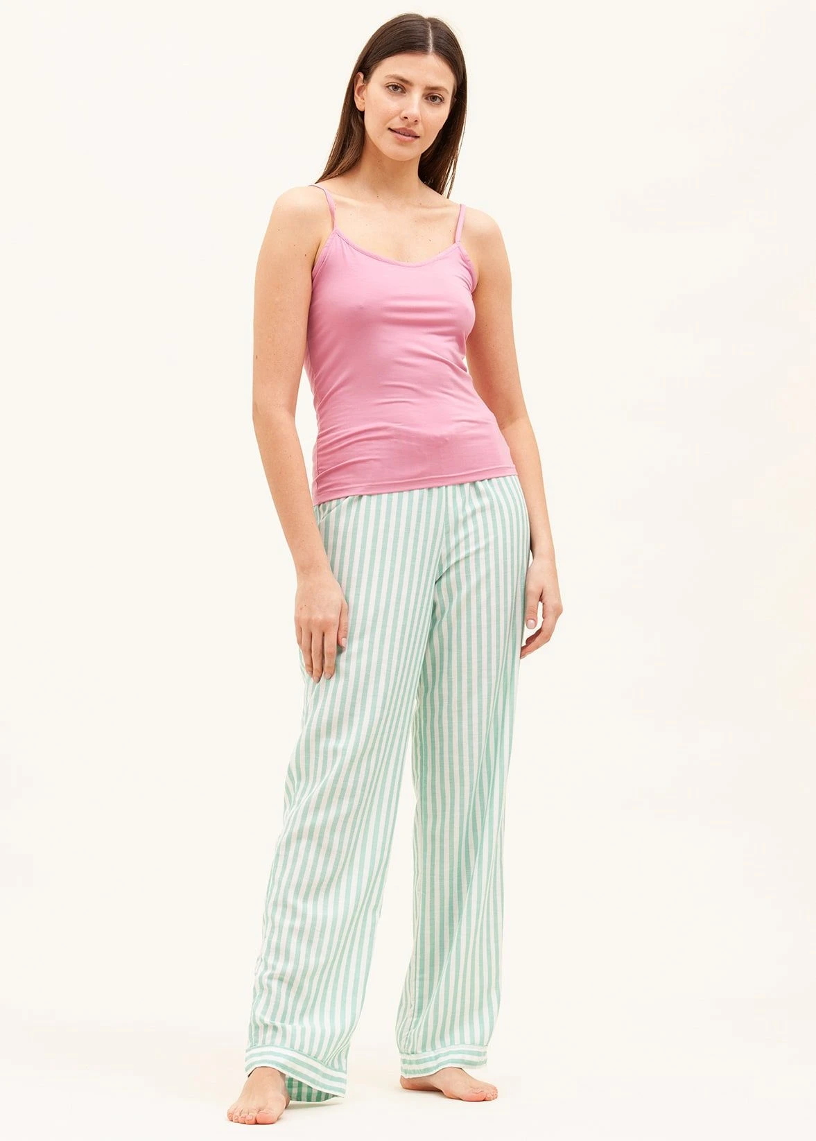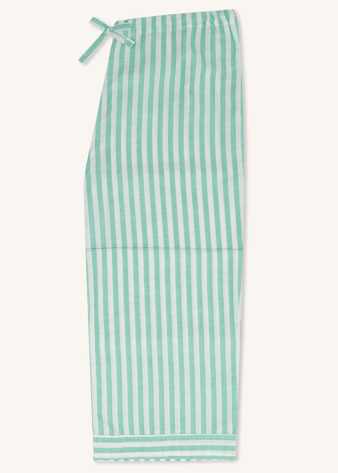 Cotton pyjama bottoms in a fun green and white stripe. This beautiful lightweight twill results in a soft, relaxed fabric with a lovely drape. Finished with stylish turn ups on the hems. Pair them with one of our bamboo jersey vests – we love them with the ivory. Matching pyjama set available too.