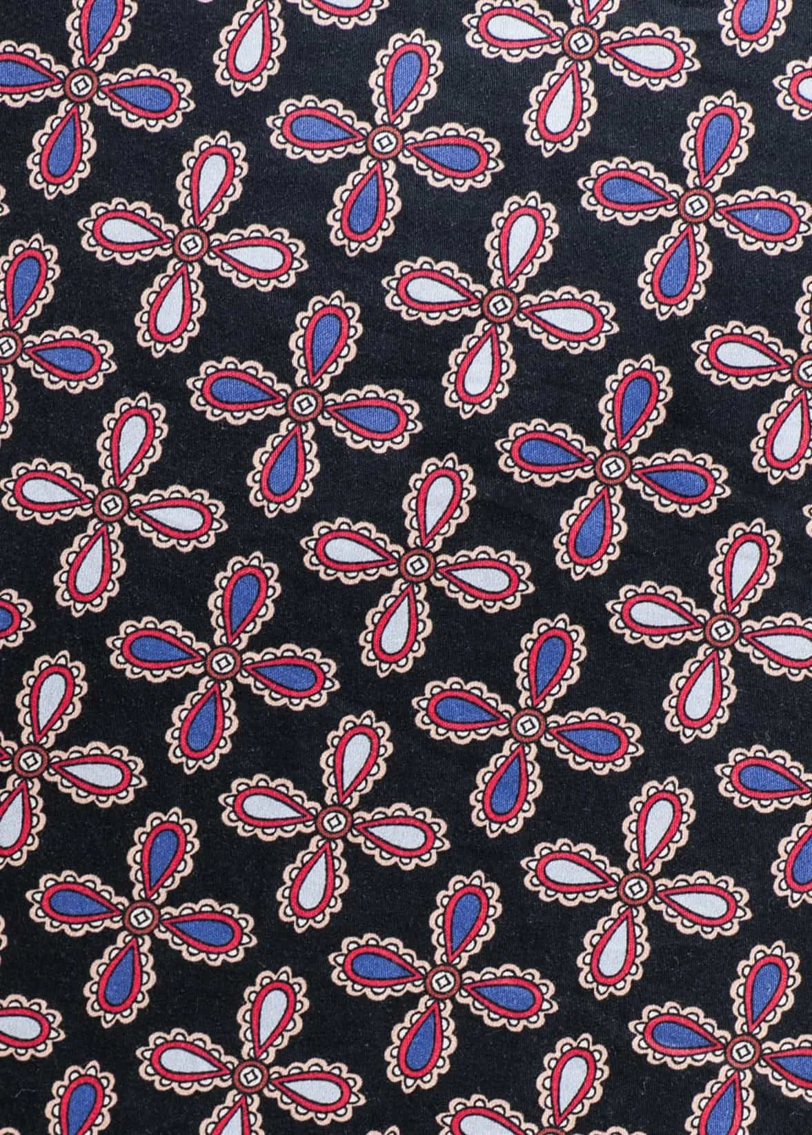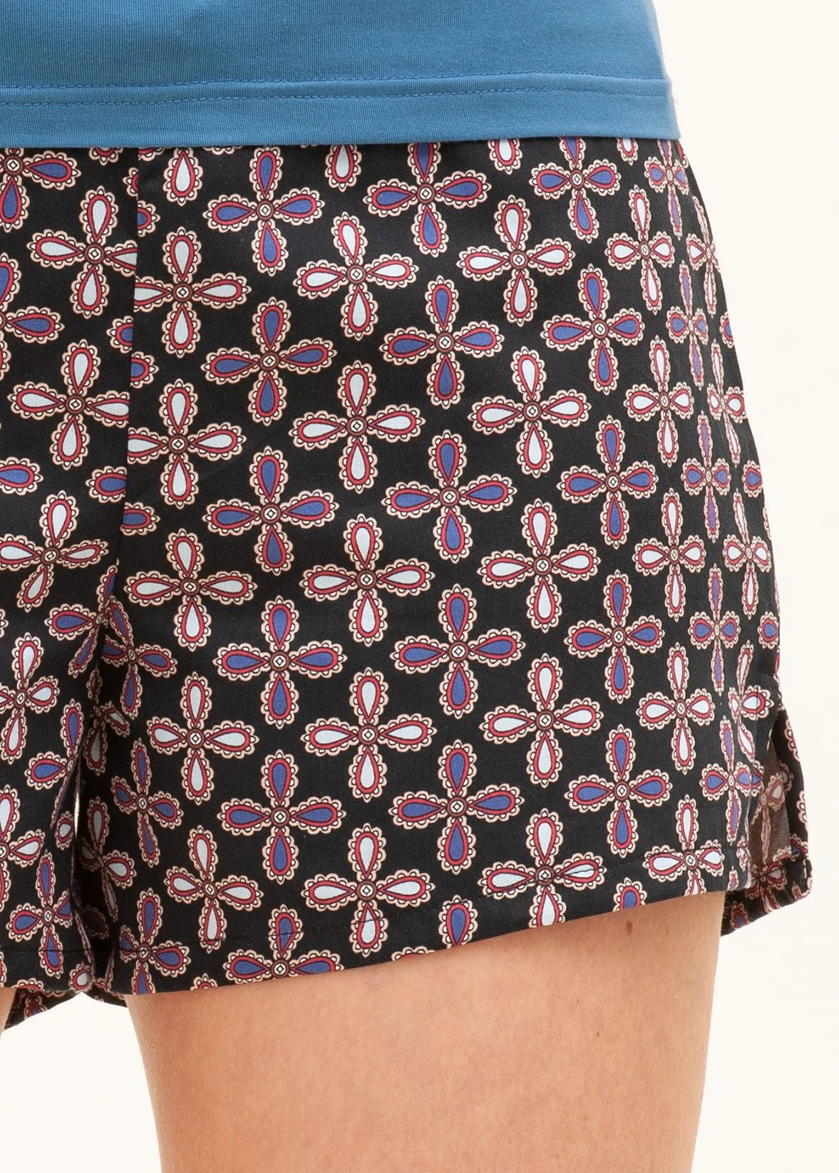 Summery pyjama shorts featuring a fun blue, red and purple motif on a striking black background. Made from a beautiful lightweight cotton. Flattering length and finished with a functional drawstring. Pyjamas and pj bottoms are also available in the same fabric as well as a men’s dressing gown.