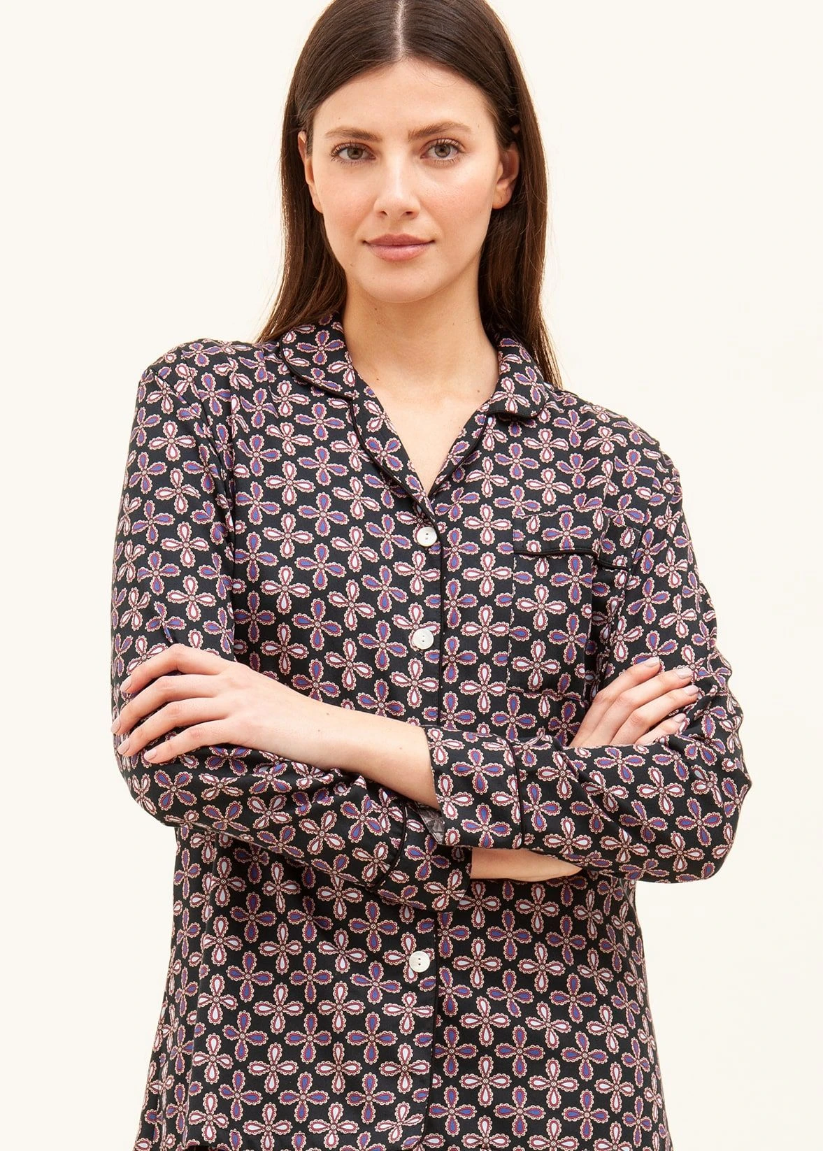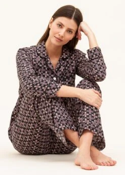 Beautiful lightweight cotton pyjamas with a distinct red, blue and purple motif print on a bold black background. Stylishly finished with black sateen piping and real shell buttons. Available in regular and tall leg lengths. Matching shorts, pj bottoms and men’s dressing gowns available in the same fabric.