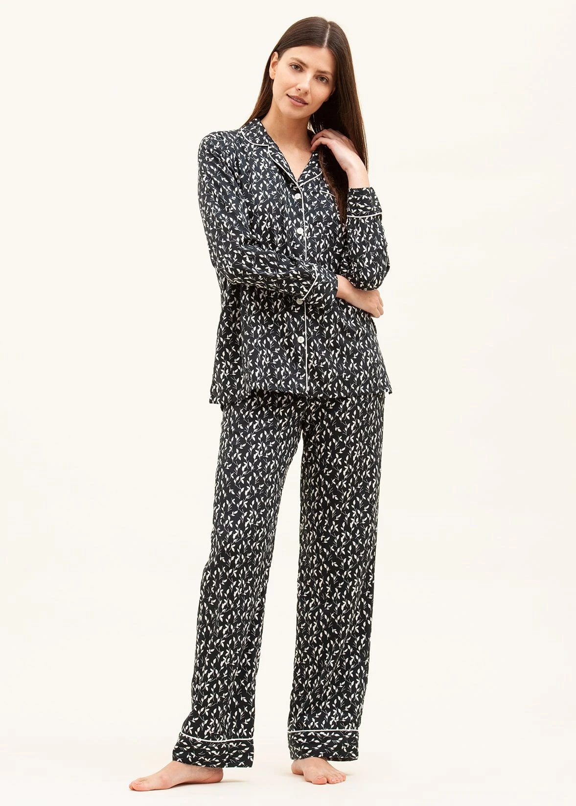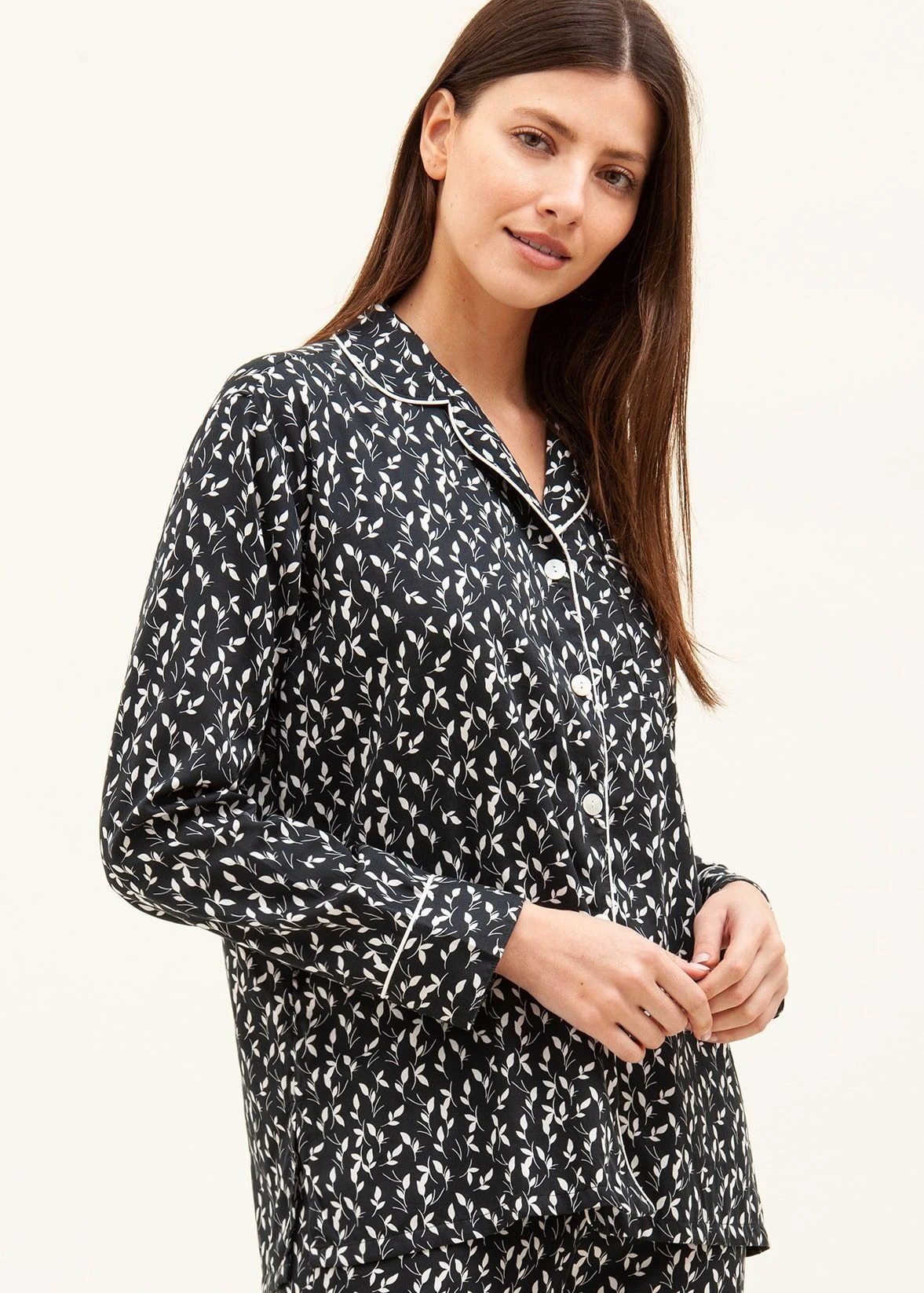 Pretty lightweight pyjamas in a delicate black and ivory leaf print. This high yarn count cotton is incredibly smooth to the touch and perfect for those who prefer a lighter weight fabric. Finished with ivory piping on the jacket and trouser turn ups. Available in three lengths; regular, tall and extra tall. Trousers also sold separately for those not needing the jacket.