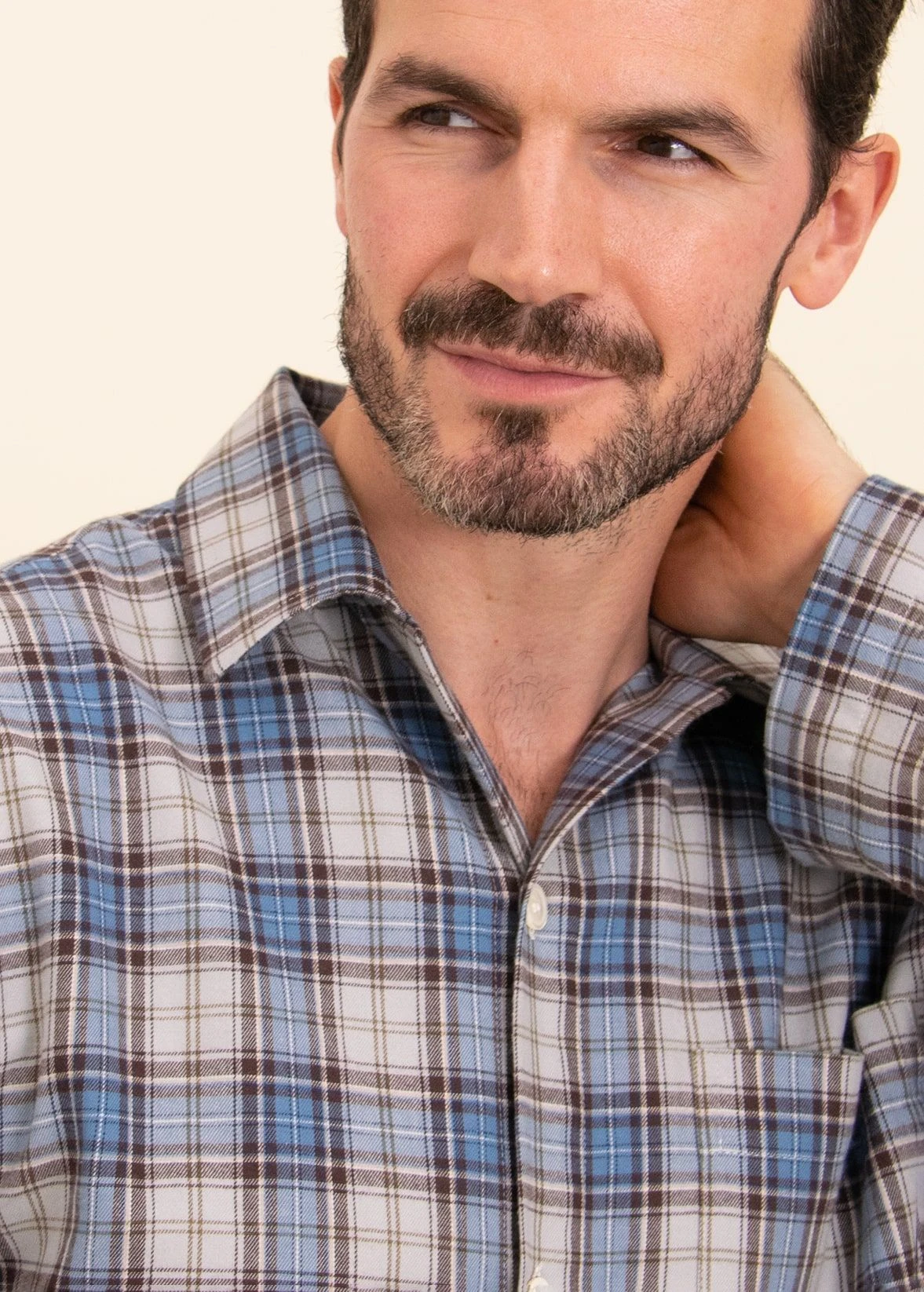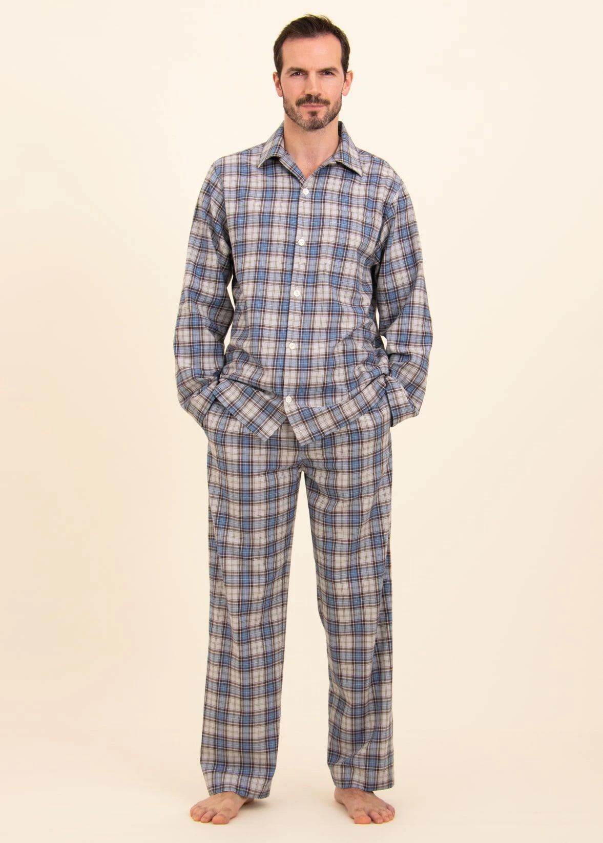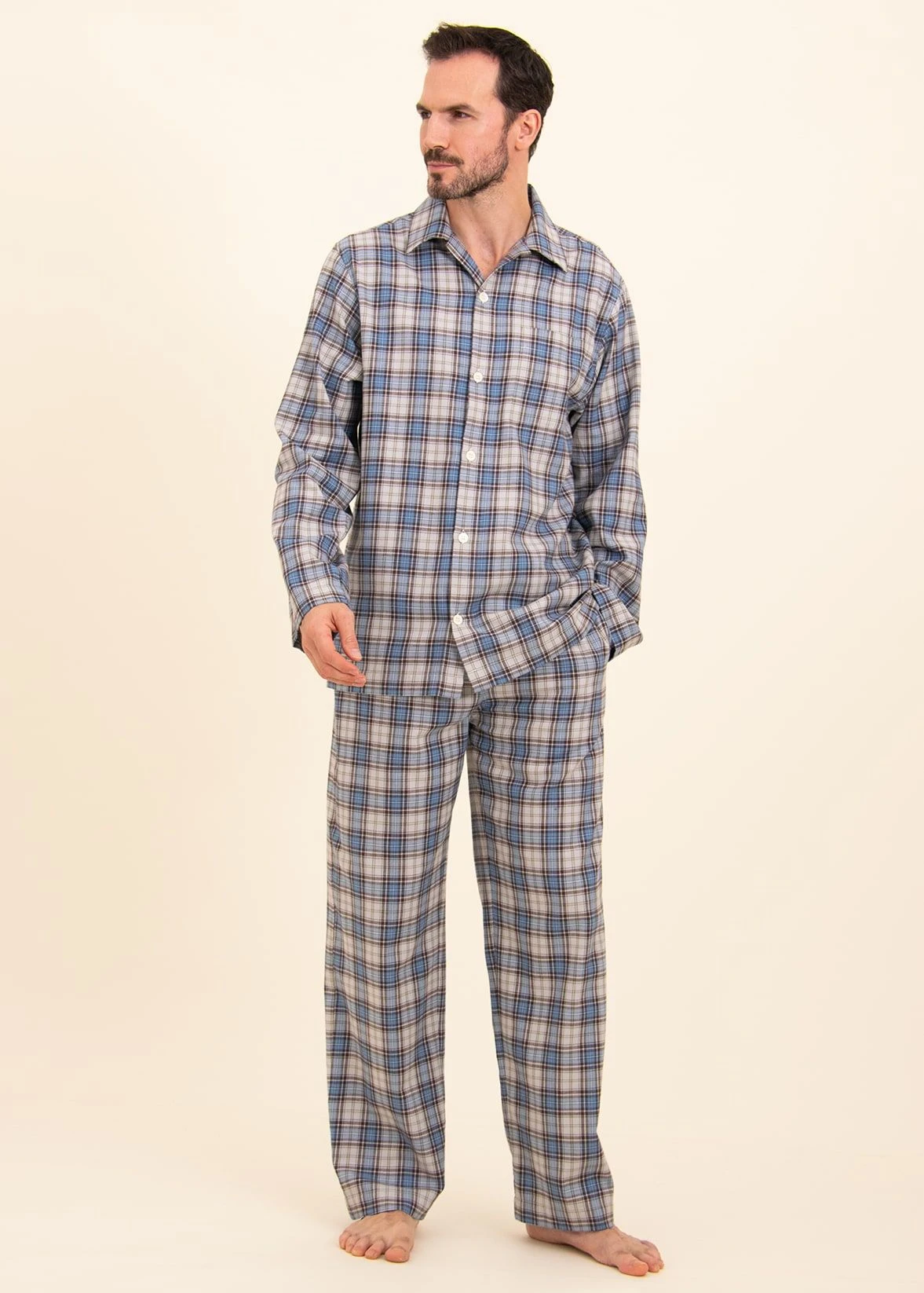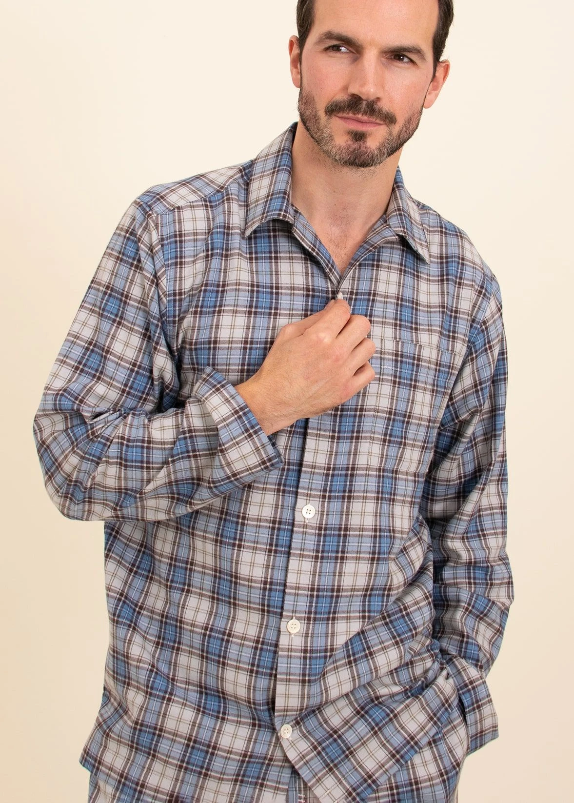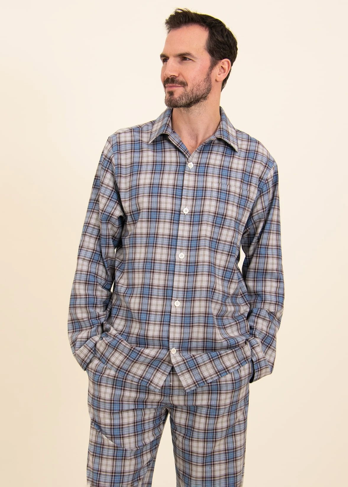An old favourite is back! These soft organic cotton pyjamas are available in our regular and tall sizes. This blue and silvery grey check can also be found in the women’s collection.