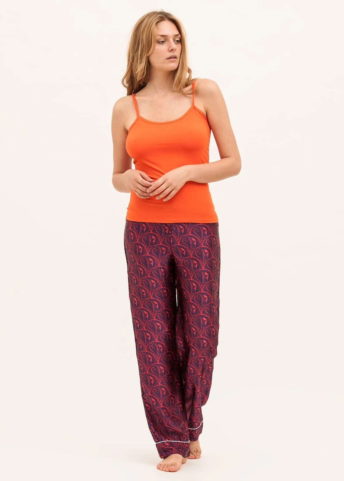 Luxury silk pyjama bottoms in a stunning heart print interspersed with song birds. Beautifully finished with French seams and contrasting ivory silk piping on the trouser hems. Flattering straight leg cut with a flat fronted waist and elasticated back. We love these with our sunset orange or coral bamboo jersey vests. Also available as a full pyjama set. Model height: 5’10” – wearing S Tall.