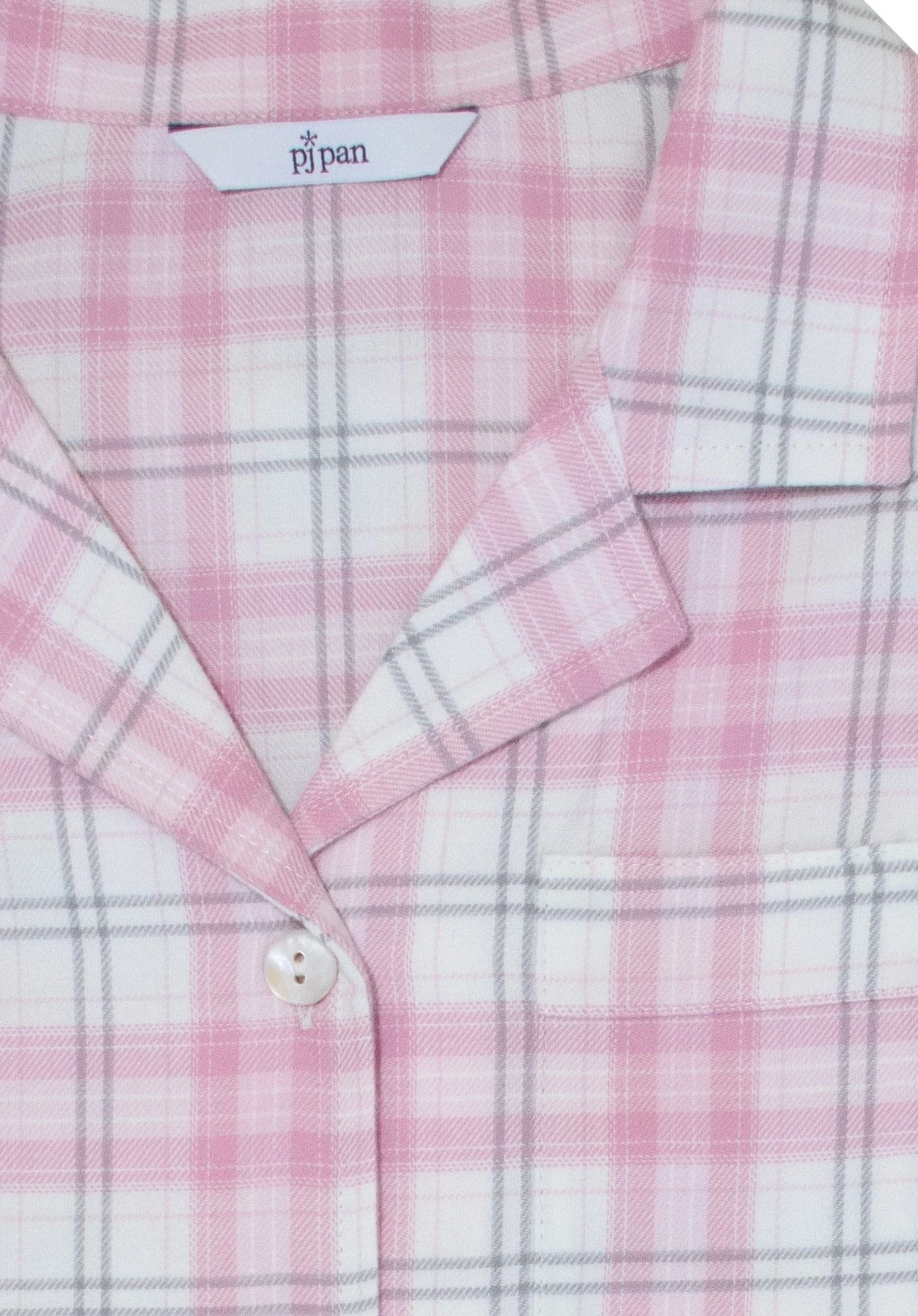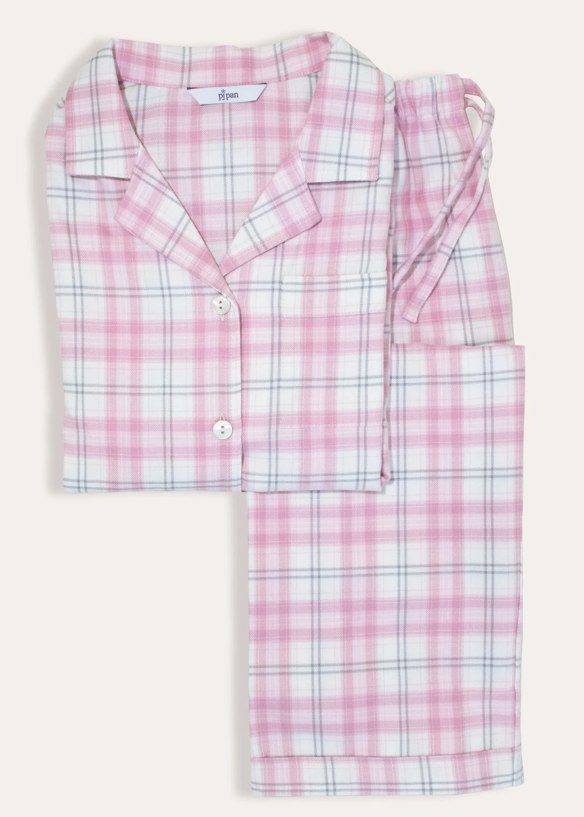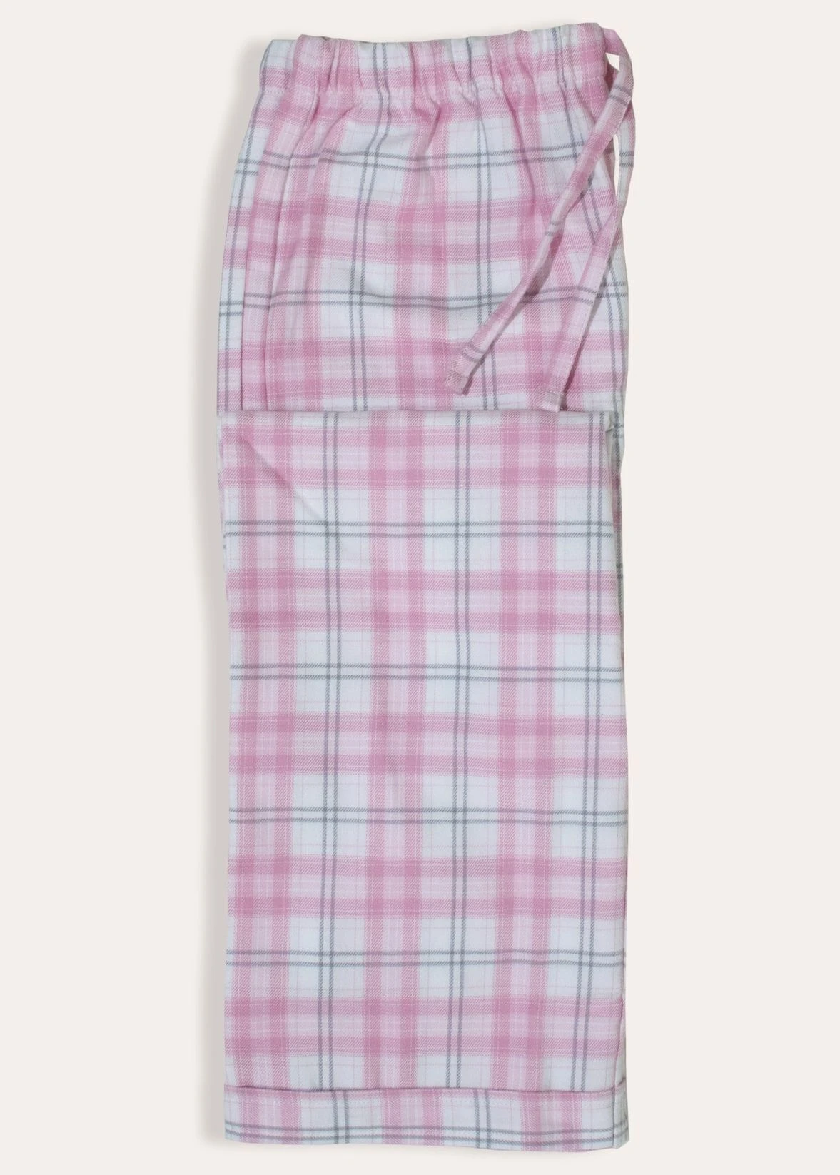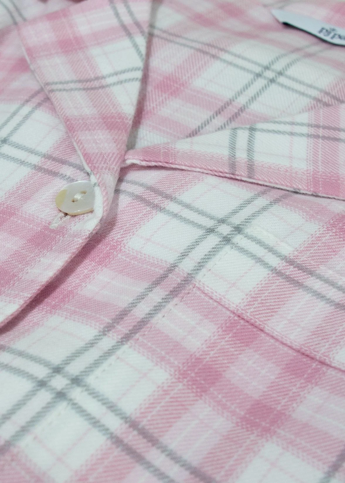 Girl’s luxury brushed cotton pyjamas in a pretty pink and cream check. Relaxed fit pj bottoms with a gently elasticated waist and a functional drawstring. The jacket is finished with cream piping and real shell buttons. Matching women’s pyjamas are also available if you’re looking for mother and daughter nightwear.