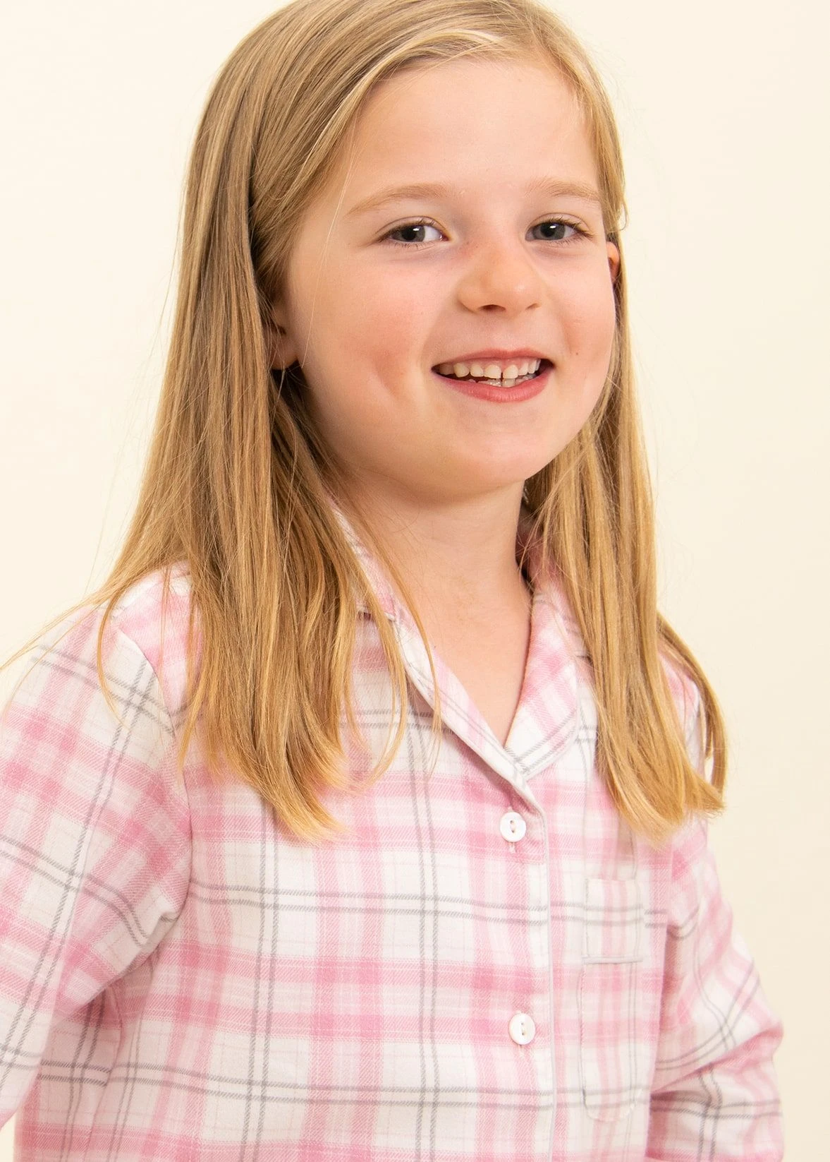 A pretty pink and white check for the girls. Luxury brushed cotton pyjamas finished with real shell buttons and cream piping. This fabric is also available in 11-14yrs nightwear as well as in the women’s collection for those looking to buy matching mother and daughter pyjamas.