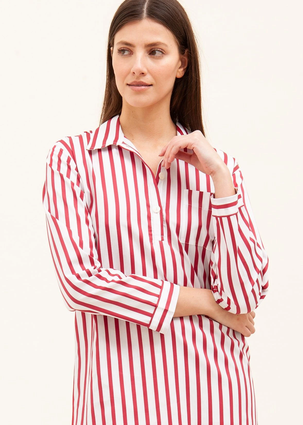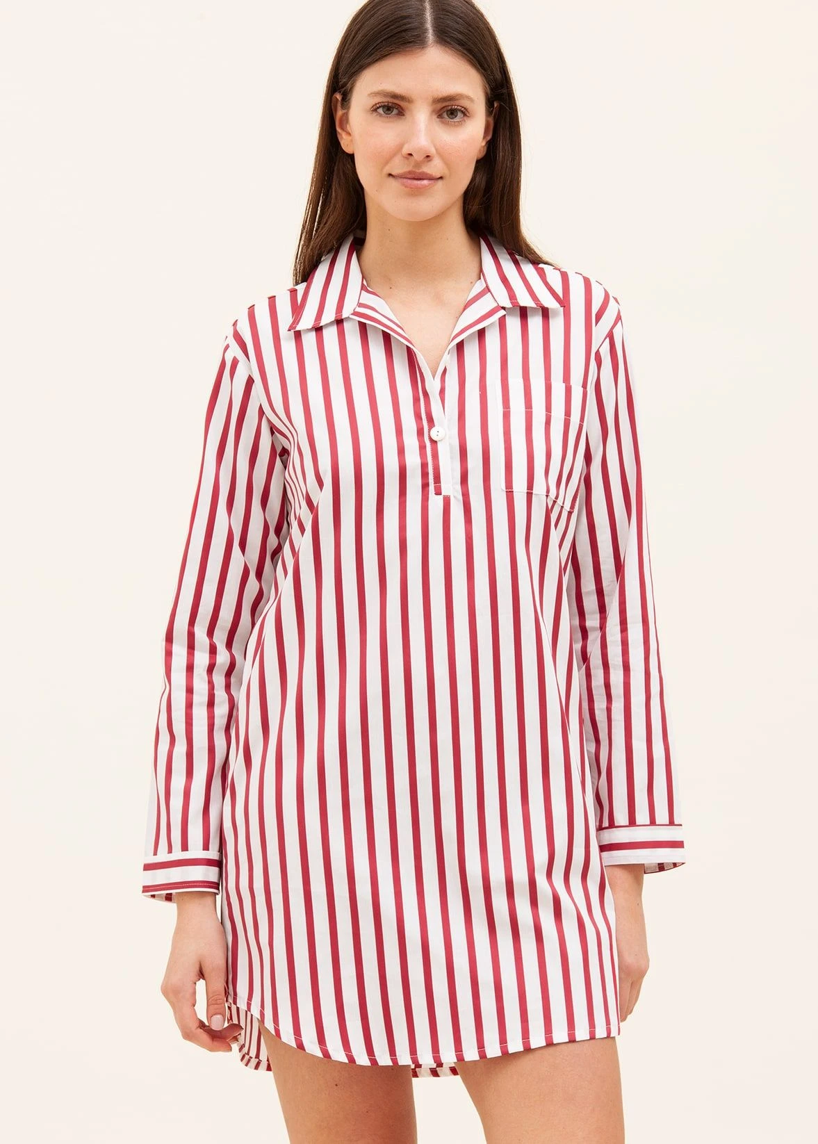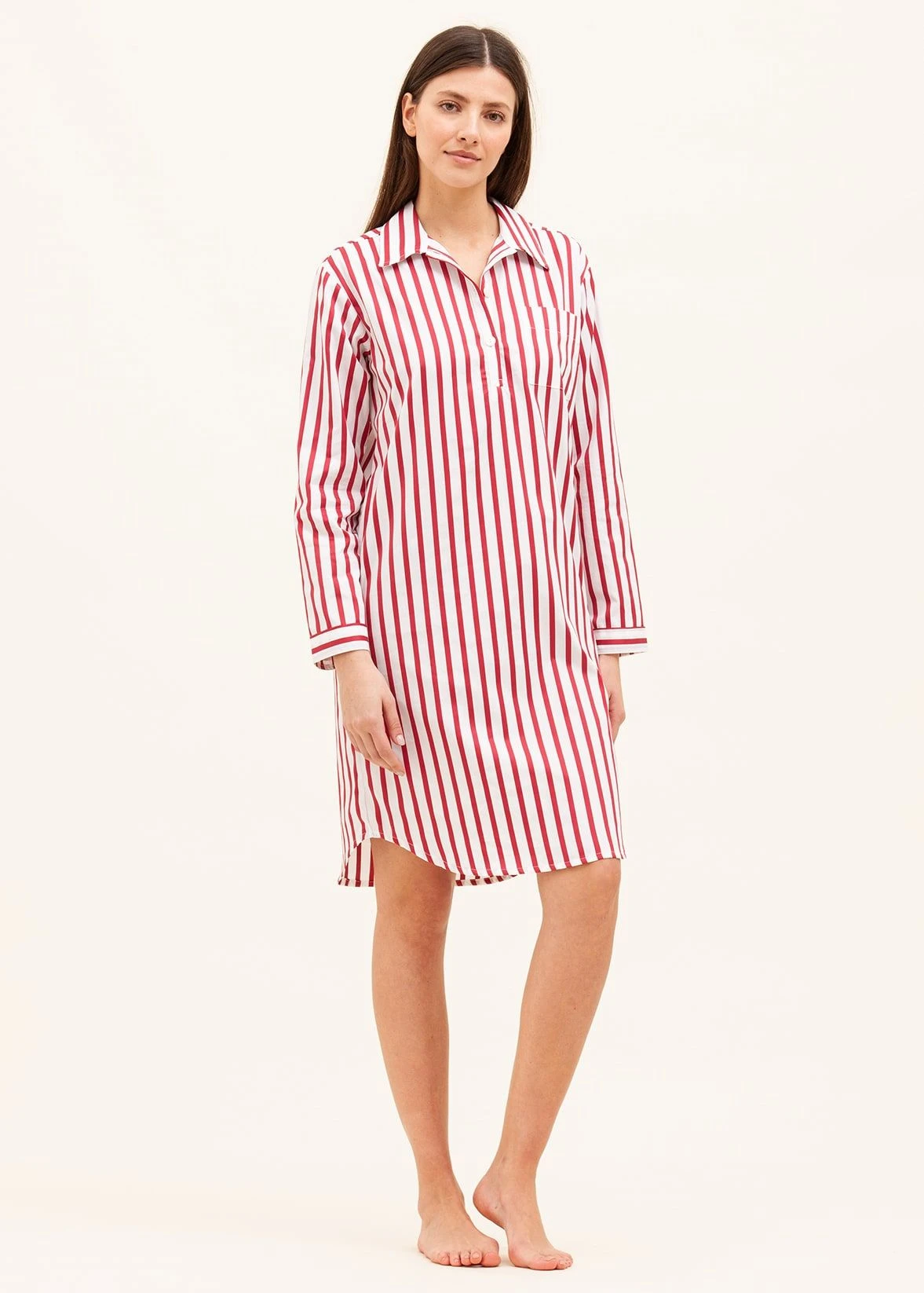 This luxury white cotton nightshirt features a stylish red satin stripe. Available in both our shorter and longer lengths. Matching items available in the same fabric. Please note that our nightshirts do come up slightly smaller than our pyjamas so we suggest going up a size.