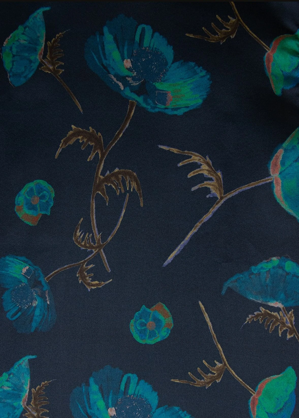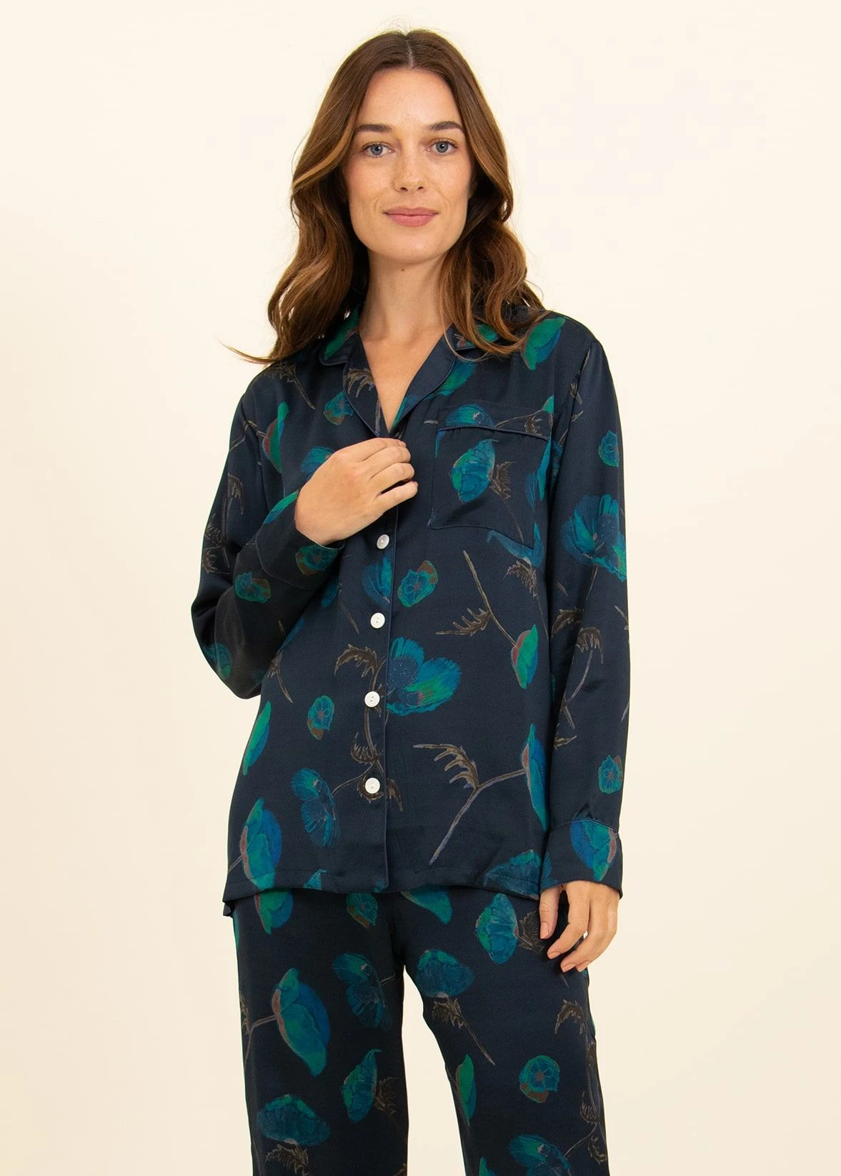 Luxury silk pyjamas in a stunning blue and turquoise floral print on a deep midnight blue. Our most luxurious pyjama style – this cut features a gently tapered waist and French seams throughout, giving a neater, stronger finish to the seams. Our usual straight leg pyjama bottoms with a flat fronted waistband and a gently elasticated back. Finished with real shell buttons and navy piping. Pyjama bottoms are also sold separately for those not wanting the jacket.