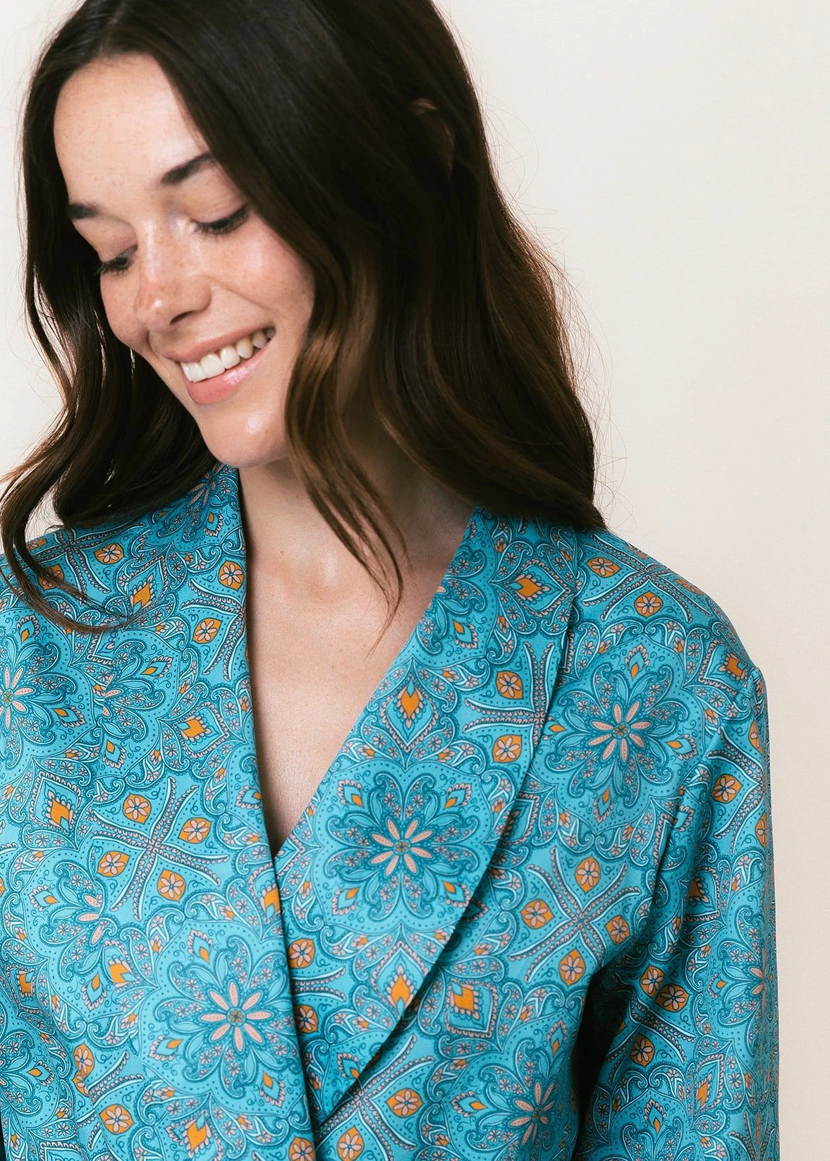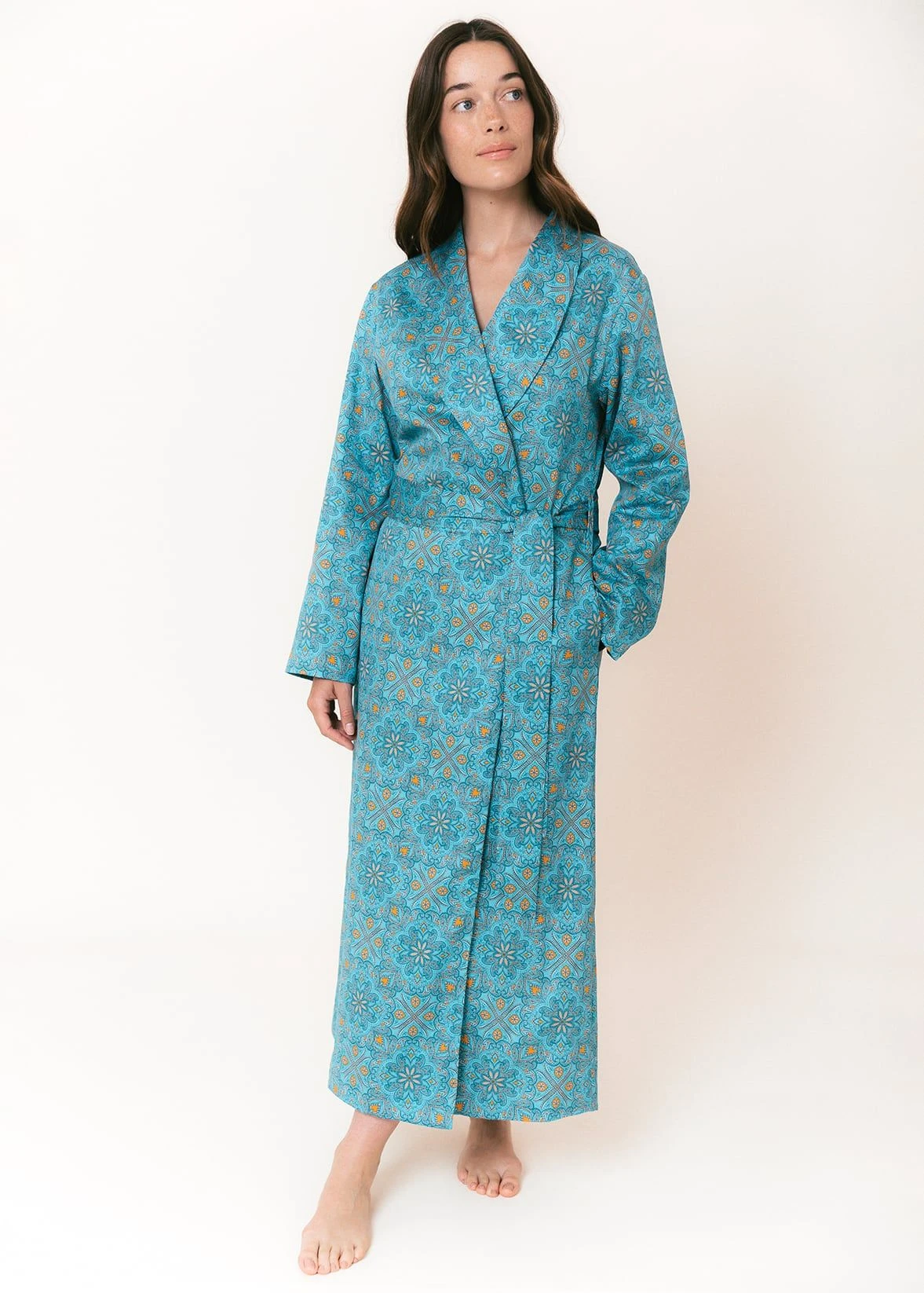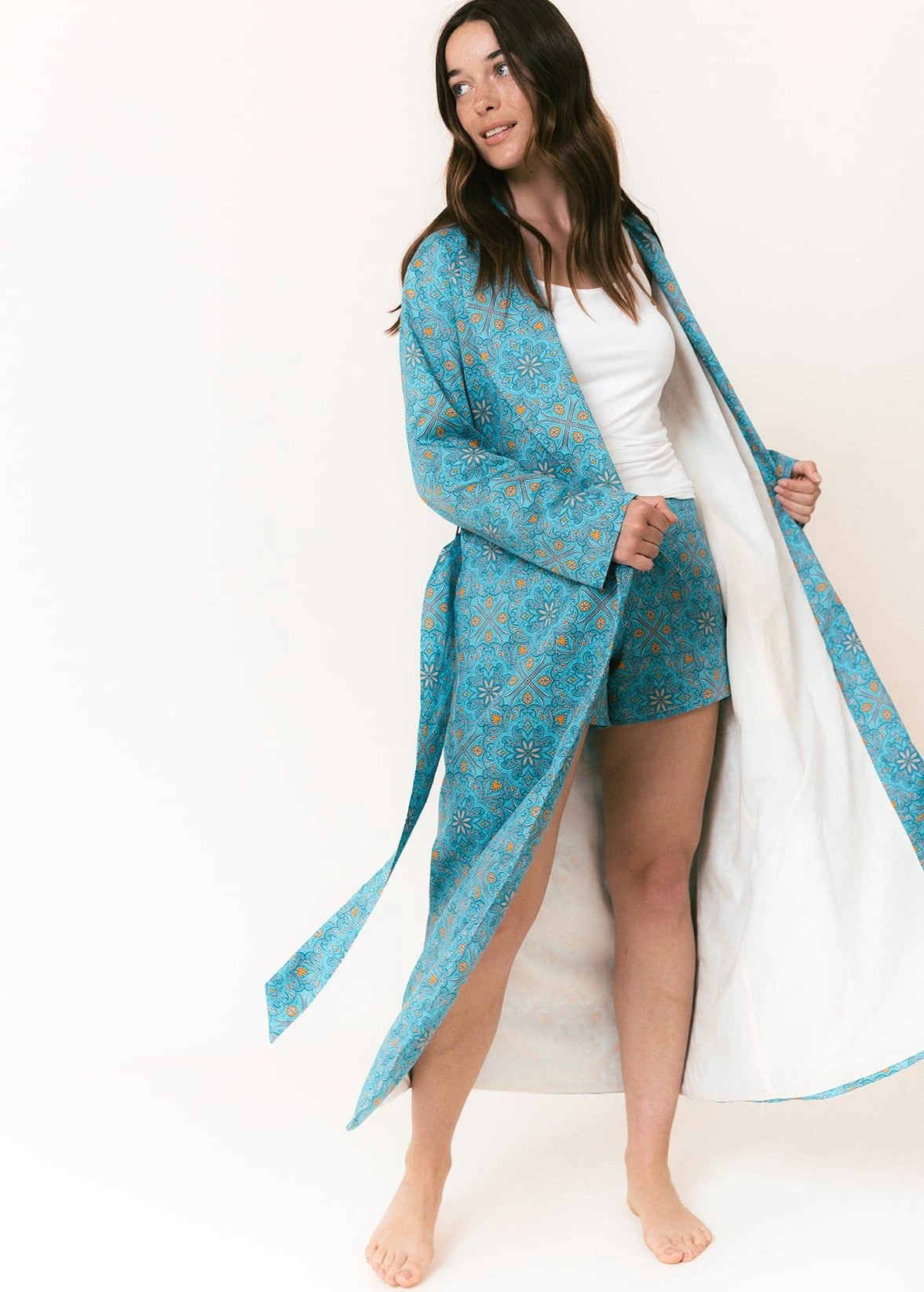 Luxury cotton dressing gown in a pretty blue and orange geometric print. Fully lined with a lightweight cream cotton. Finished with a feminine shawl collar, a removable tie around the waist and two side pockets. Matching items available in the women’s collection and you will also find this print in the men’s collection but in a different shade of blue. Don’t miss our Rhapsody handmade soap!