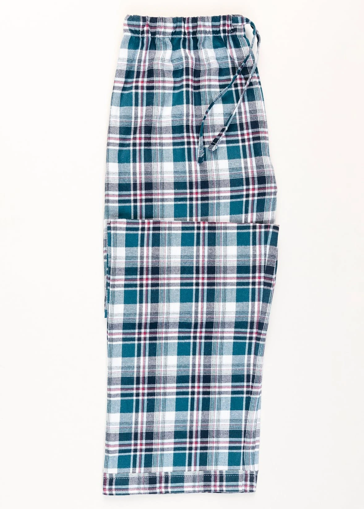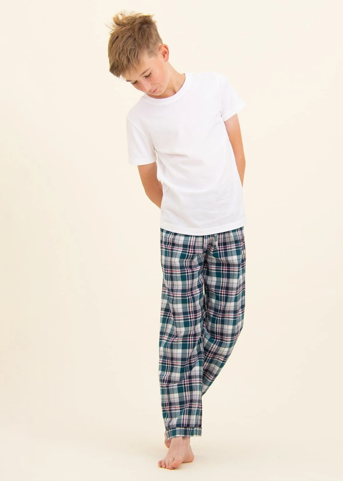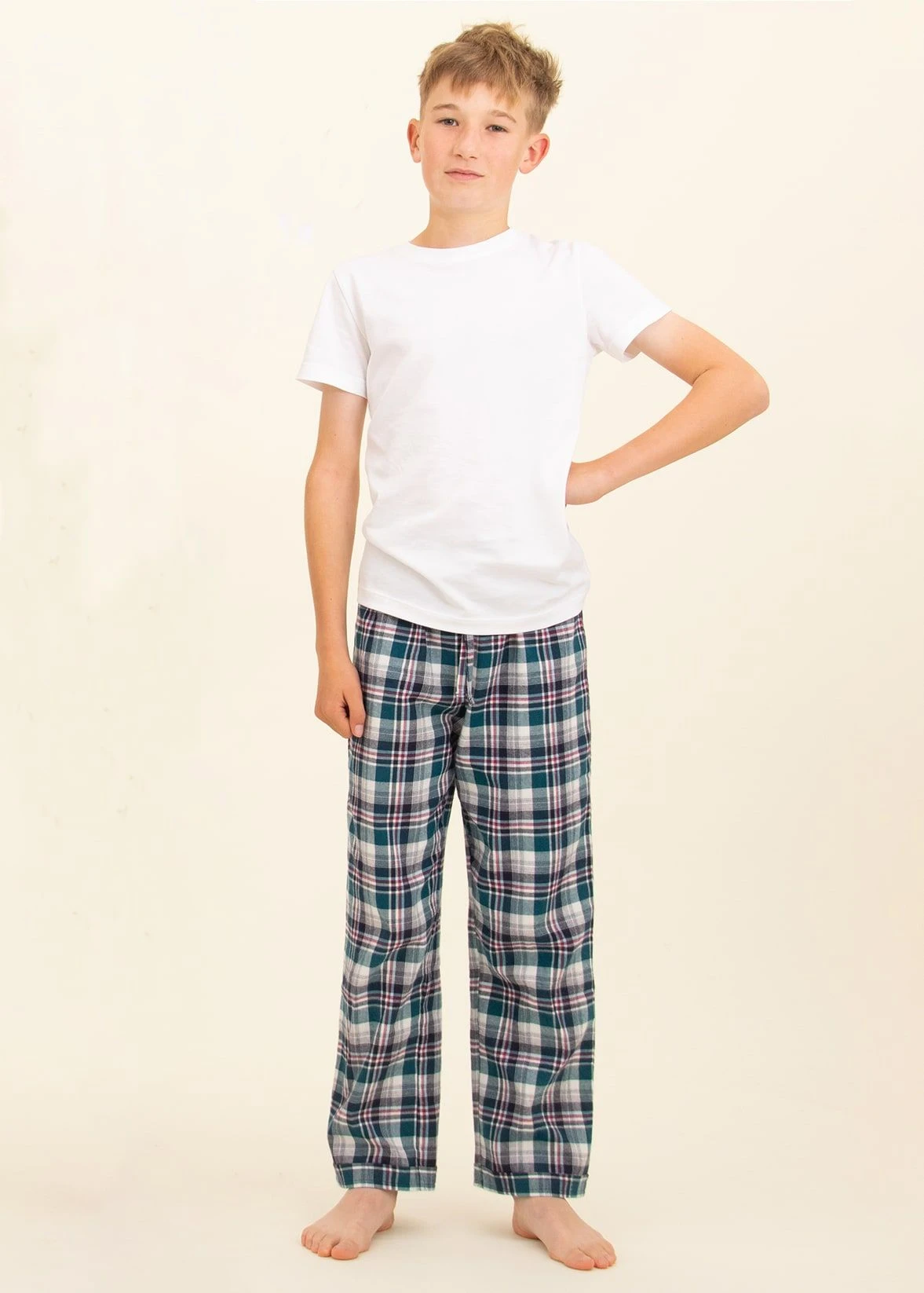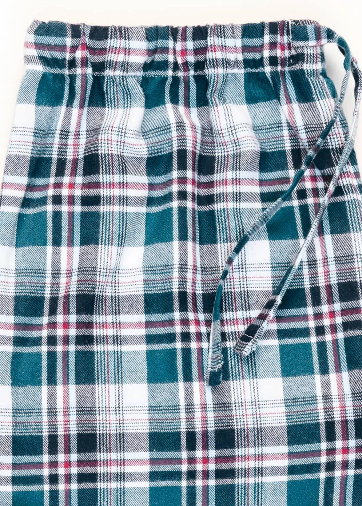 Super soft pyjama bottoms in a green and white check with a flash of pink. Finished with stylish turn ups on the hems and an elasticated waist with functional drawstring. This is one of our fabrics that can be found in the men’s and women’s collections for those looking for matching family nightwear.