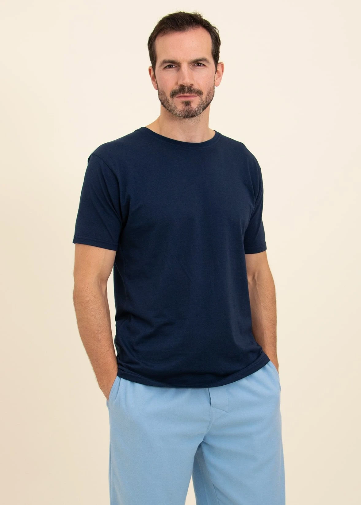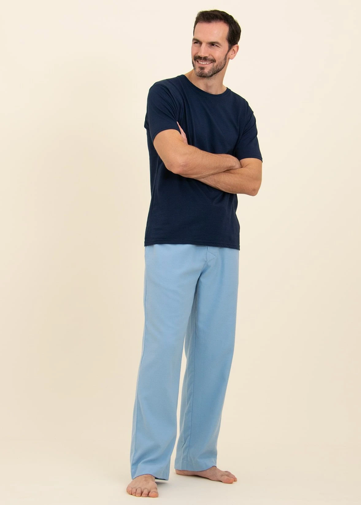 A stylish plain blue pair of pyjama bottoms in a warm brushed cotton. This blue herringbone is one of our heavier cottons for those looking for something a little warmer. Finished with two side pockets and a single button fly. Available in our regular and tall leg sizes. The tall sizes gives you two extra inches.