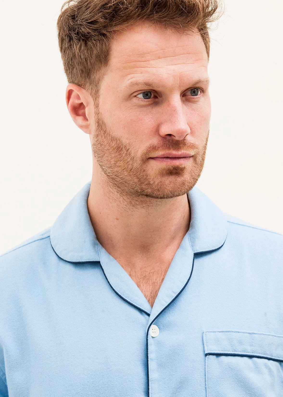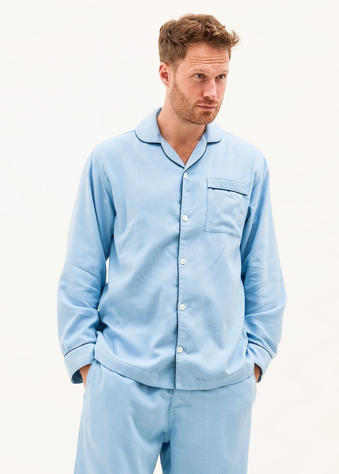A stylish plain blue pair of pyjamas in a warm brushed cotton. This blue herringbone is one of our heavier cottons for those looking for something a little warmer. Finished with navy piping, two side pockets and a single button fly. Available in our regular and tall leg sizes. The tall sizes gives you two extra inches on the leg length and extra inches on the sleeves and jacket length. Trousers are also sold separately for those not needing the jacket.