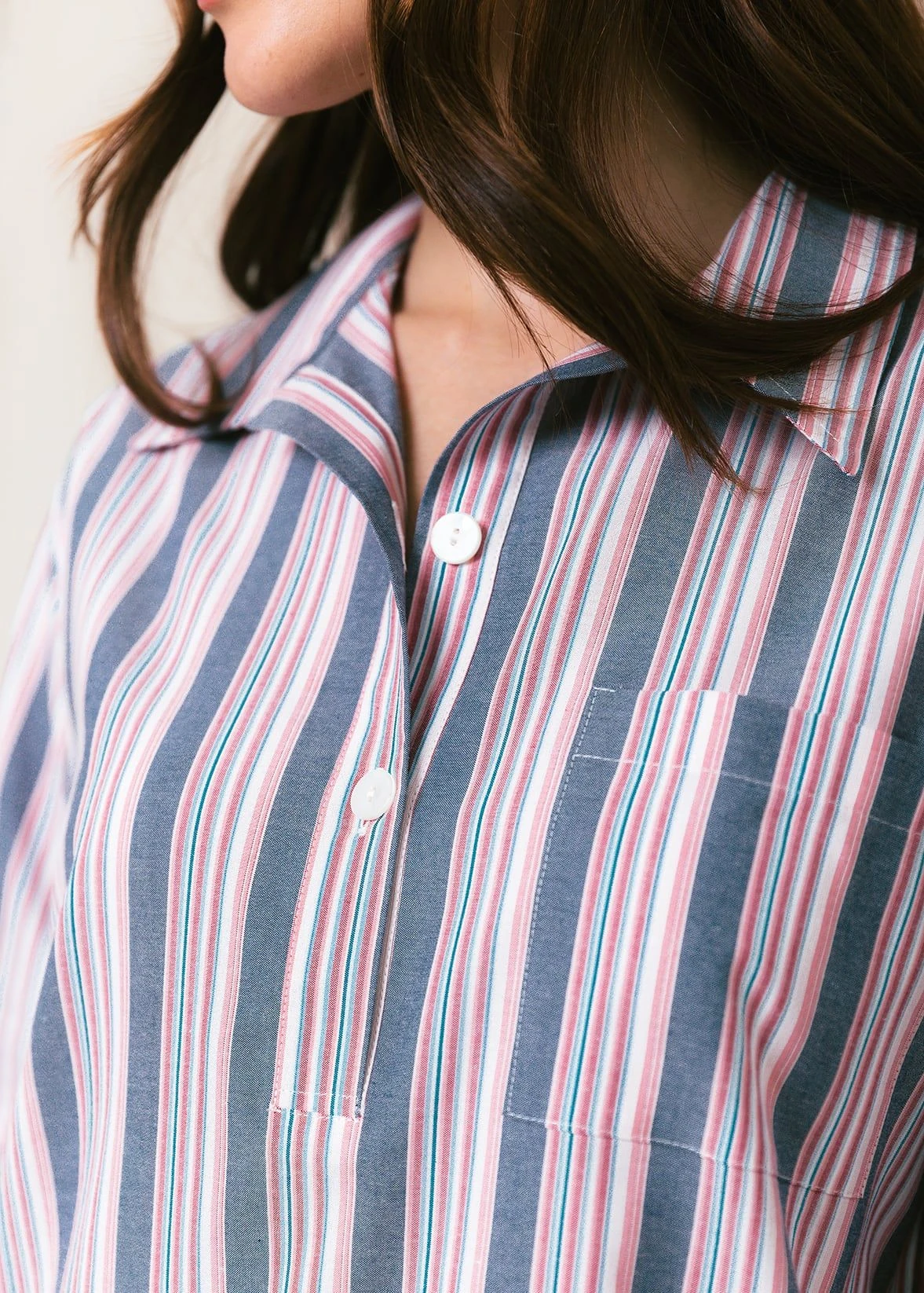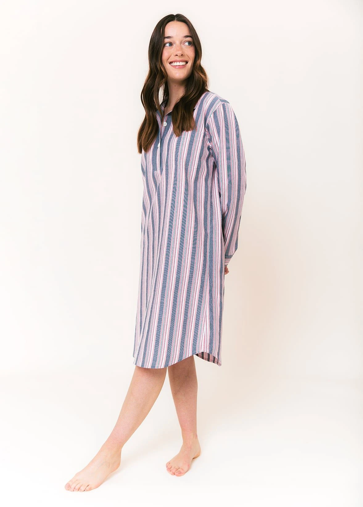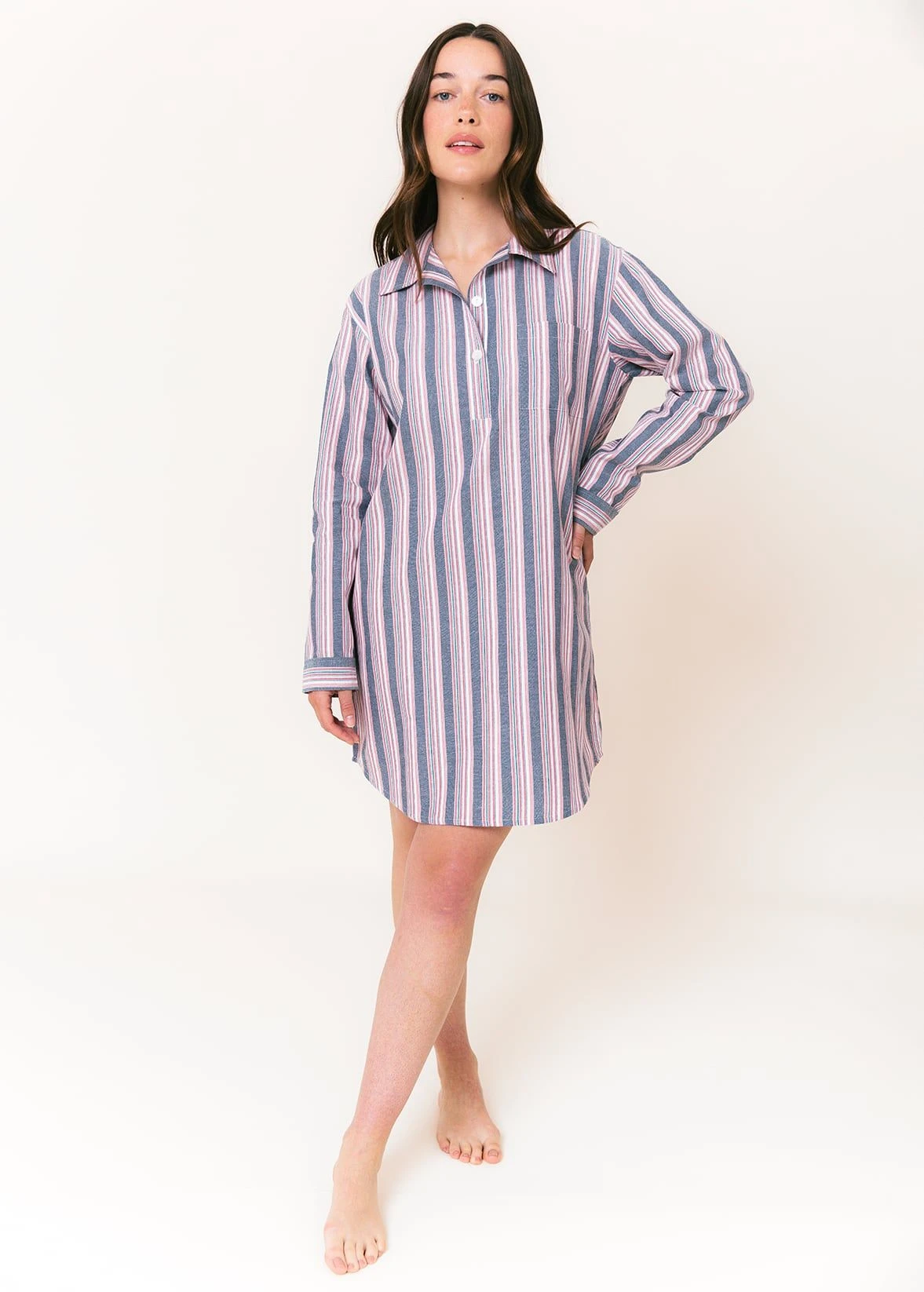 This blue, pink and white stripe nightshirt is available in both mid thigh and knee length. Finished with a feminine scooped hem and real shell buttons. Matching items available in the women’s and men’s collection. Matching children’s pj bottoms coming soon!