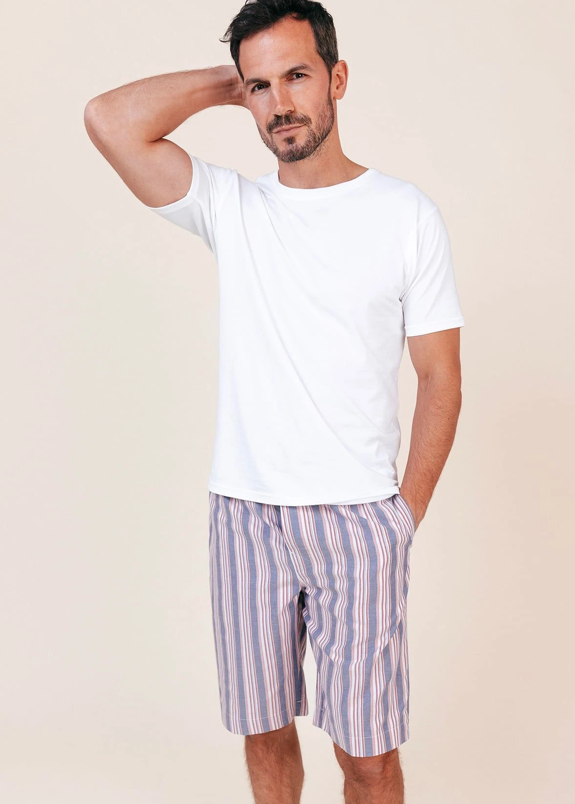 Pair these fun blue, pink and white stripe pj shorts with one of our navy or white organic cotton t-shirts. Other matching items available in the same fabric.