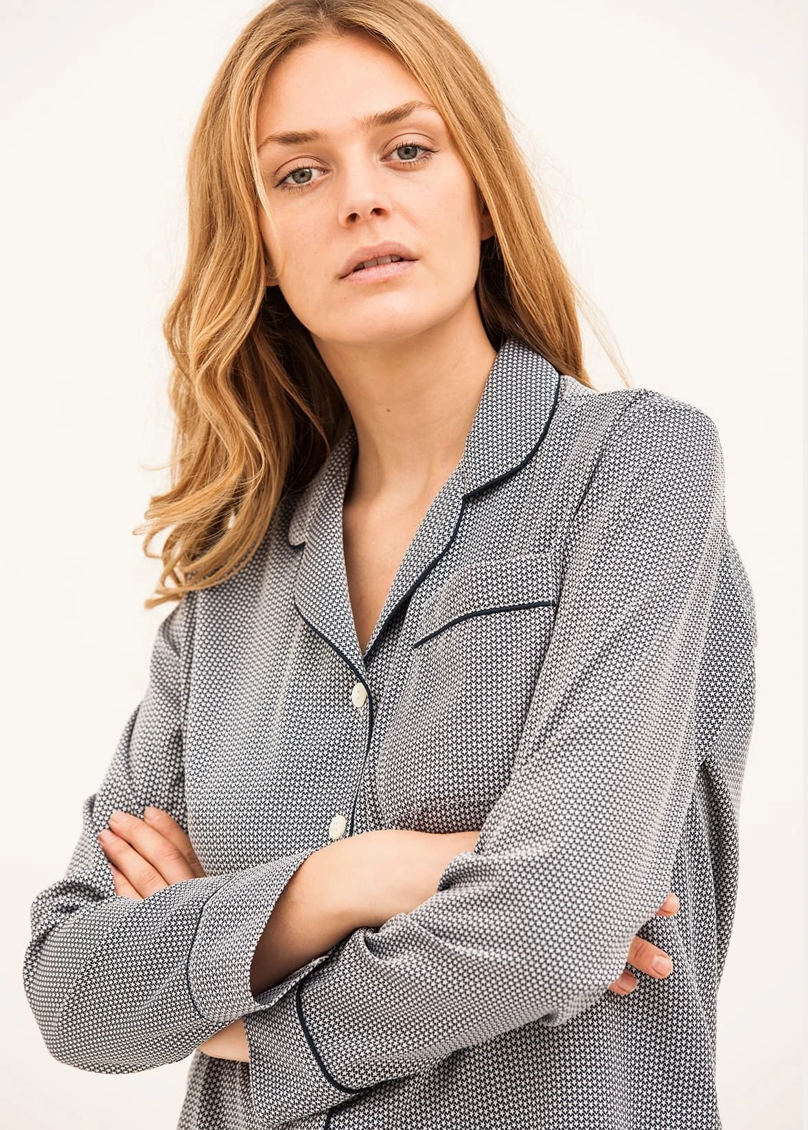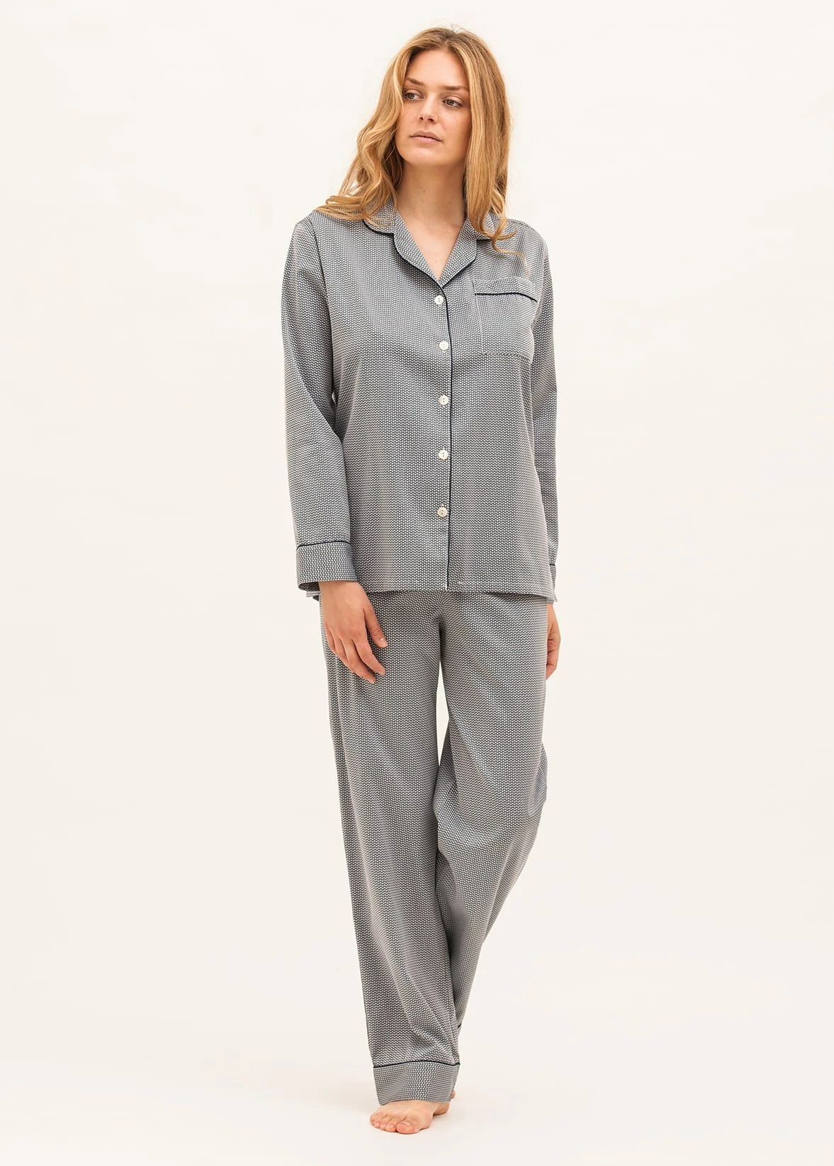 Striking pyjamas in a luxury two fold cotton featuring a white star jacquard on a dark navy blue background. Finished with contrasting navy sateen piping on the jacket and trouser hems. Stylish modern design. Available in our regular and tall leg. This star fabric also comes in red. Made in the UK like our entire nightwear collection.