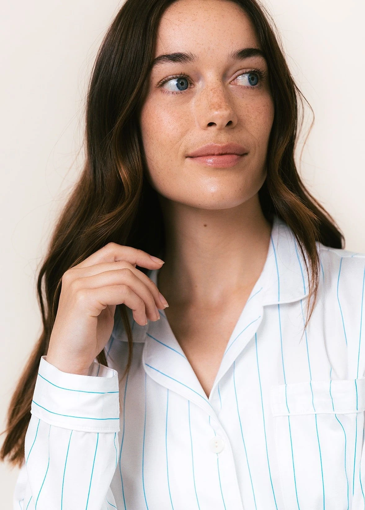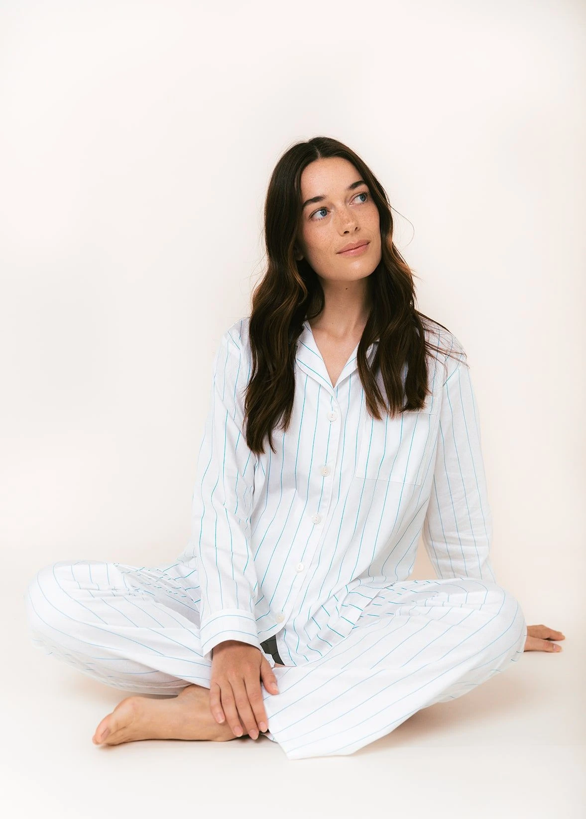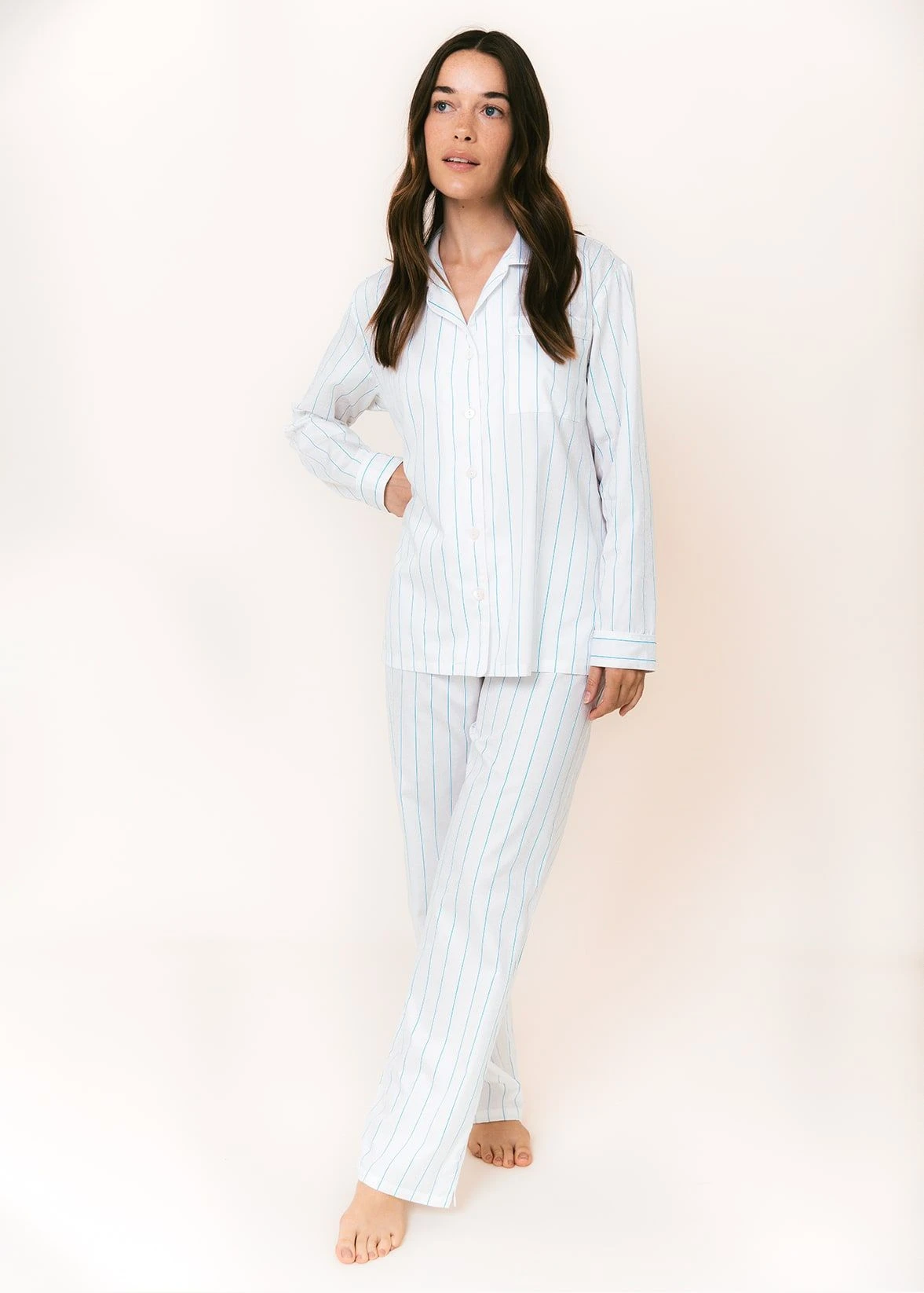Stunning white cotton sateen pyjamas with a subtle yet stylish aqua stripe. A sophisticated and timeless design. The flattering round collar jacket is finished with real shell buttons along with white sateen piping. Available in regular and tall sizes. Matching nightshirt available.