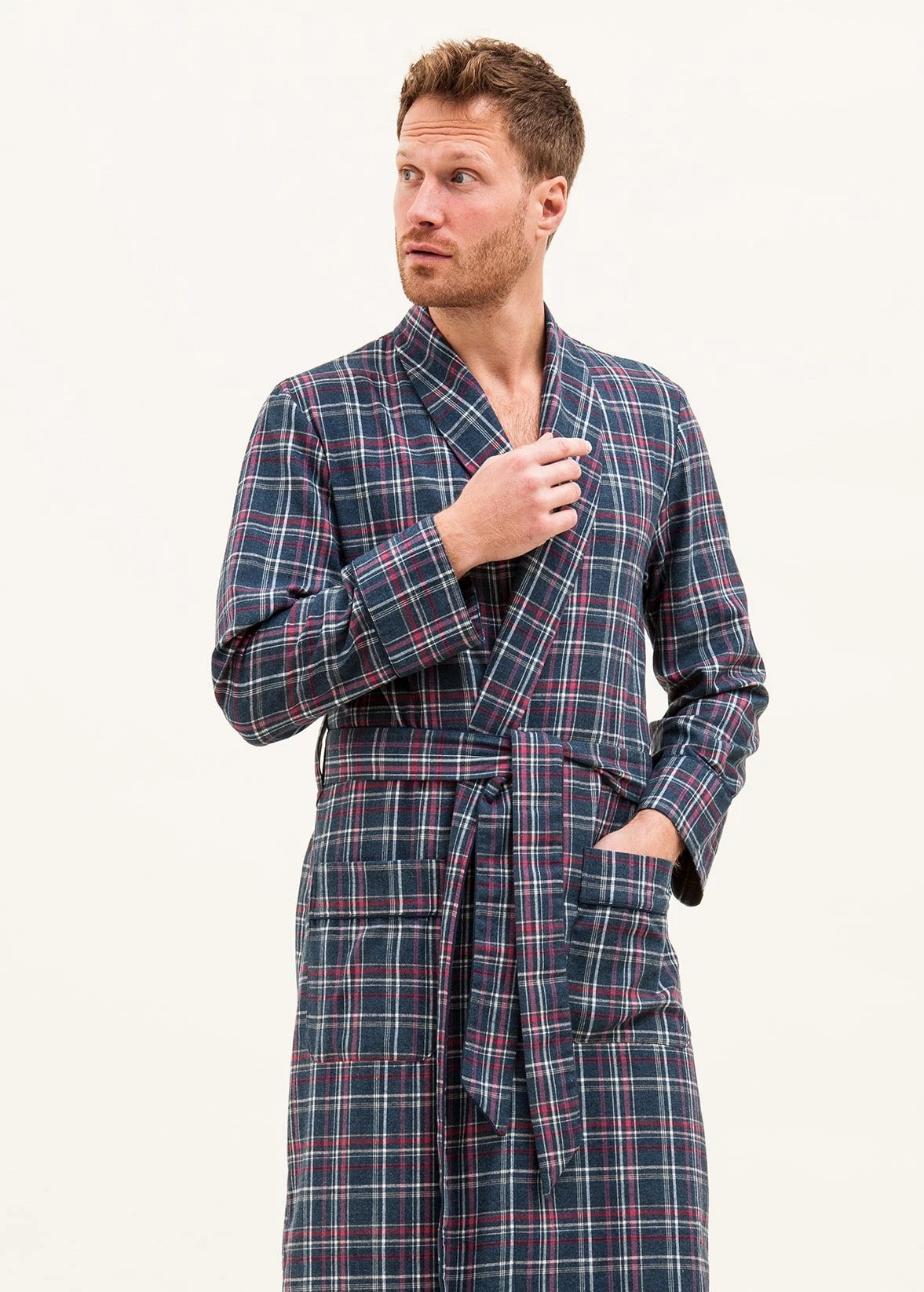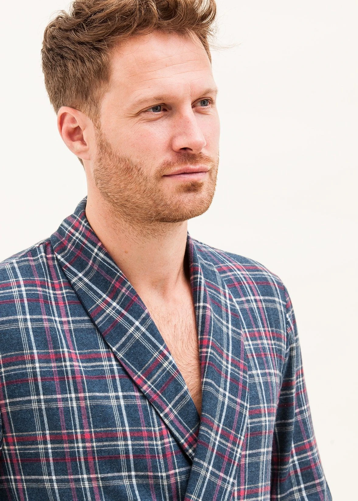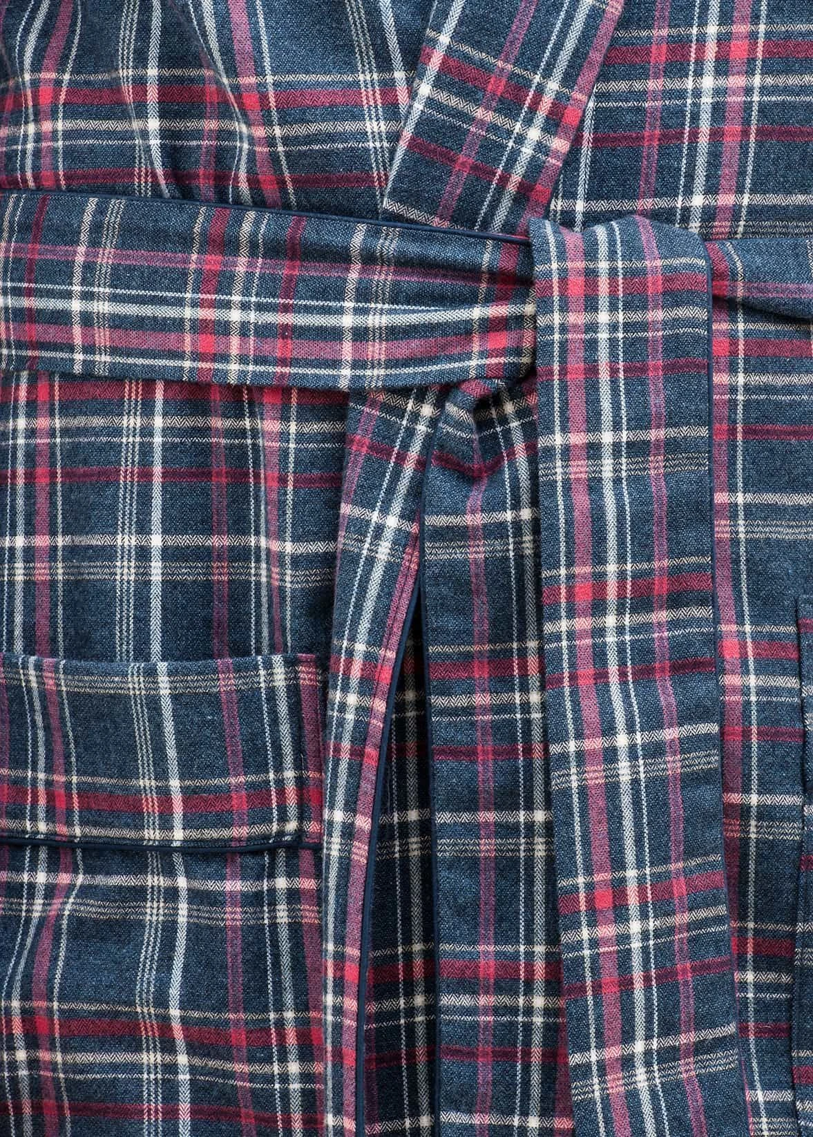 A luxury winter dressing gown in a soft cotton/wool blend. This blue and red checked gown features two side pockets, a self fabric waist tie and is finished with navy piping. Other matching items available in the men’s, women’s and children’s collections.