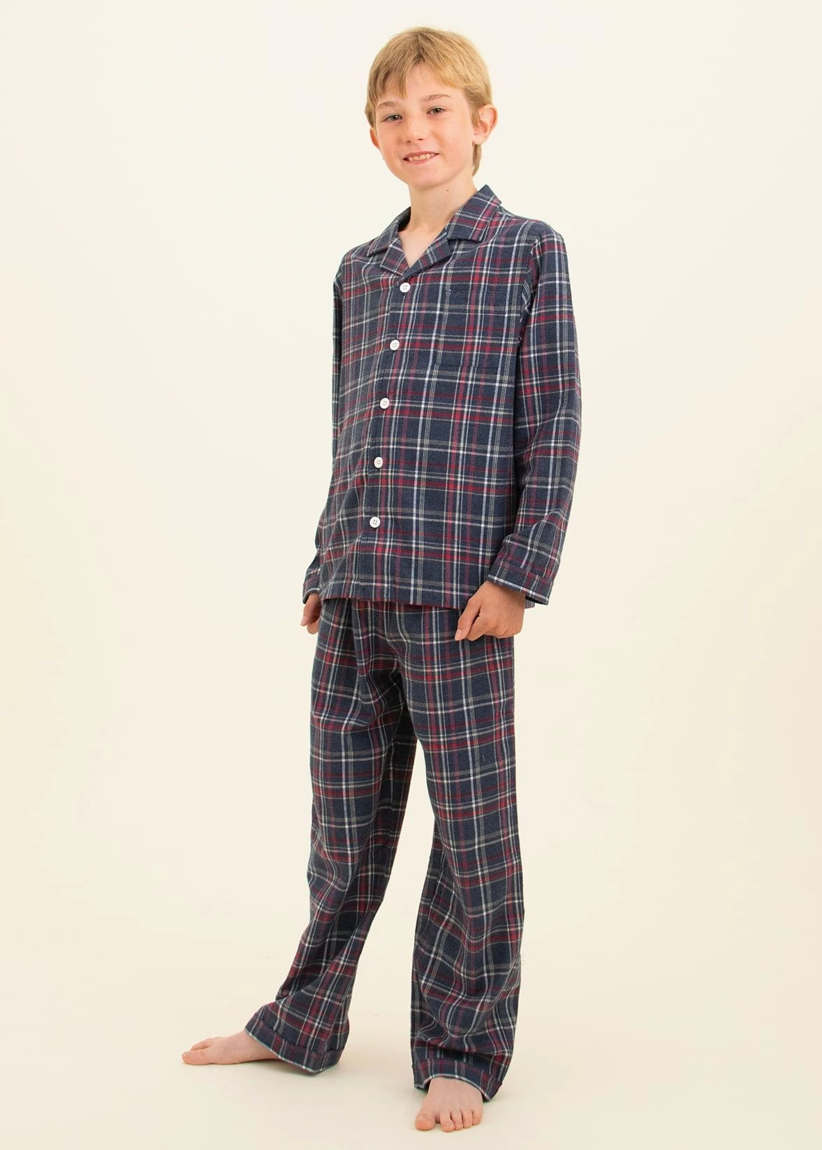 Children’s luxury pyjamas in a cosy blue and red check. This brushed cotton and wool blend is buttoned traditionally for boys but would be suitable for girls too. If you’re after matching family pyjamas, you’ll find this fabric in both the men’s and women’s collections.
